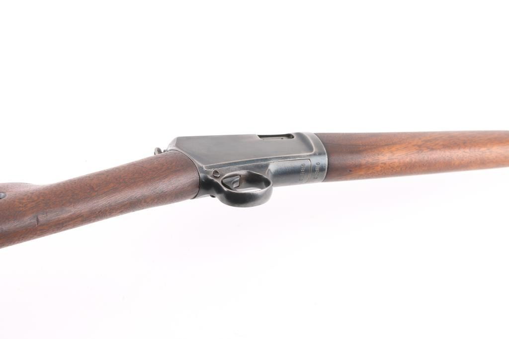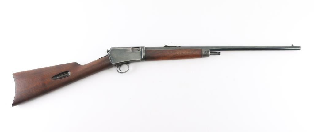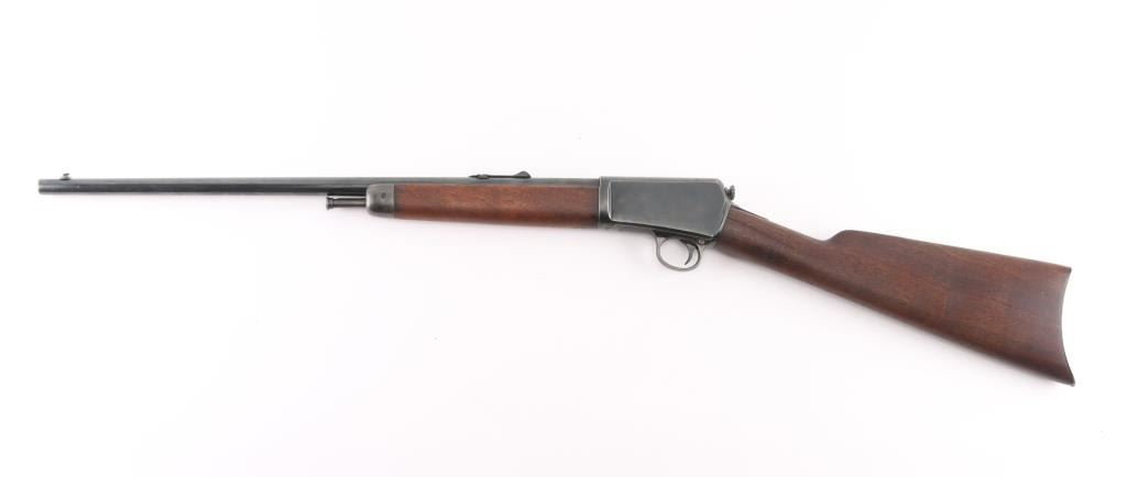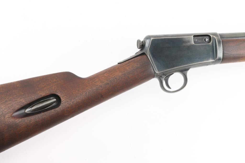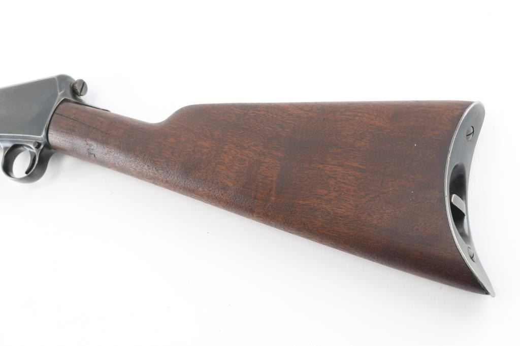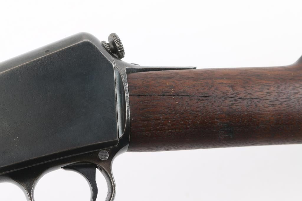 Vintage semiautomatic rimfire rifle manufactured circa 1918. Features 20" barrel, blade front & adjustable rear sights, pushbutton safety, tube magazine in butt stock, semi crescent butt plate, takedown screw at receiver rear. Charging handle in forearm. Bore is very good condition, mostly bright. Has a old re-blued finish with scattered light pin-prick pitting under the blue on the receiver. re-blue is about 90% with handling/edge wear. Numbers match on receiver and trigger housing. Wood is very good condition. Condition is NRA Good, Re-Blued. C&R Firearm