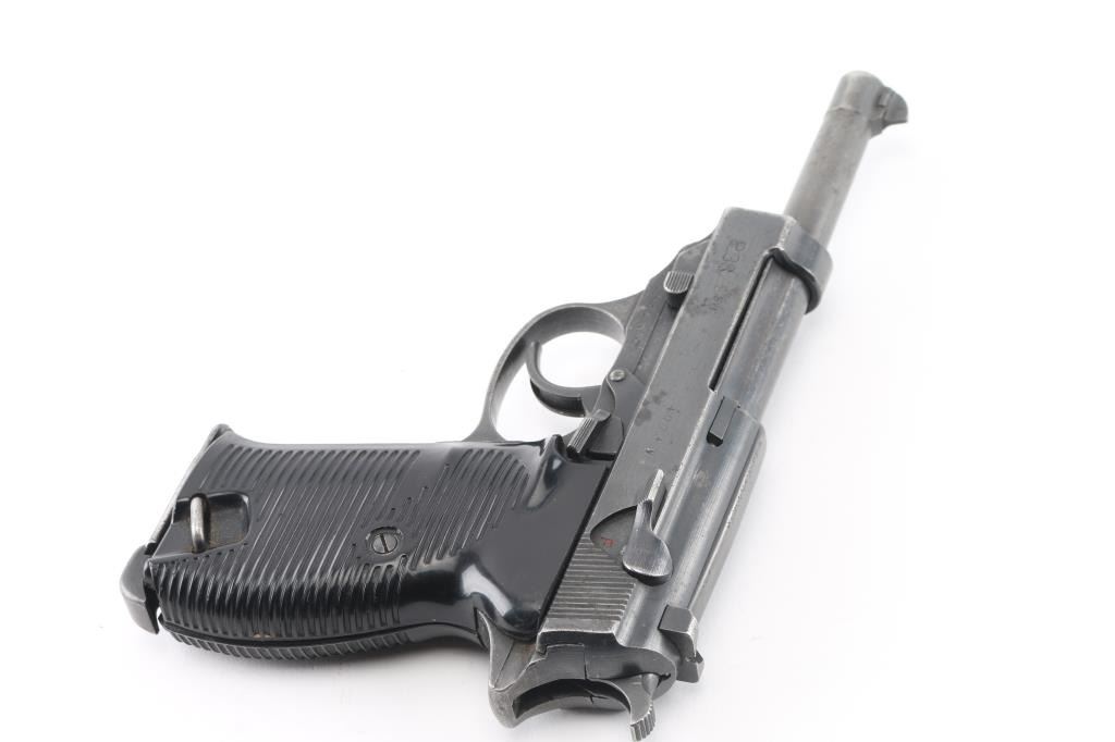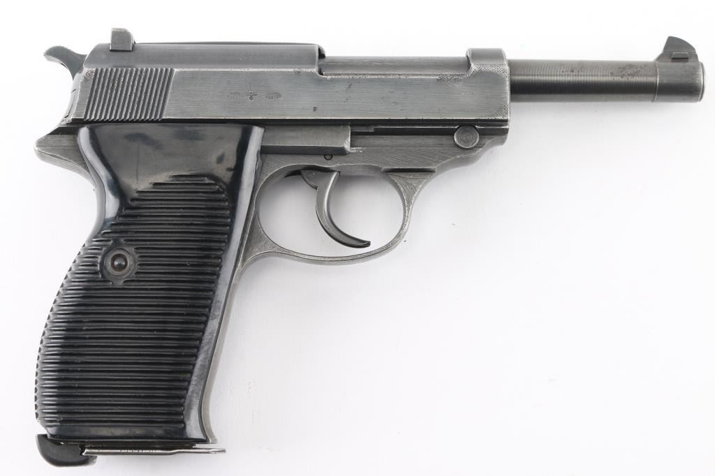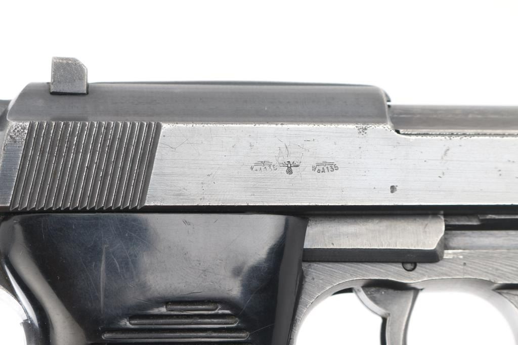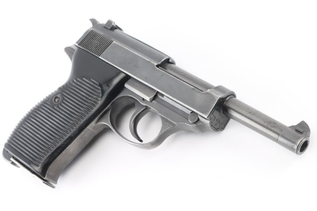 German WWII issue military semiautomatic pistol, circa Aug 1944. Features blued finish, 4.9" barrel, dovetailed blade front sight, notch rear sight, slide mounted decocking safety, heel magazine release, grooved black plastic grips. Bore is very good. Retains 85% finish with fading and thinning, edge losses, scattered areas of light patina. Thinning and losses to some markings. Grips are very good, show small scratches and signs of handling. Numbers match on frame, slide, barrel. Waffenamt 135 on frame & slide. Magazine is good condition, 'jvd' marked. Condition is NRA Very Good *** C&R Firearm ***