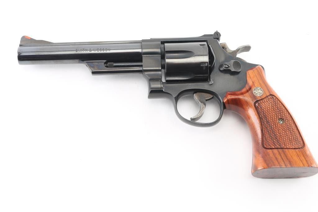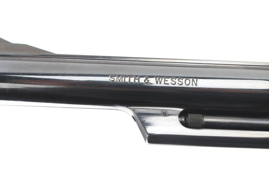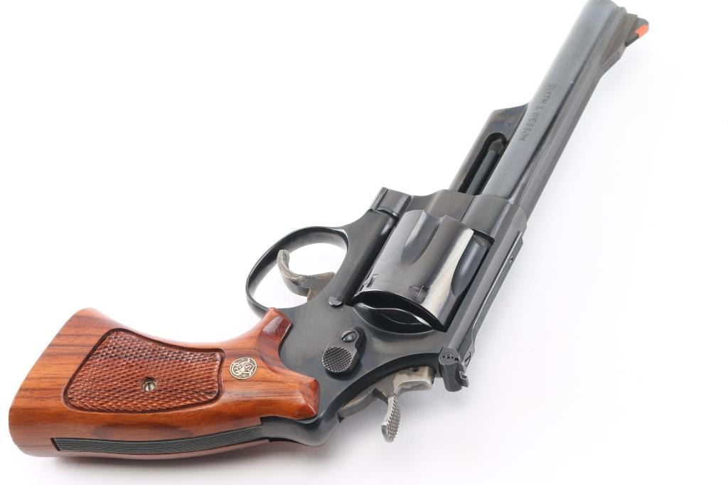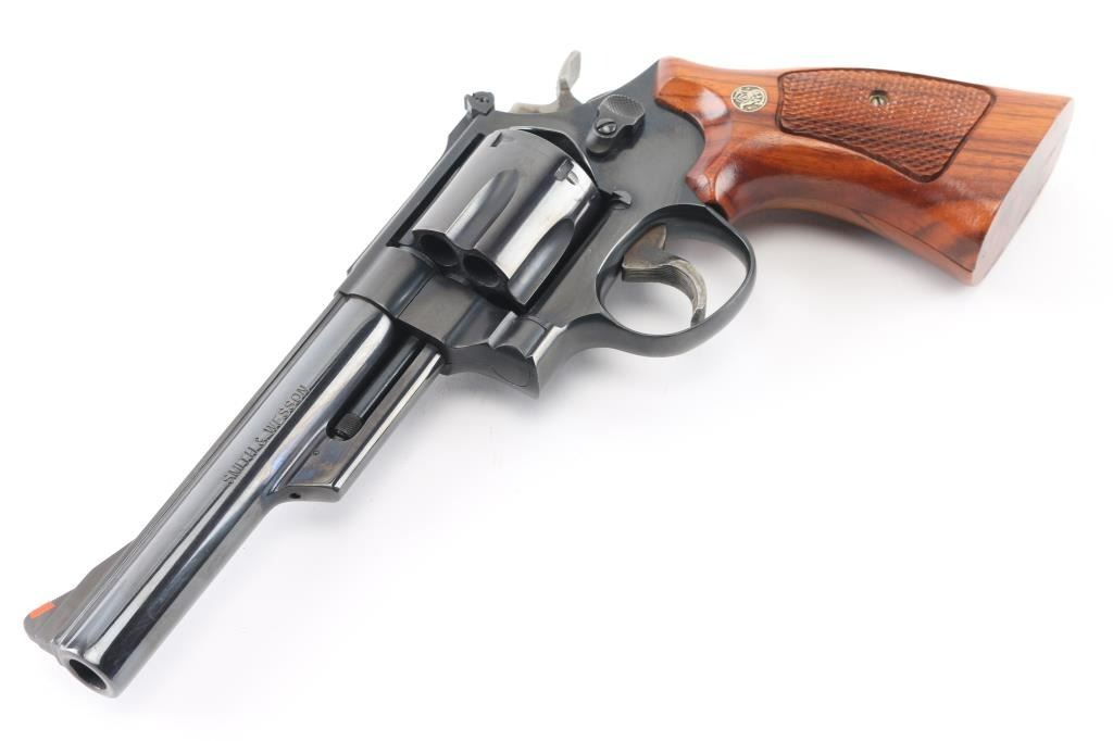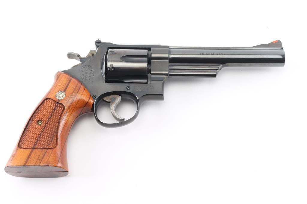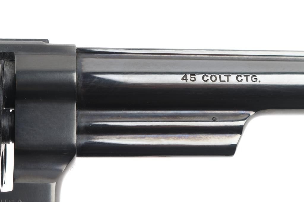 'The 1955 Model .45 Target Heavy Barrel' Large frame double action revolver chambered in .45 Colt, manufactured circa 1988. Features a blued finish, 6" heavy barrel with partially serrated wide sighting rib, raised ramp front sight with orange insert, adjustable micrometer click rear sight with white outline, fluted six-shot cylinder, shrouded ejector rod, serrated .400" target trigger, knurled .500 target hammer, three screw square butt N target frame and two-piece checkered walnut target grips with S&W medallions. Bore and charge holes are very good condition. Retains 95% finish with few blemishes, cylinder drag line, very slight raised edges at top of sideplate from improper removal. Grips are very good. Action is smooth with tight lock-up. Condition is near NRA Excellent *** Modern Firearm ***