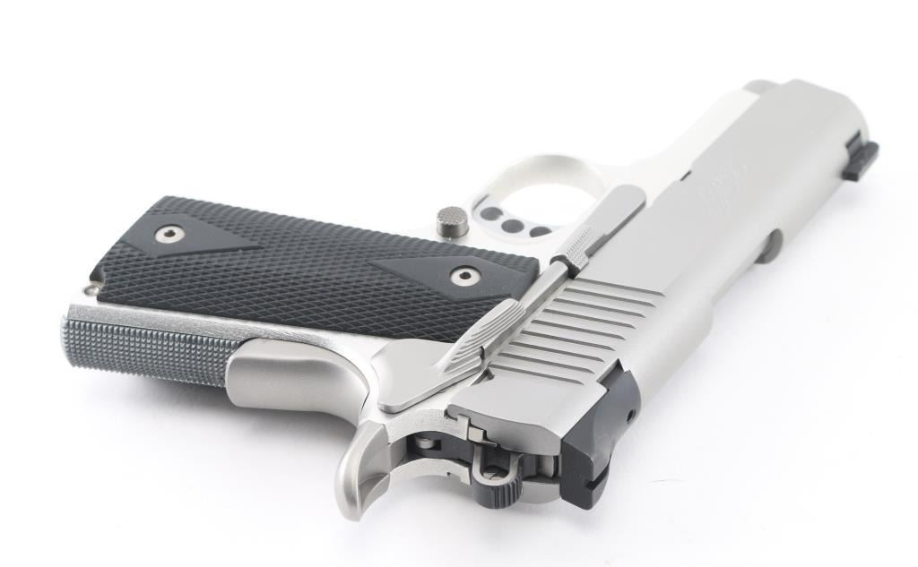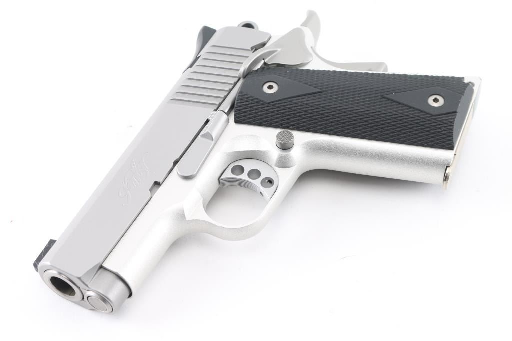 High quality 1911A1 style single action semi-automatic compact pistol chambered in .45 Auto. Features a matte finished stainless steel slide with satin finished alloy frame, black rubber double diamond checkered grips, bushing-less 3" stainless steel barrel, full-length guide rod, dovetailed no dot sights, serrated, skeletonized trigger, skeletonized hammer with serrated spur, thumb safety on left side of frame, grip safety, push button magazine release, and knurled flat mainspring housing. Comes with one 6 round magazine. Bore looks great, a little dusty. Metal finish looks great. Grips are fine. Gun looks like new. Condition is NRA Excellent. *Modern Firearm*
