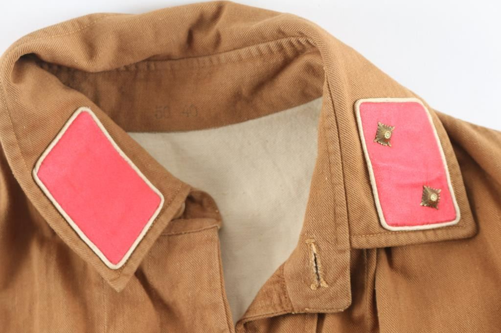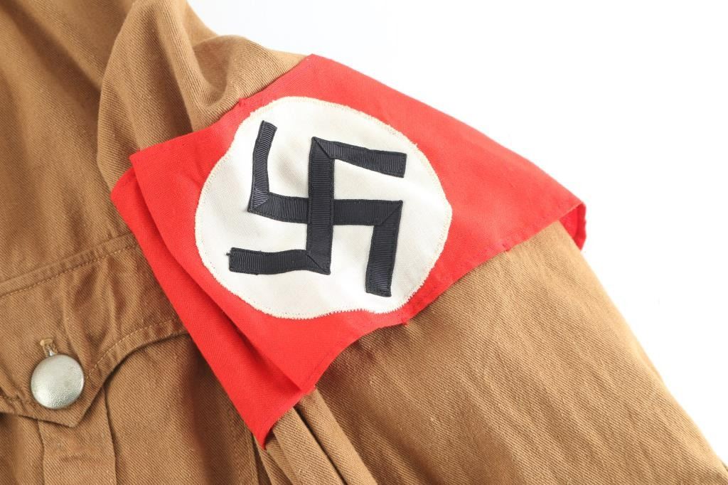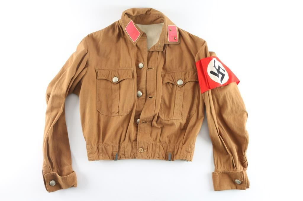 Original Third Reich SA Brown Shirt (Storm Troopers) in the rank of SA Truppfuhrer (Sergeant) of SA Gruppe Sudmark. Correct silver toned button, buttons are RZM marked. Belt keepers are sewn in place. Sewn on multi piece construction NSDAP armband with RZM tag attached. 100% original, in excellent condition, no tears, or moth nips.