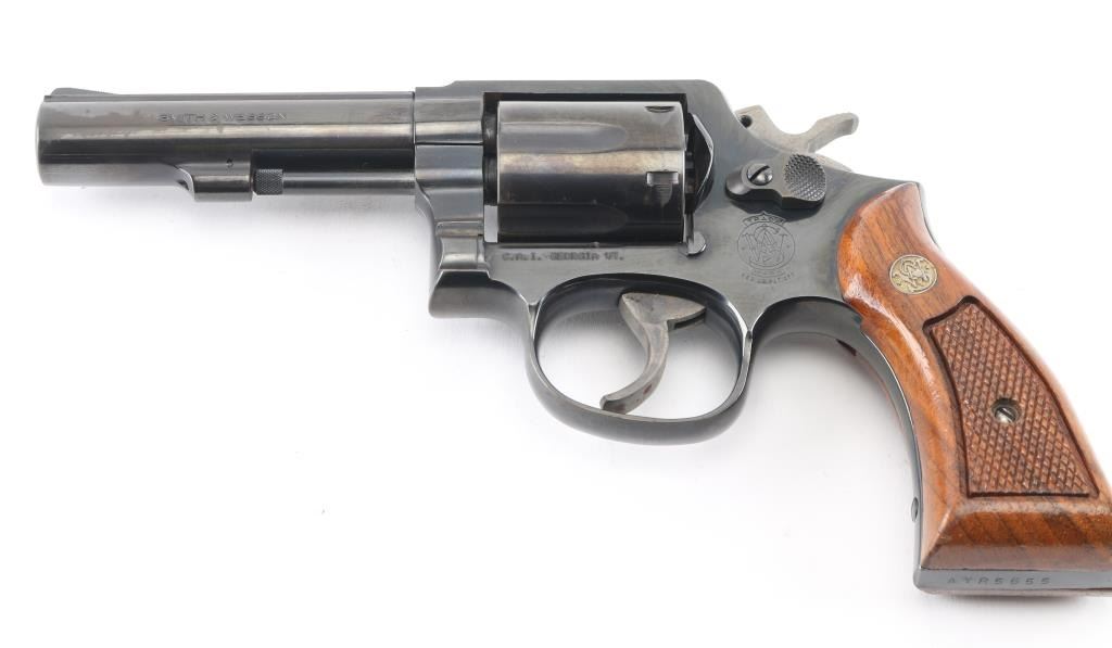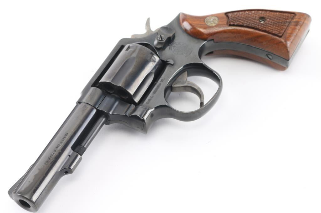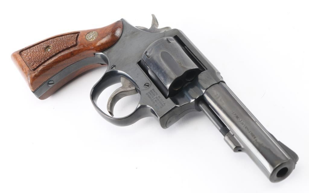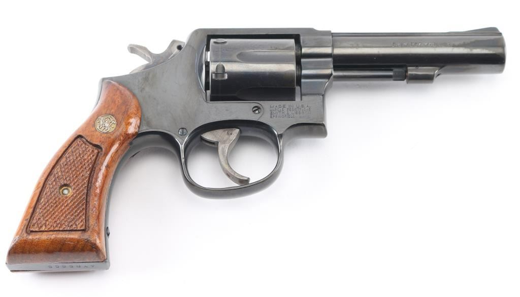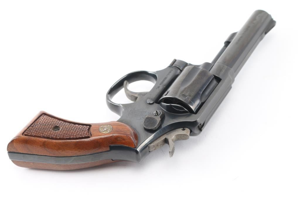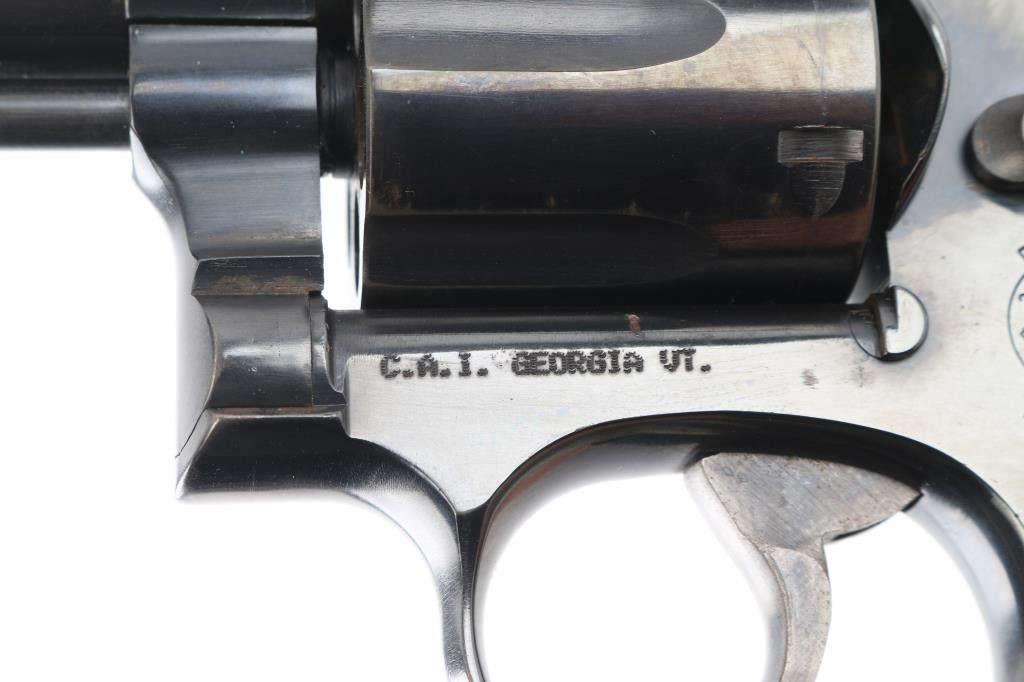 'Military & Police Heavy Barrel' Medium frame double-action revolver chambered in .357 Magnum. Re-imported by CAI, Georgia VT. Features a bright blued finish, pinned 4 1/8" heavy barrel with solid top rib, non-shrouded ejector rod, ramped front sight, square notched rear sight, recessed & fluted six-shot cylinder, smooth case hardened trigger, knurled hammer spur, and S&W medallion two-piece checkered walnut Magna grips. Bore looks good, dusty. Metal finish is good with a loss of finish on both sides of the barrel at the muzzle, about an inch long with a slight loss on the right side as well. Drag line on the cylinder. Grips look good. Condition is NRA Good *Modern Firearm*
