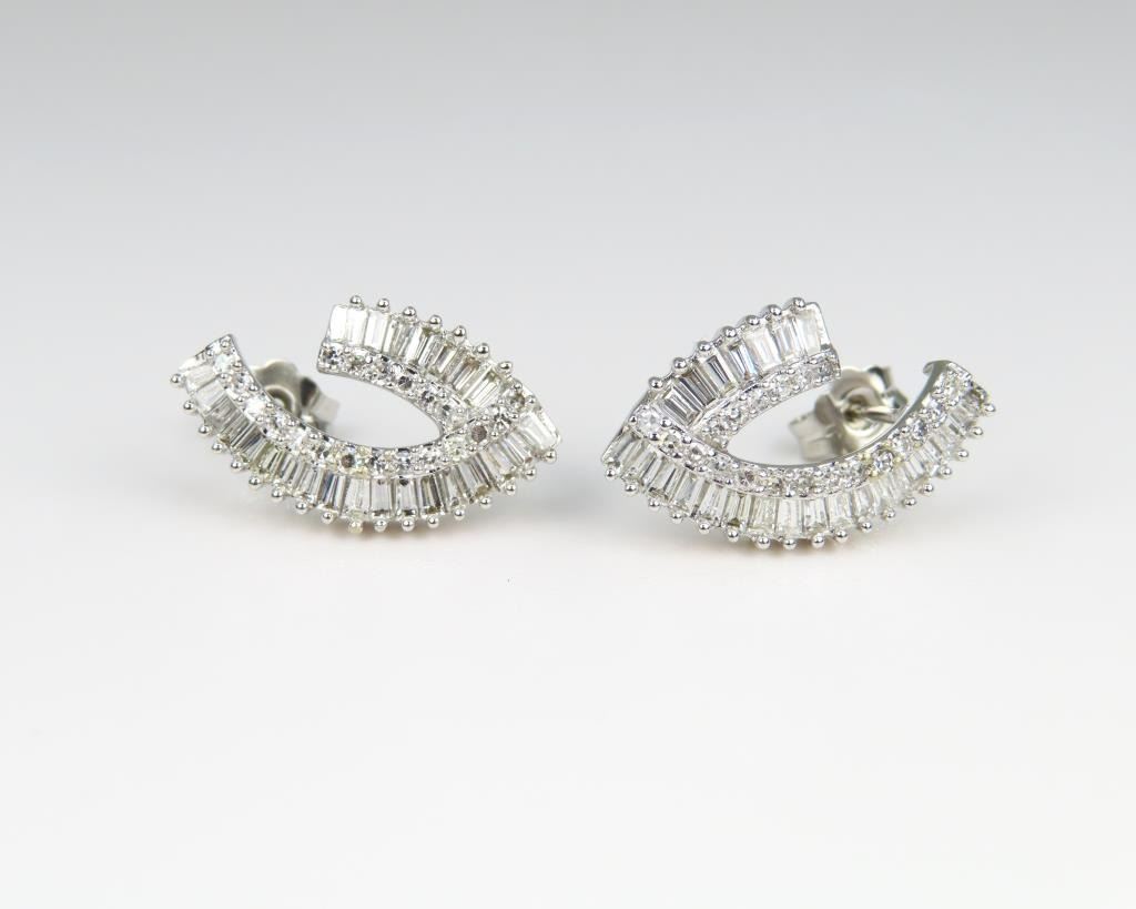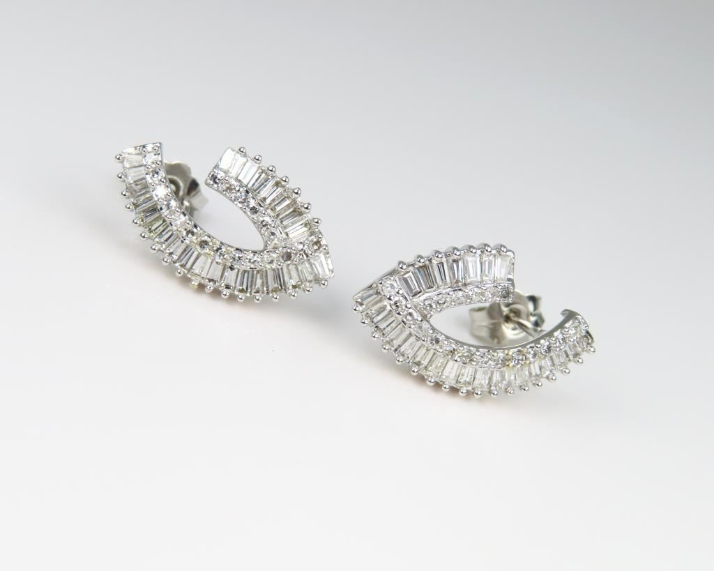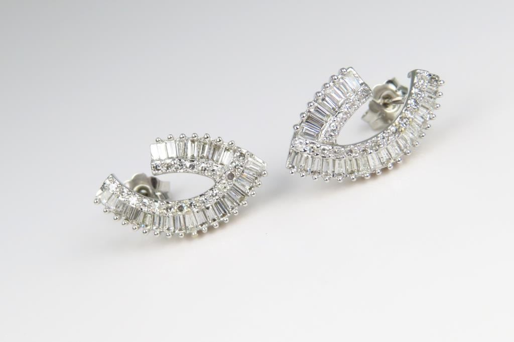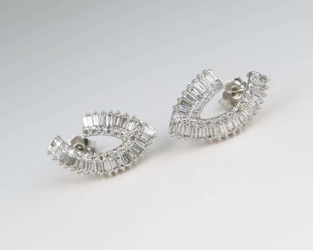 Earrings featuring 90 baguette and round Diamonds weighing approx. 2.00 carats total with F-G colors and VS clarity set in hallmarked contemporary style 14 karat white gold settings. Retail $5,000-$6,000