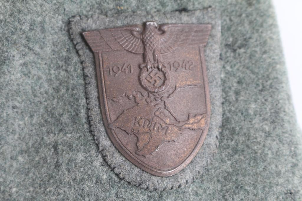 Original German WW2 issued M36 Feldbluse for a Panzer Grenadier Obergefreiter (Corporal). Rank insignia on left sleeve, with the Krim Shield above it (Military decoration awarded to those under Von Manstein who captured the Crimea region from the Red Army in 1941-42) The Romanian Crusade against Communism ribbon is sewn in the second button hole. Bevo Heer eagle, dark green badge cloth collar with machine sewn collar tabs, dark green shoulder boards with pink piping. green painted pebbled buttons. The second button is hanging by a thread, held by safety pin. Correct 3 holes for belt keepers, bandage pouch inside, rayon lining with faint ink stamps. Has some moth nips, nothing serious, does not detract. All 100% original. Did pass the black light test.
