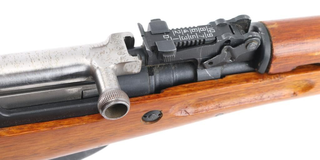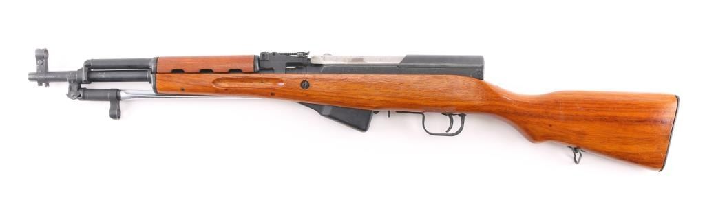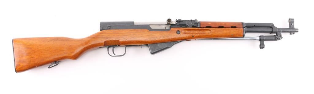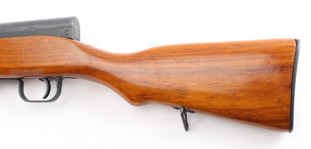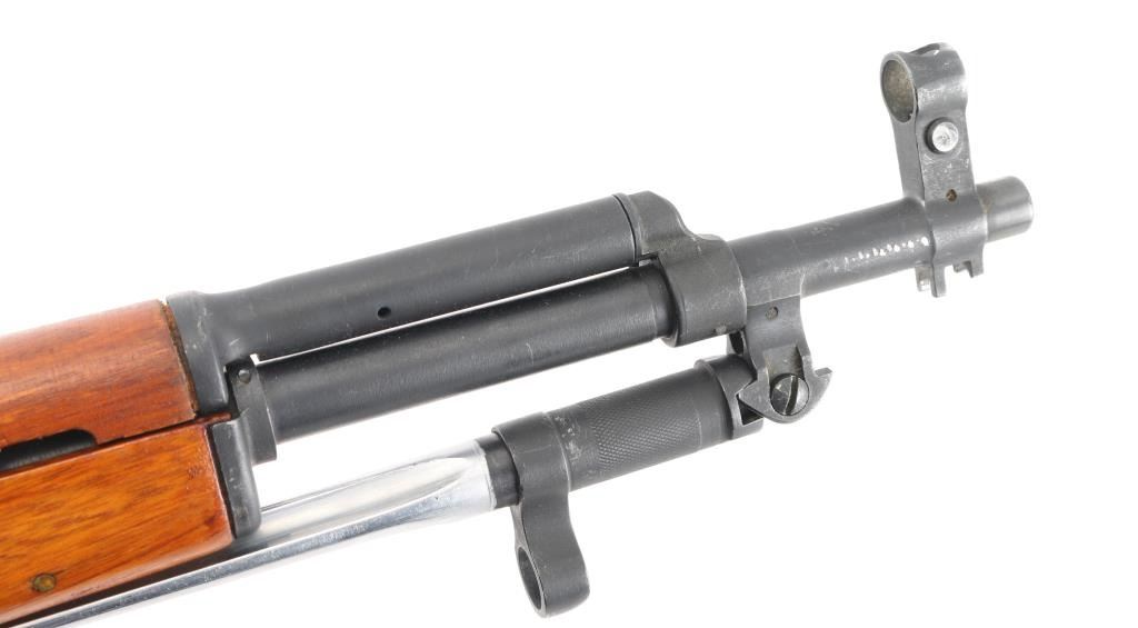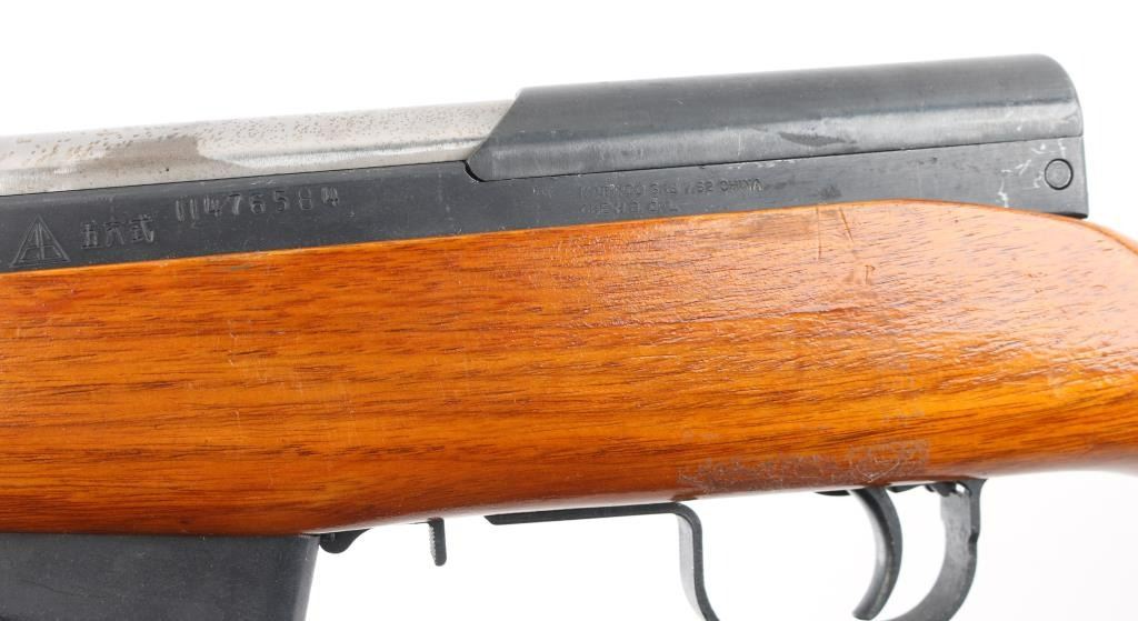 Sn: 11476584 Chinese semiautomatic rifle, imported by GBE, HB CA. Factory "66" marked, importer stamped "NORINCO". Features approx 16.5" barrel, folding spike bayonet, provision for cleaning rod under barrel (rod missing), protected post front & tangent rear sights, fixed 10 round magazine with hinged floorplate, manual safety, sling swivels. Stamped triggerguard, threaded barrel. Bore is excellent condition. Metal retains 90% dark even bluing, some scrapes and scuffs. Stock is very good condition with some small dents & scratches. Most observed numbers match (bolt mismatched). Condition is NRA Very Good++ *** Modern Firearm ***
