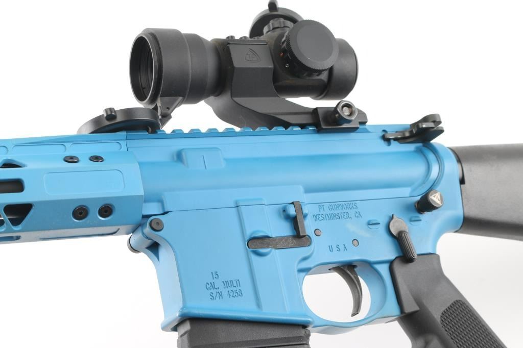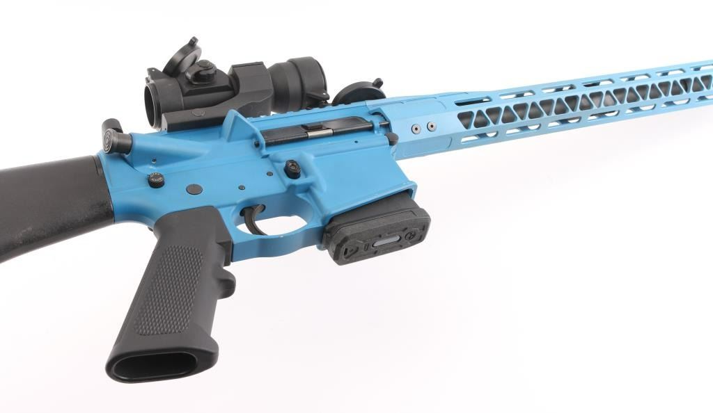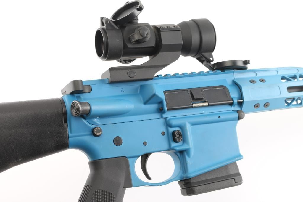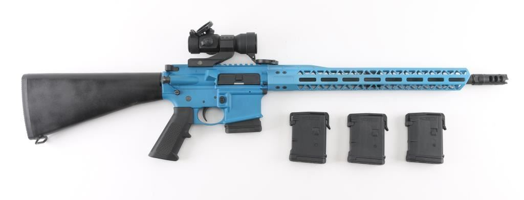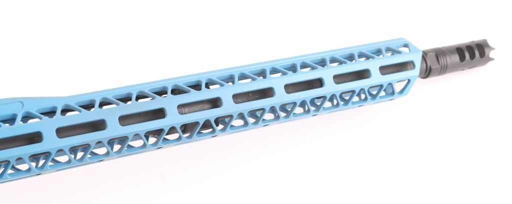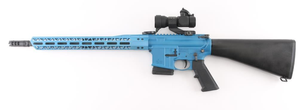 Semiautomatic target rifle in Smurf Blue. Features 16" barrel, muzzle brake, black polymer fixed A2 stock and A2 pistol grip, free float M-Lock handguard, flat top upper with Picatinny rail, chrome plated bolt & carrier, forward assist, ejection port cover. Bolt hold open replaced with a mag latch denial bar, mags can be inserted but not removed while receiver halves are together. Juggernaut Tactical Hellfighter rear pin is spring loaded, push to open receiver halves just enough to allow the mag release button to clear the denial bar, and allow magazine removal. Selectable red/blue/green dot optic (dot in circle reticle) mounted using a Trinity Force cantilever mount. Upper, Lower, and handguard are finished in Smurf Blue. Bore is very good. Minor scuffs and handling marks. Includes (4) Magpul 10 round polymer mags, black nylon zipper case. Condition is near NRA Excellent *** Modern Firearm ***