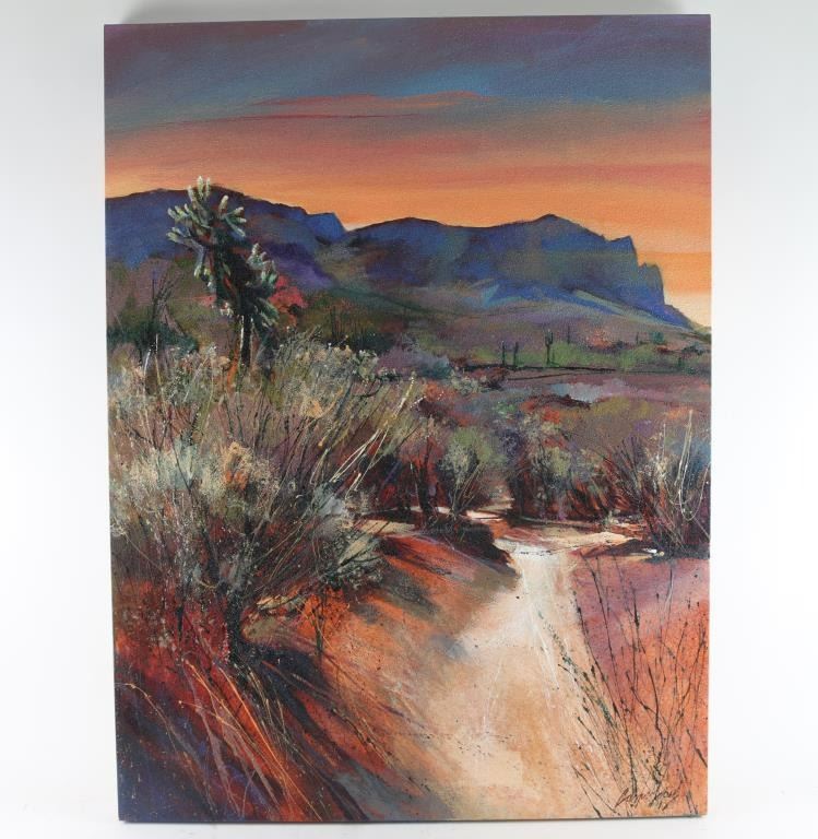 Depicting Arizona sunset and landscape ,Done by local AZ Artist "Carlos Lopez" signed lower right. Beautiful piece, measuring 42"x30".