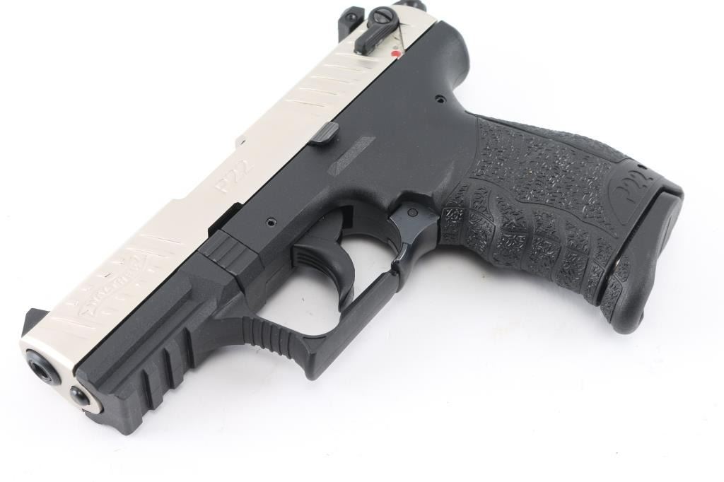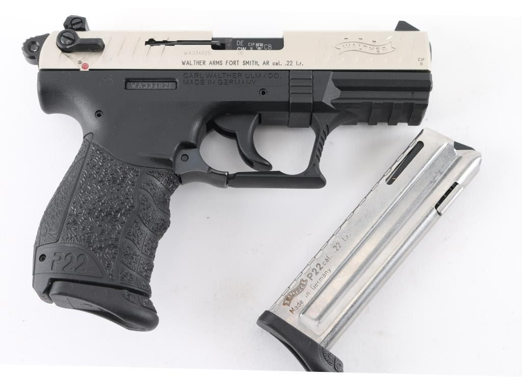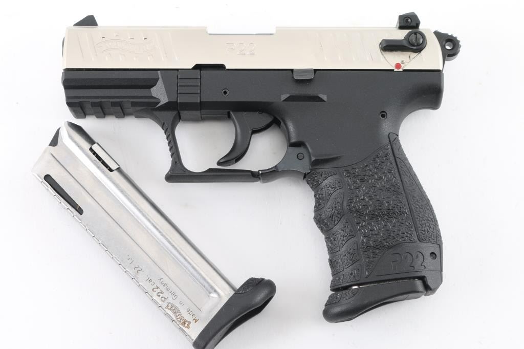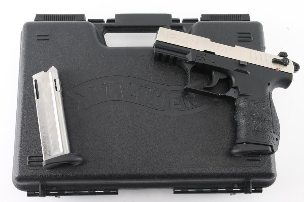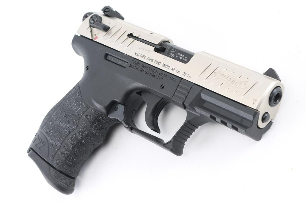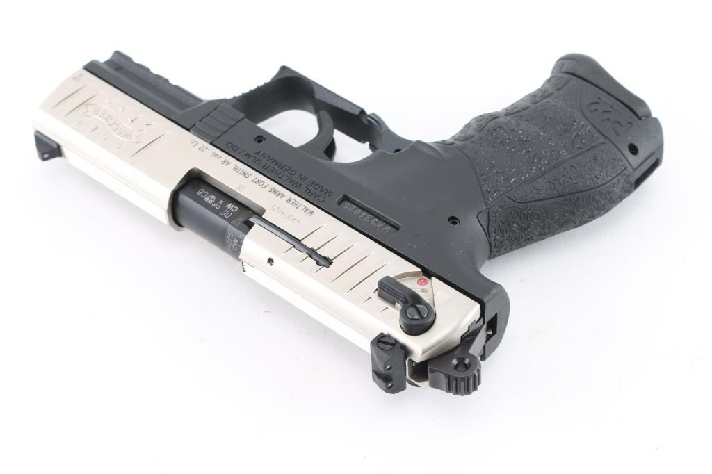 German semiautomatic rimfire pistol imported Walther Arms, Fort Smith, AR. Features nickel metal finished slide, textured black polymer frame with accessory rail & replaceable backstrap inserts, 3.8" barrel, 3 dot sights (fixed front, windage adjustable rear), ambidextrous magazine release, ambidextrous slide mounted manual safety,. Bore is excellent. Overall external condition is excellent. Includes (2) magazines, lock, manual, tools, factory hard plastic case. Condition is NRA Perfect in box. Modern Firearm.