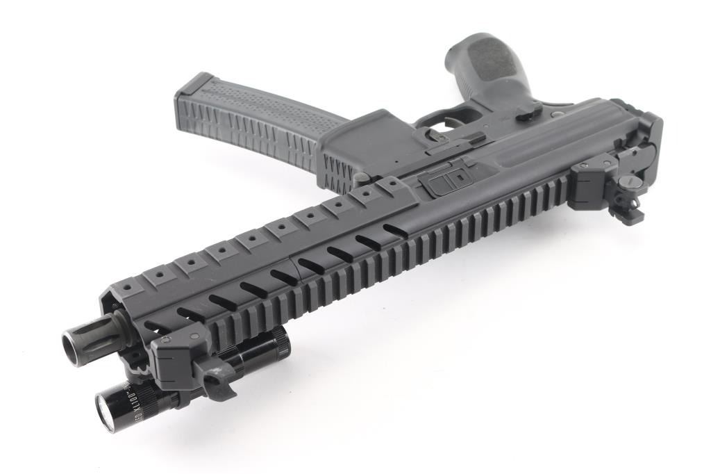 Semiautomatic pistol features matte black finish, black polymer grip, 8" barrel, flash hider, alloy flip-up adjustable sights, ambidextrous controls (safety, bolt hold open, magazine release), pistol driven gas system, ejection port door, accessory rail on top of receiver, on 4 sides of handguard. Back of receiver has rail section for attaching sling mount or similar accessory. Bore is pristine. Externally in near excellent condition, several small areas show scuffing. Includes tactical light with detachable rail mount, two magazines (polymer body with steel lips). Condition is near NRA Excellent *** Modern Firearm ***