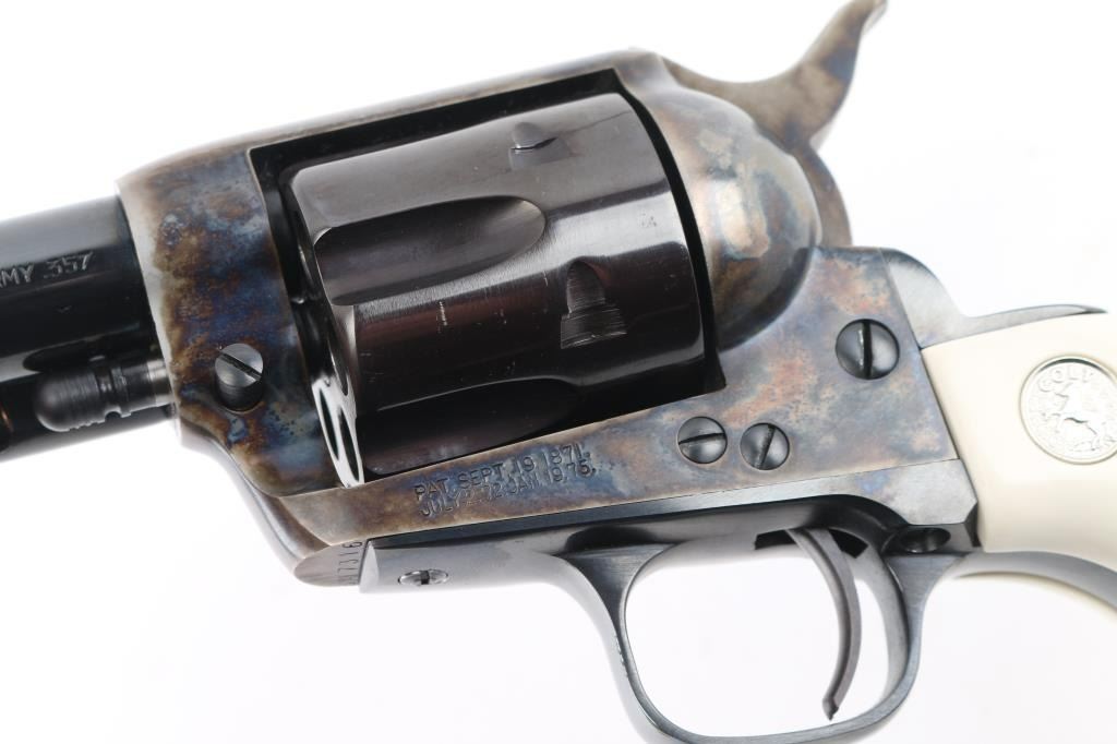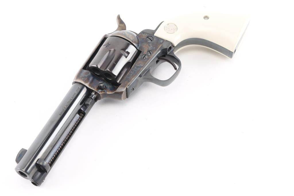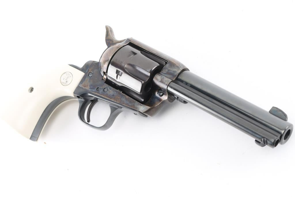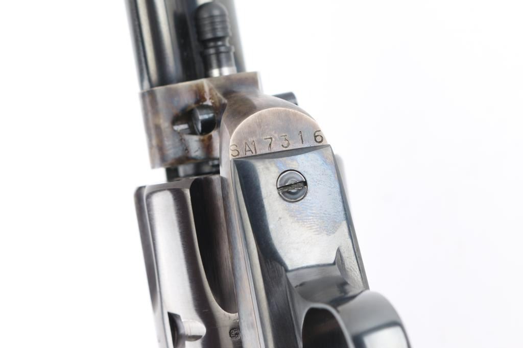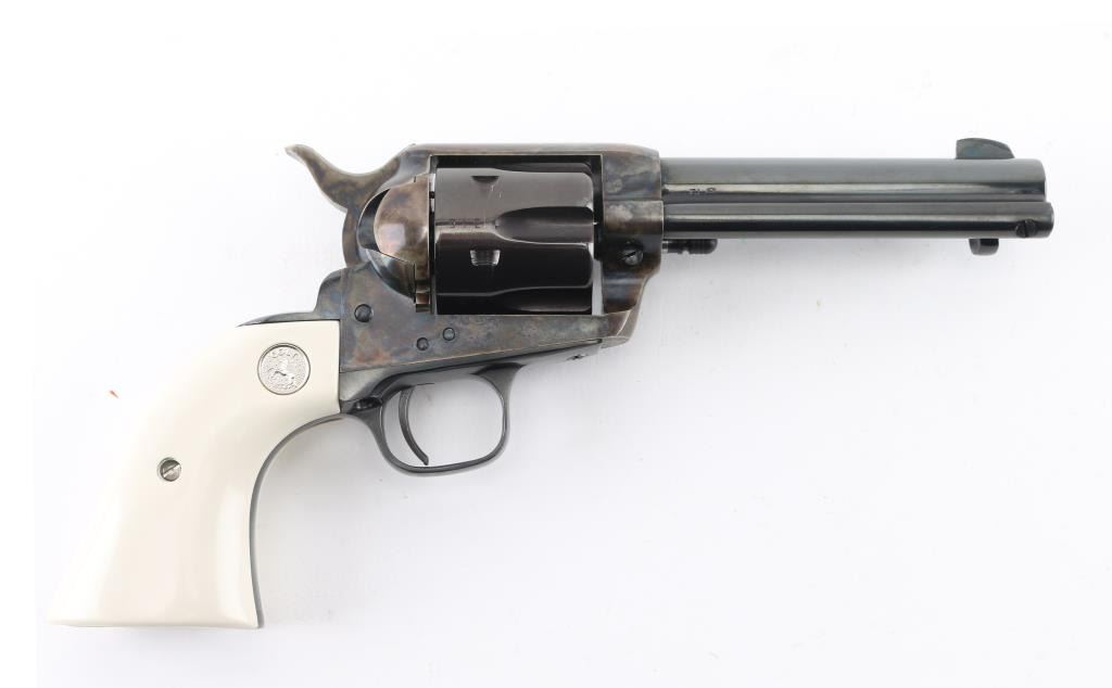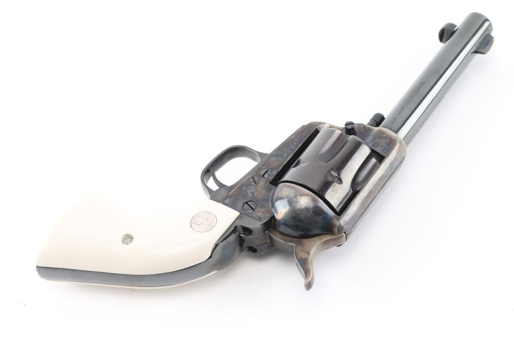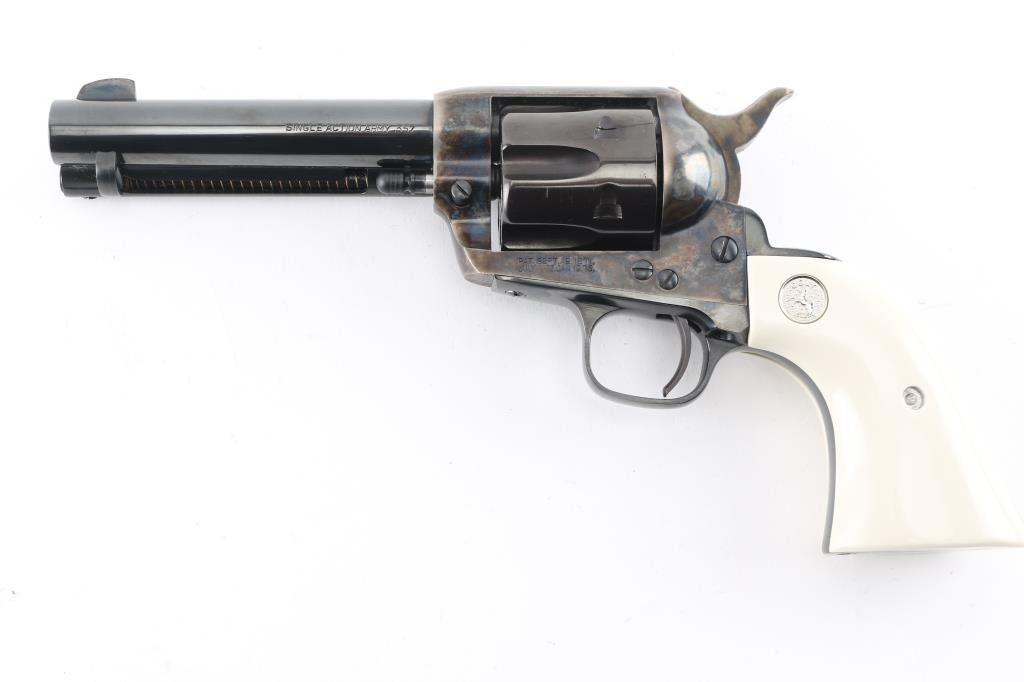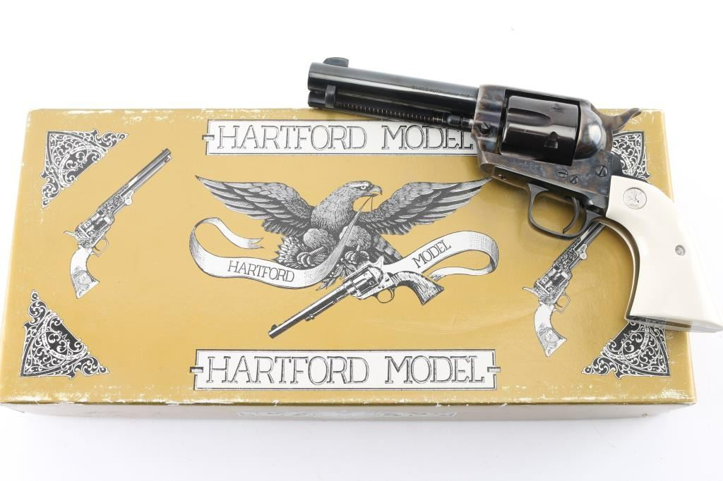 Revolver. Single-Action. 6-rd capacity. Italian made copy of the Colt SAA. 4.5" barrel with blade/notch sights. Imported by CAI. Blued cylinder, barrel, triggerguard, and back strap. Case-hardened receiver, and hammer. Colt patent dates on left frame. Top of barrel marked "Hartford Ct Model" Underside marked "ASM ITALY*EMF S.A." CAI" Italian proofs. Matching sn on cylinder. Bore is excellent/bright Cylinders are very good. Indexes properly, locks up tight. Faux ivory white plastic grips with "Rampant Colt' medallions are excellent. Metal finish is excellent. Comes in original factory box with black checkered 'American Eagle, Rampant Colt' hard rubber grips. NOTE* Consecutive serial number SA17317 is in this action. NRA Condition-Perfect in Box. Modern Firearm.
