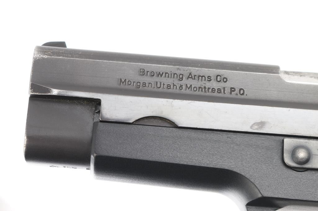 SN: 395RR2412 'Made in W Germany' Semiautomatic pistol, imported by Browning, Morgan UT. Dated 1977. Features matte black alloy frame, blued slide, 4.25" barrel, white dot front sight, dovetailed rear sight with white bar under sighting notch, frame mounted decocking lever, double/single action, heel magazine release, checkered black plastic grips, lanyard ring on left side of grip frame. Missing bottom grip screw on both sides. Bore is very good. Retains 85% finish with edge losses, signs of duty use. Grips are very good. Includes (1) magazine. Condition is NRA Very Good *** Modern Firearm ***