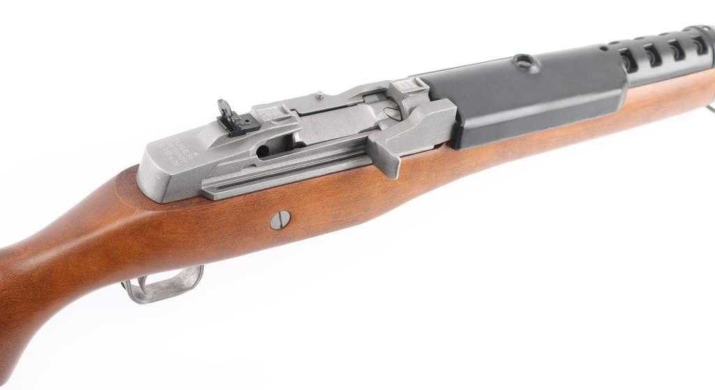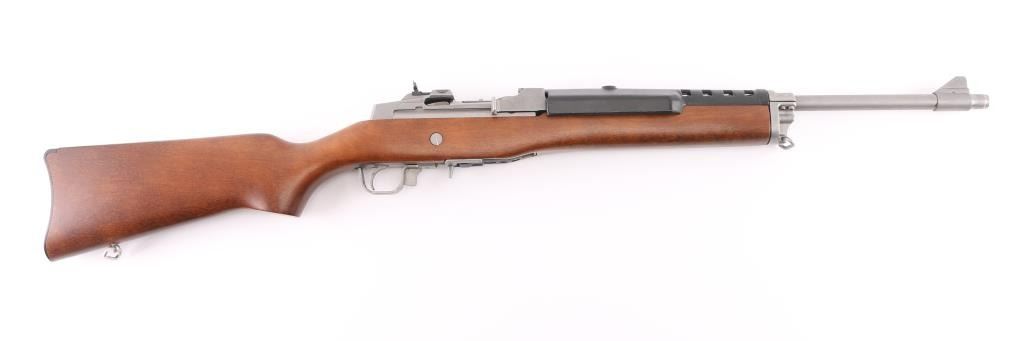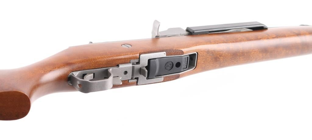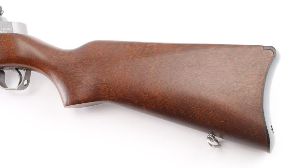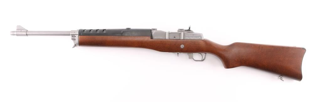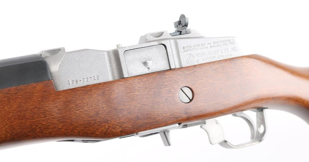 Semiautomatic rifle features stainless steel construction, smooth wood stock, black polymer handguard, 18" barrel, blade front sight, folding adjustable peep rear sight, manual safety, sling swivels, plastic butt plate, dovetail scallop cuts on top of receiver. Bore is very good condition. Stainless steel shows few blemishes, rub spots. Stock is near perfect with few scratches. Includes (1) Ruger 5 round magazine. Condition is NRA Excellent *** Modern Firearm ***