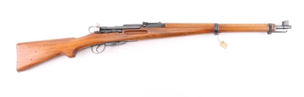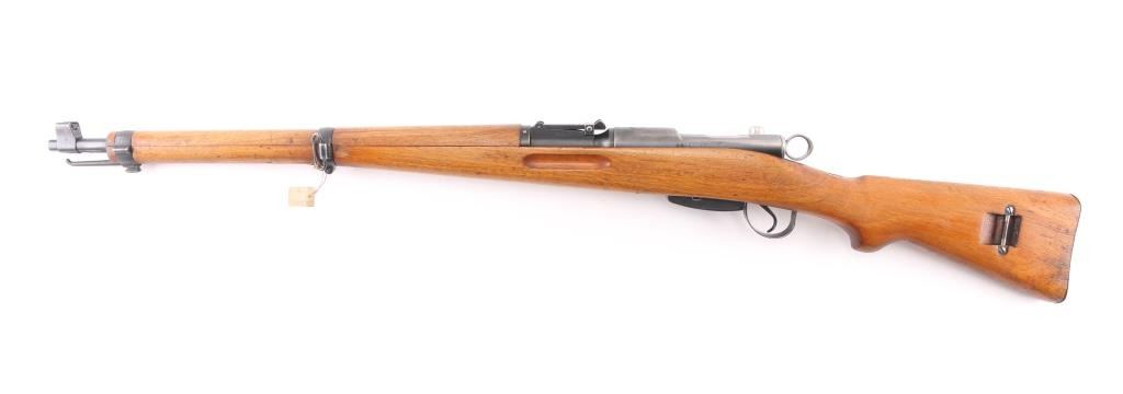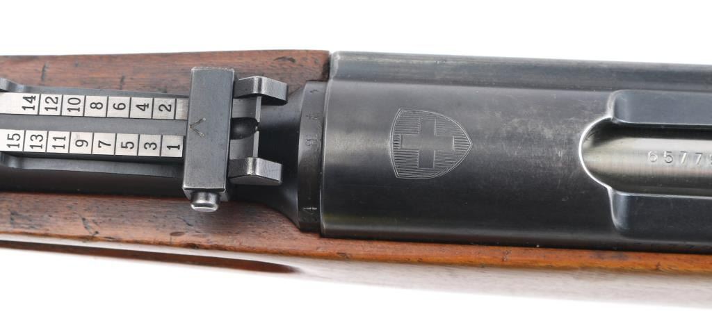 SN: S-M657794 'Schmidt–Rubin' Swiss military straight pull bolt action rifle imported by CAI, Georgia VT. Features blued finish, wood semi pistol grip stock, 25" barrel, bayonet lug, stacking hook, blade front sight inside protective ears, tangent rear sight, sling swivels, detachable magazine, manual safety, "beer barrel" shaped aluminum bolt knob. Bore is very good condition. Retains 90% coverage of blued finish, showing edge losses & handling marks. Bolt assembly is mostly bright polished, some blued pieces, overall in very good condition. Stock is very good condition, with small dents and scratches, possibly lightly sanded, thin varnish finish, staining visible near buttplate. Bolt and barrel numbered to receiver, magazine and rear band mismatched. Importer marks under barrel, importer added "S-M" prefix to serial number. Condition is NRA Very Good *** C&R Firearm ***