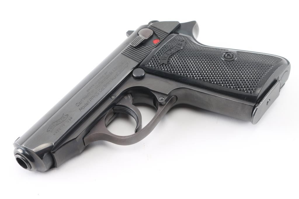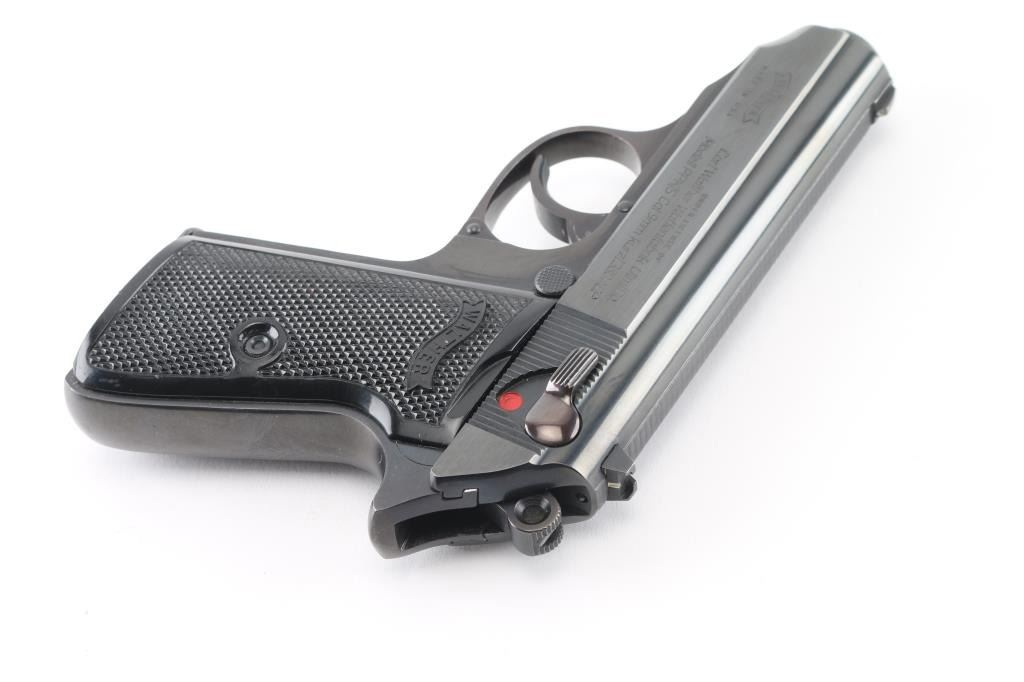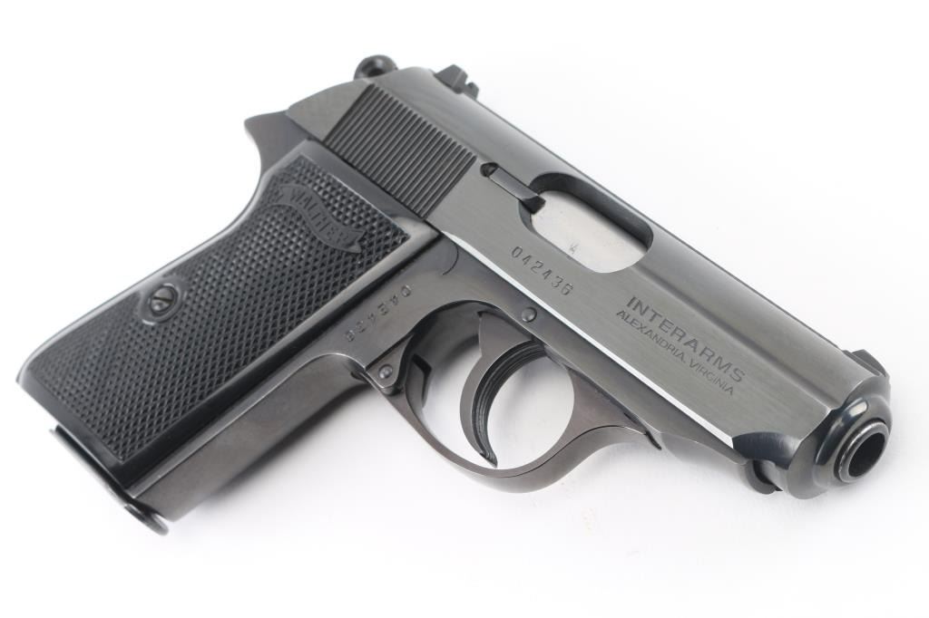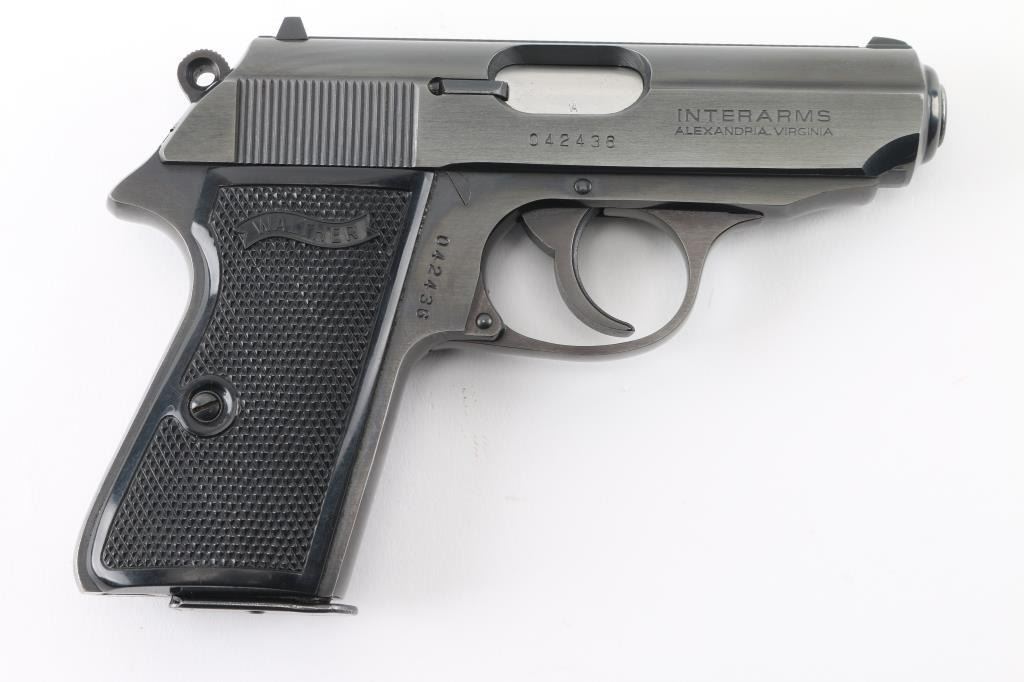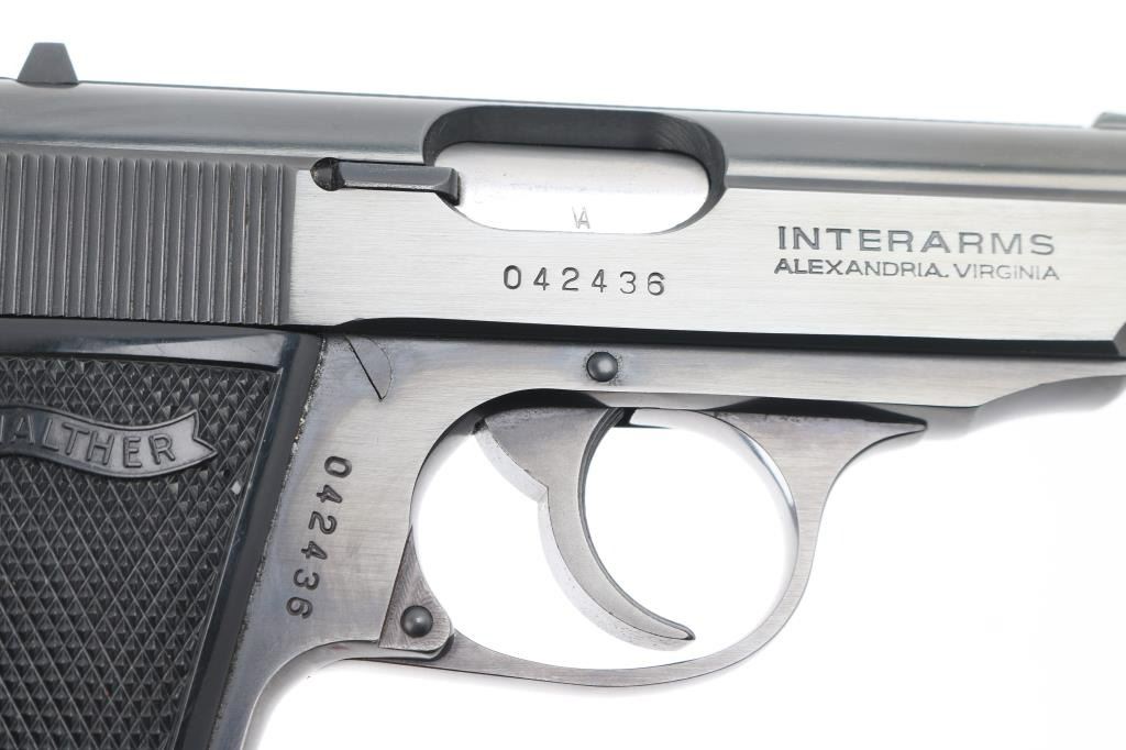 Semiautomatic compact pistol manufactured by Interarms, Alexandria VA, under license from Walther. Features blued finish, double action trigger, 3.3" barrel, fixed front sight with white dot, dovetailed rear sight with square notch & white bar, serrated trigger, serrated round hammer spur, thumb safety/decocker on the left side of the slide, loaded chamber indicator on the rear of the slide, push button magazine release, checkered black plastic "Walther Banner" grips. Bore is very good condition. Retains 95% finish with handling marks and few small scratches. Grips are very good. Includes (1) magazine. Condition is near NRA Excellent *** Modern Firearm ***