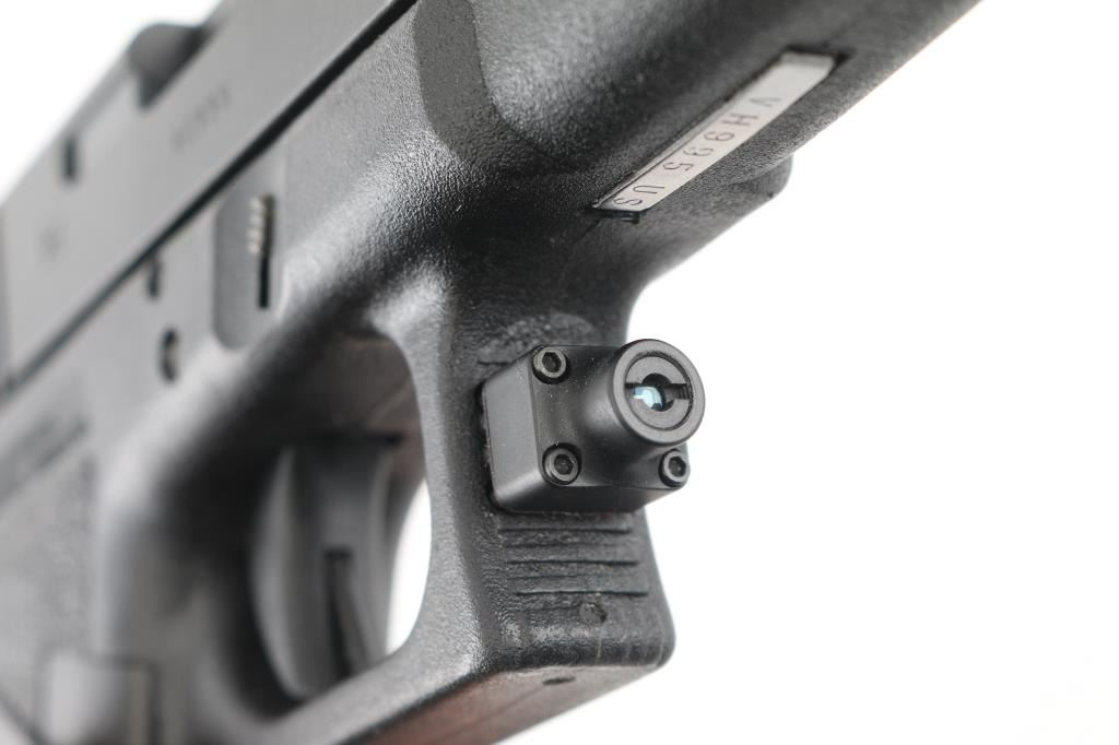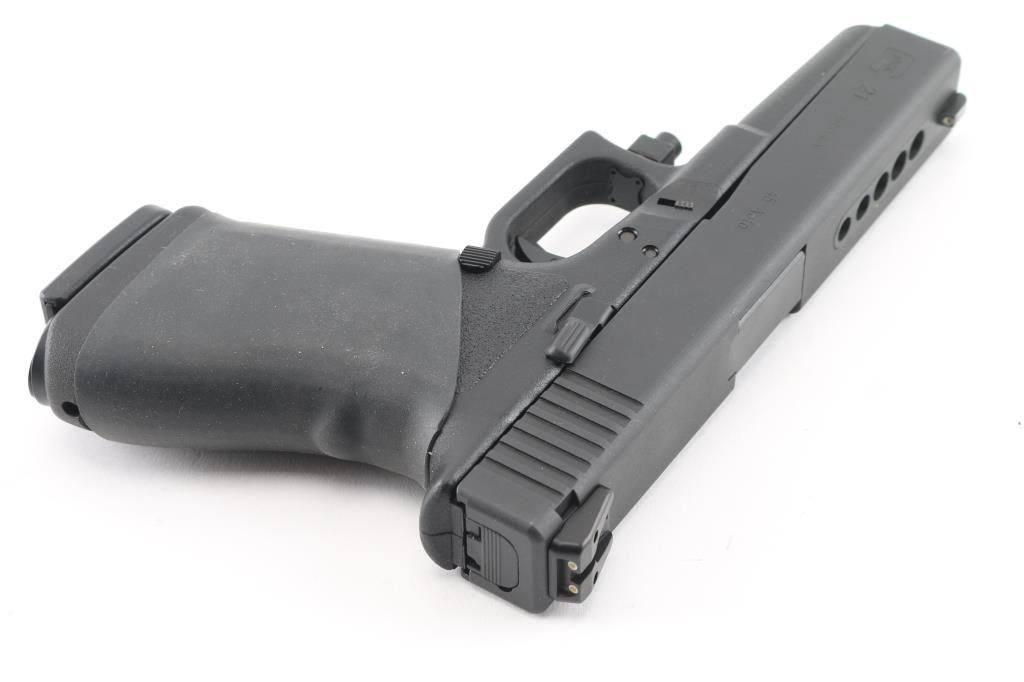 "Aro-Tek Custom" Austrian semiautomatic pistol, imported by Glock Inc, Smyrna GA. Ported barrel rib fits slot cut in top of slide. Features approx 4.4" barrel, fixed front & dovetailed rear 3 dot night sights, striker fired, manual safety in trigger, extended slide stop, rubber slip-on grip sleeve, laser in front of triggerguard (battery compartment in butt). All black finish. Night sights have barely any remaining glow. Bore is excellent condition. Overall external condition is like new, with some evidence of handling and use. Laser not tested, batteries need replaced. Includes original factory 'Tupperware' case & black kydex belt holster. Condition is NRA Excellent *** Modern Firearm ***