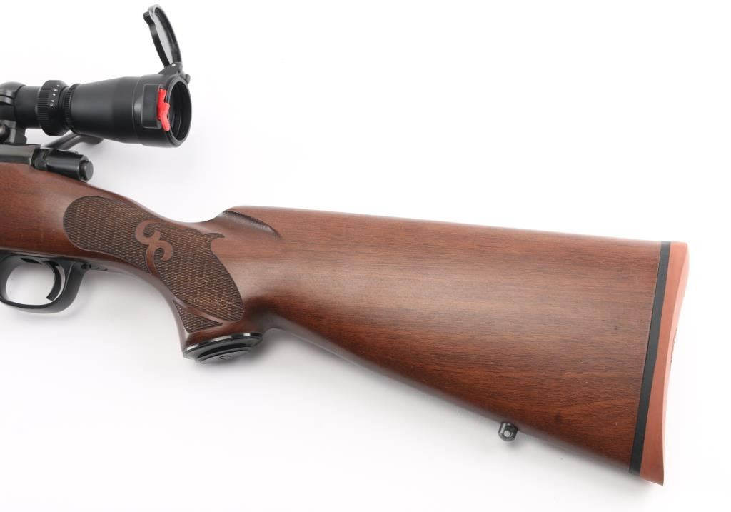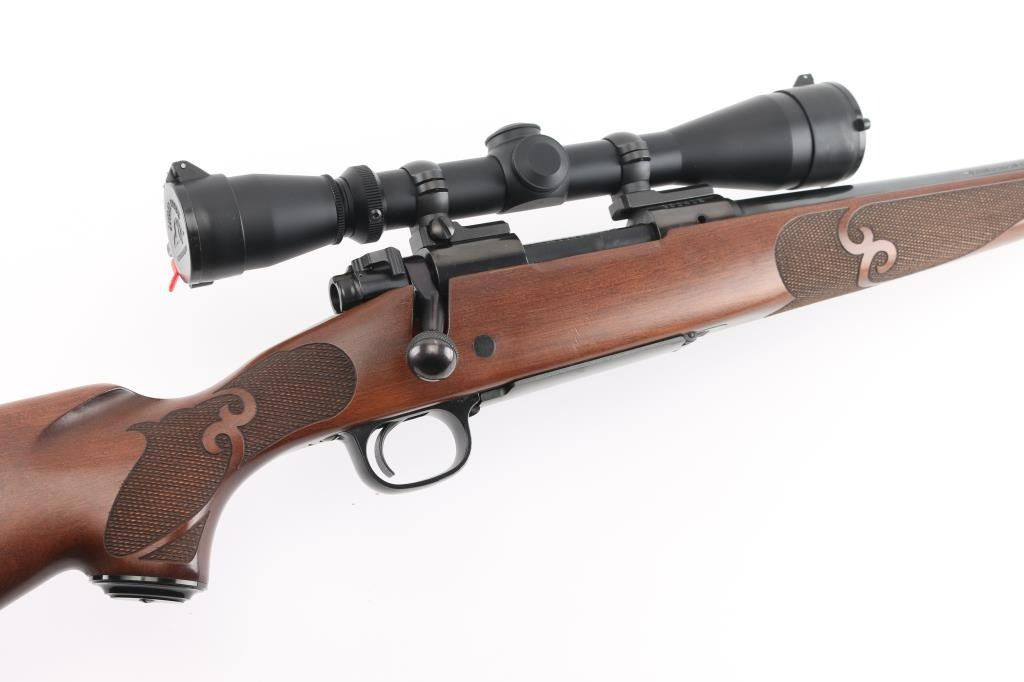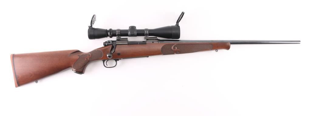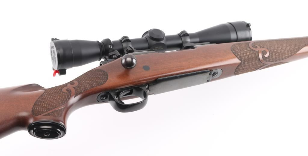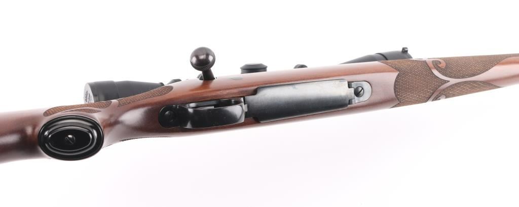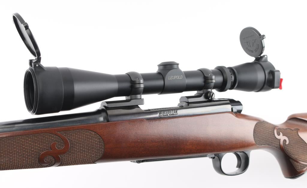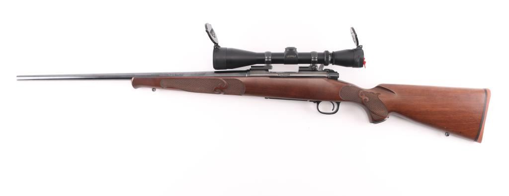 'Classic Featherweight' bolt action rifle with controlled round feed, Mauser type claw extractor. Features blued finish, walnut stock with schnabel tip & no cheek piece, deluxe checkering panels at wrist & forend, thin rubber butt pad, 22" featherweight barrel, no sights, sling studs, three position safety on bolt shroud, hinged floorplate, two piece Leupold bases & rings. Jeweled bolt body, swept-back bolt handle. Bore is excellent. Overall condition is excellent with minor handling marks. Mounts a very good condition Leupold Vari-X IIc 3-9x scope, duplex reticle, clear view, flip up caps. Condition is NRA Excellent *** Modern Firearm ***