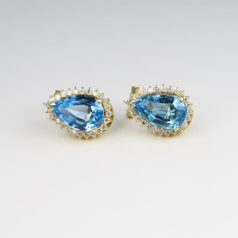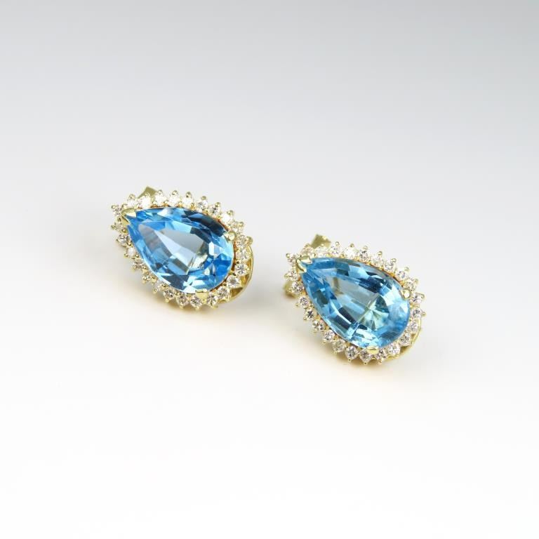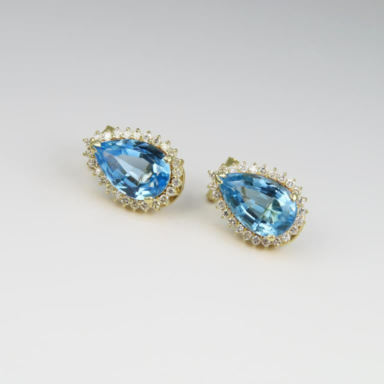 featuring 2 large pear shaped Blue Topaz weighing approx. 10.00 carats total accented with 52 round Diamonds weighing approx. 0.80-1.00 carats with H-I colors and SI clarity set in 14 karat yellow gold with Omega backs. Retail $4,000-$6,000