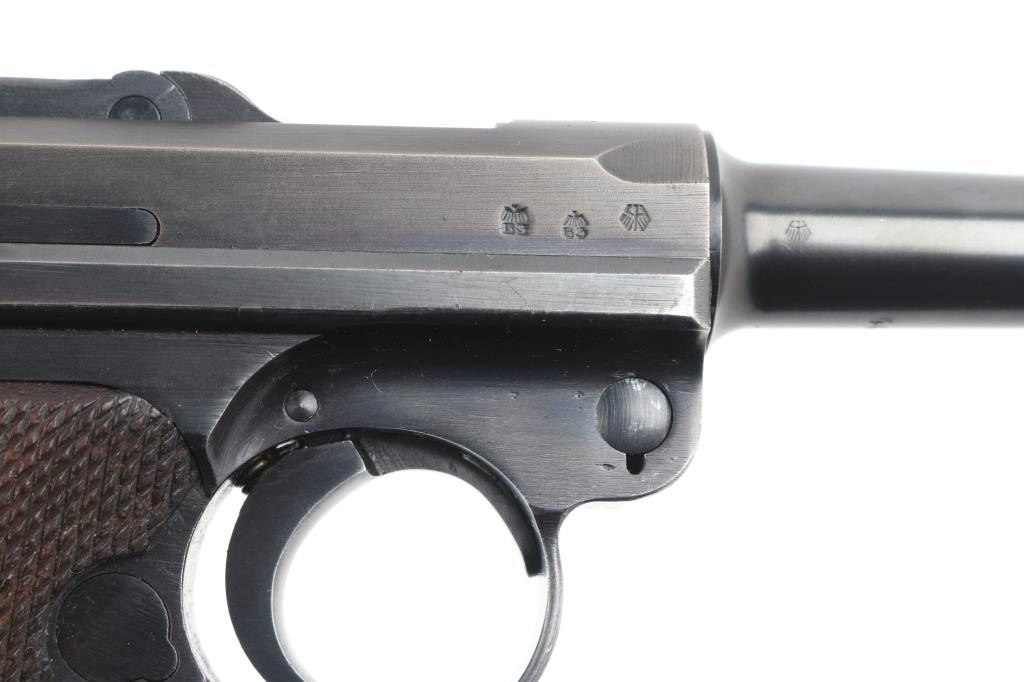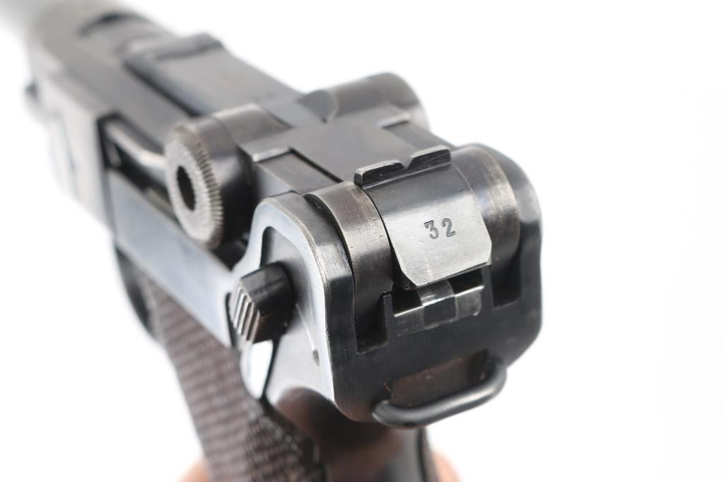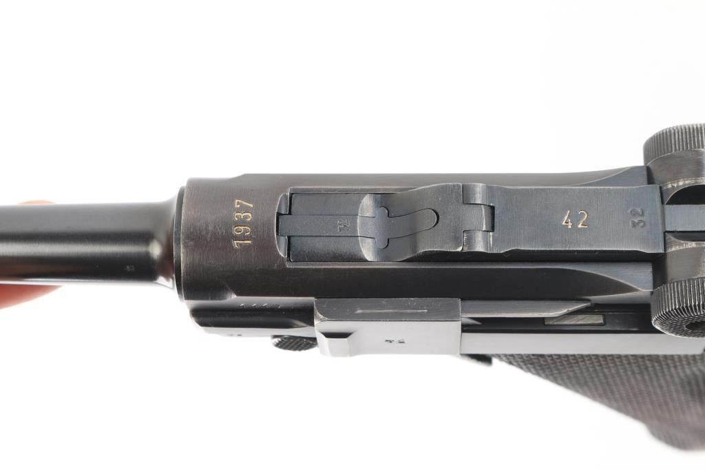 Pre-WWII era German military toggle locked recoil operated semi-automatic pistol chambered in 9x19mm Luger, dated 1937. No import marks observed. Features blued finish, 4" barrel, dovetailed inverted 'V' front sight with witness-marks, 'v' notched rear sight, smooth crescent trigger, knurled charging knobs on the rear toggle link, manual safety on the left side of the frame, knurled push button magazine release, steel frame with lanyard loop & stock lug, and two-piece finely checkered wood grips. Most observed numbers match, with toggle & extractor numbered "32". Bore is very good condition overall with few tiny pits. Appears reblued, with trigger & safety blued. Retains 90% re-finish with edge losses & handling marks. Some small dents or pits in metal visible under refinish. Grips are very good, right panel a bit loose. Markings include Waffenamt, eagle over 63. Included magazine is blued, with aluminum plug numbered "4414b", marked with eagle over '63', good condition with few small pits. Condition is NRA Very Good++ (reblued) *** C&R Firearm ***
