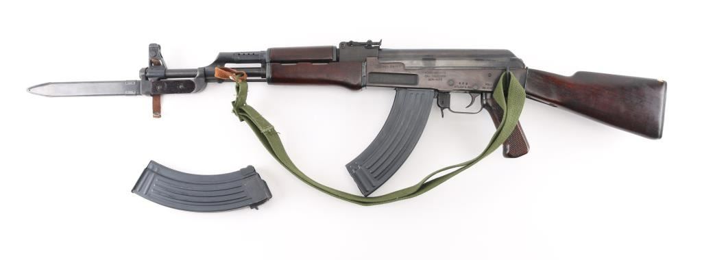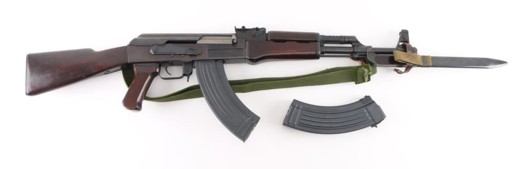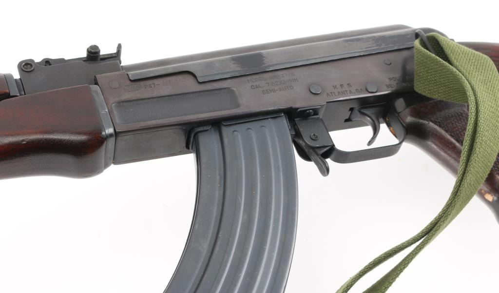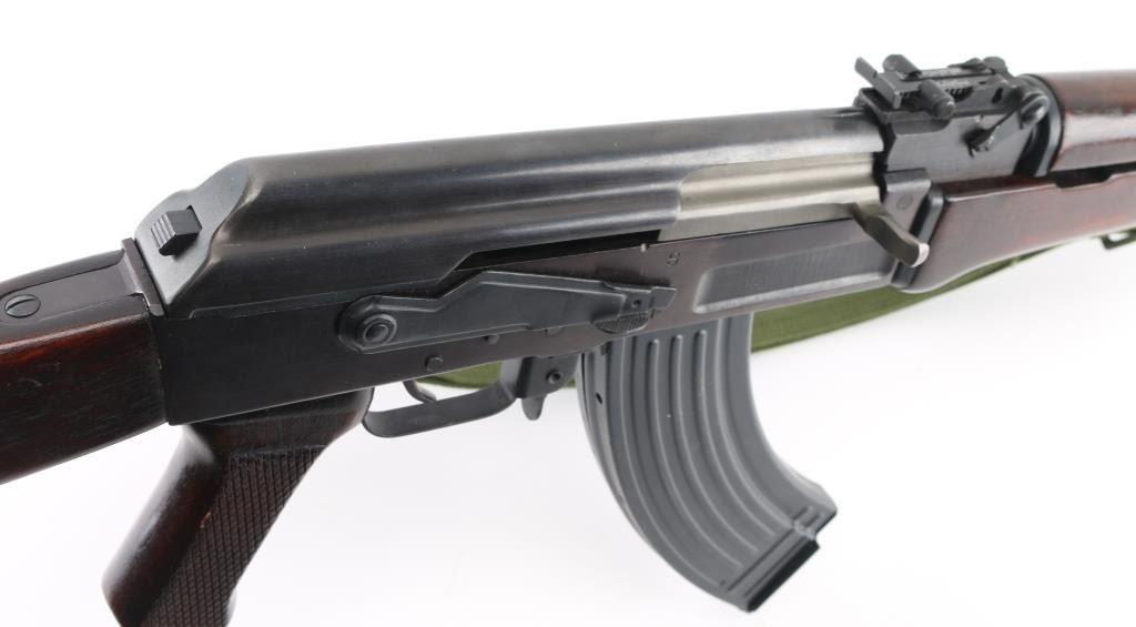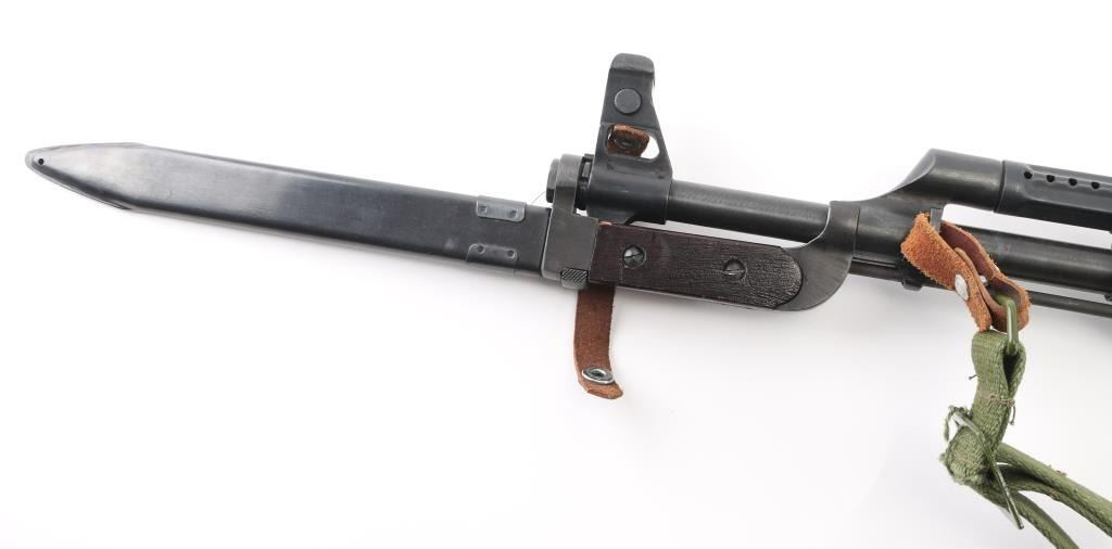 'Legend' Chinese semiautomatic rifle imported by KFS Atlanta GA. "Circle 386". Features milled receiver, blued finish, dark color wood furniture with cross hatching on pistol grip, hard chromed bolt & carrier, 16" chrome lined barrel, adjustable sights with protected post front & tangent rear, cleaning rod under barrel, cleaning kit in butt trap, muzzle cap over threads, forward sling slot, rear sling swivel on receiver, manual safety. Bore is excellent. Retains 90% finish, few losses, several areas of discoloration may indicate touch-up. Stock is very good with handling marks, chip missing from wood at heel. Numbers on bolt & carrier match receiver. Includes (2) total blued steel flat back 30 rd magazines (one has chrome plated follower, both marked "POLY CHINA" on floor plate), olive green canvas web AK sling (appears Chinese, with leather end tabs), bayonet. Condition is near NRA Excellent *** Modern Firearm ***