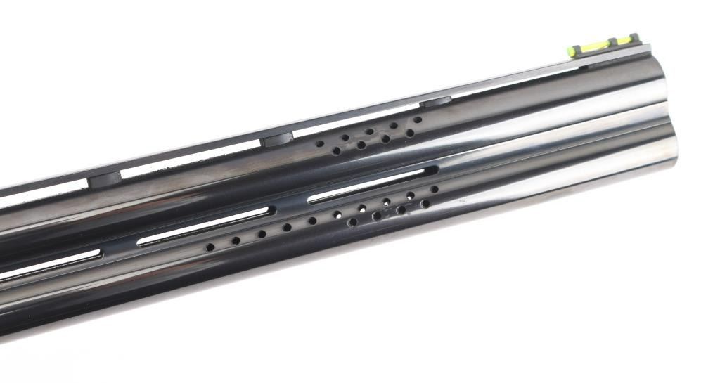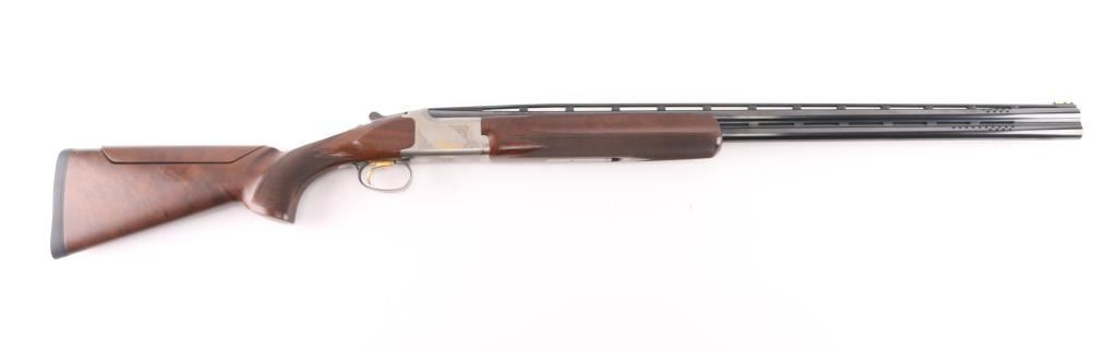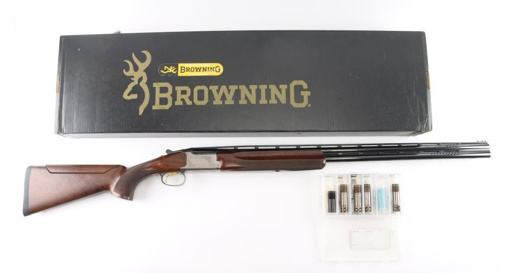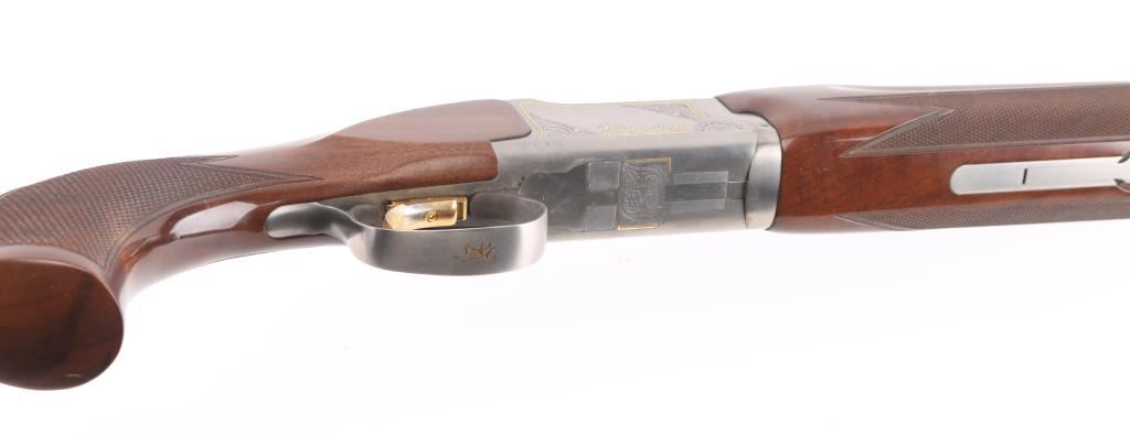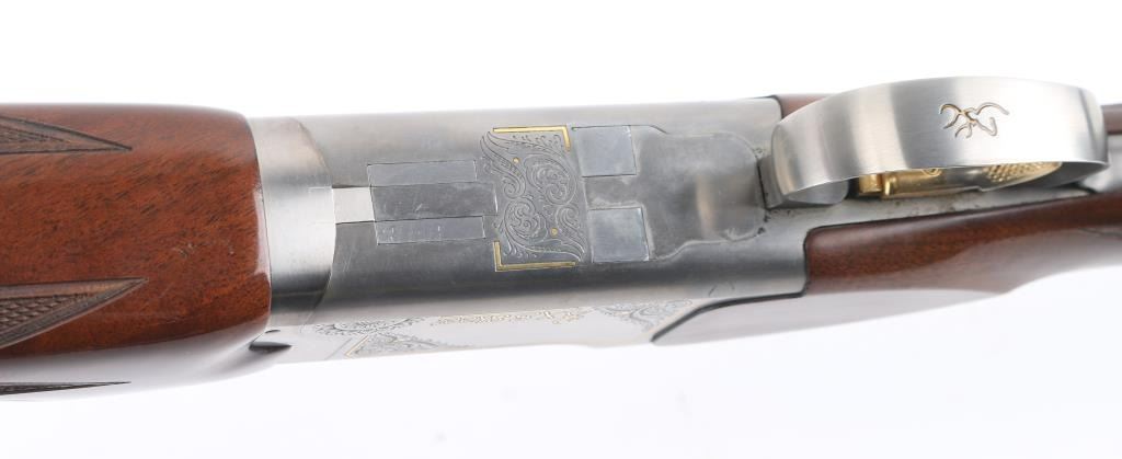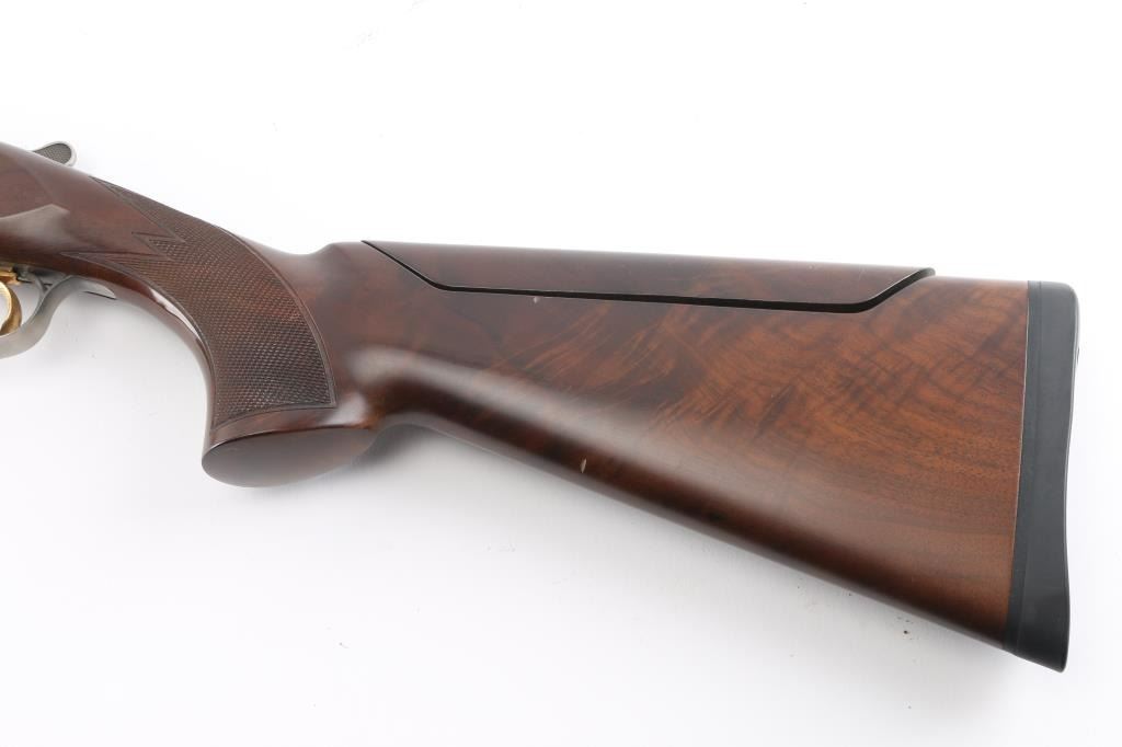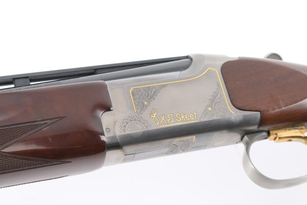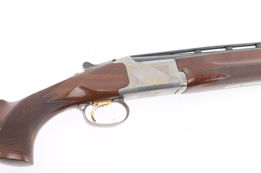 "XS Skeet" Grade 1 Over/Under shotgun made in Japan for Browning Arms Co, Morgan UT. Accepts 2-3/4" shells. Features high polished blue finish, engraved coin finished receiver with gold inlay, fancy figured walnut, checkered wrist & forend, adjustable comb, right handed palm swell at grip, 30" ported barrels, raised vent rib, screw-in chokes (SKT/SKT installed), fiber optic insert front sight, white polymer mid bead, solid rubber recoil pad, selective ejectors. Single inertia trigger (wide, checkered, gold accent) is selectable at tang safety. Bores are very good condition. Barrels retain 95% blued finish with minor handling marks. Coin finish is excellent. Wood is excellent condition with few observed blemishes. Approx stock measurements: 14-3/8" Length of Pull, 1-3/4" Drop at Comb (minimum), 2" Drop at Heel (minimum). Includes factory box with snap caps, choke wrench, selection of choke tubes. Condition is NRA Excellent *** Modern Firearm ***