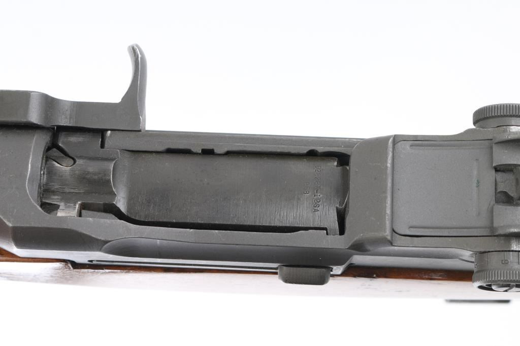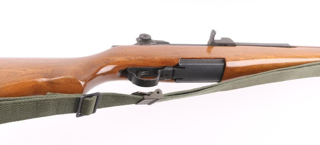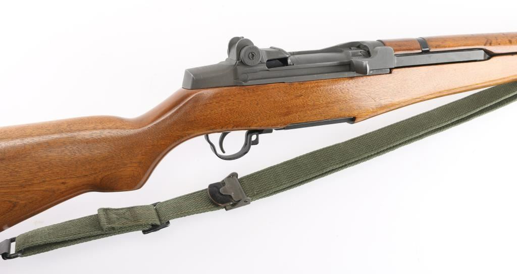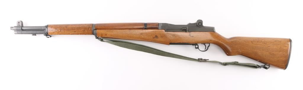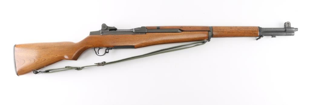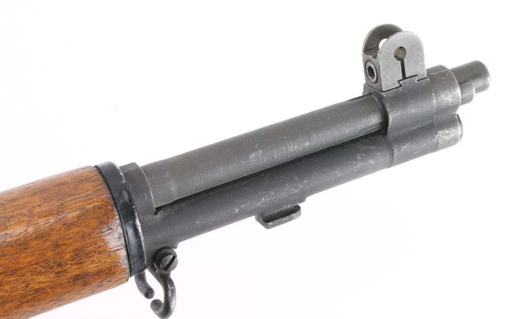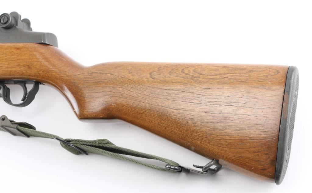 30-06 SN: 5179741 US military semiautomatic rifle manufactured circa 1954. Re-imported by Exel, Gardner MA. Refinished. Features parkerized finish, wood stock & hand guards, 24" barrel, adjustable sights with protected front blade & protected rear peep, fixed magazine for en-bloc clip, manual safety. Barrel markings indicate Springfield Armory 1943 production. Bore is fair to good condition, fairly bright with strong rifling, light pitting and frosting throughout. Retains 90% coverage medium gray parkerizing, original markings still sharp, showing edge losses and handling marks. Wood is very good, sanded & urethane finished, bands slightly loose, buttplate showing small gaps around edges of wood. Includes green cotton web sling. Condition is NRA Very Good (arsenal rebuilt) *** C&R Firearm ***