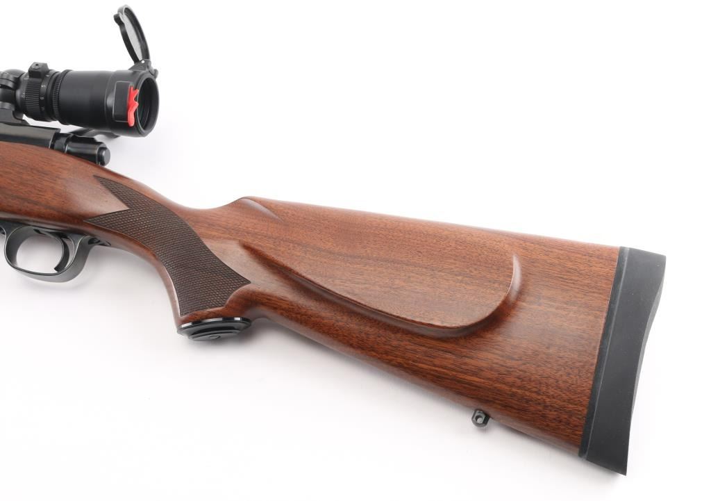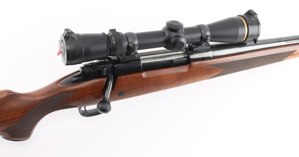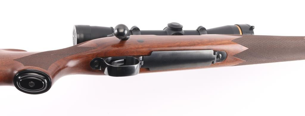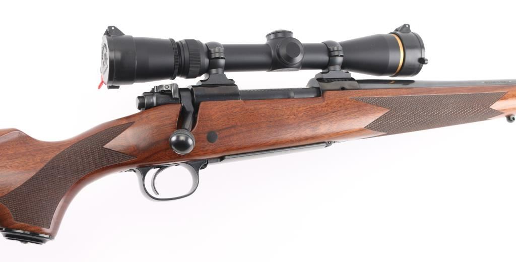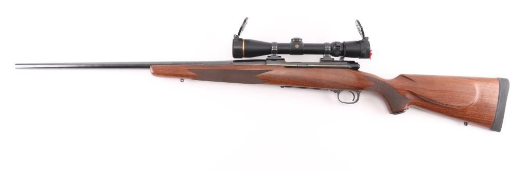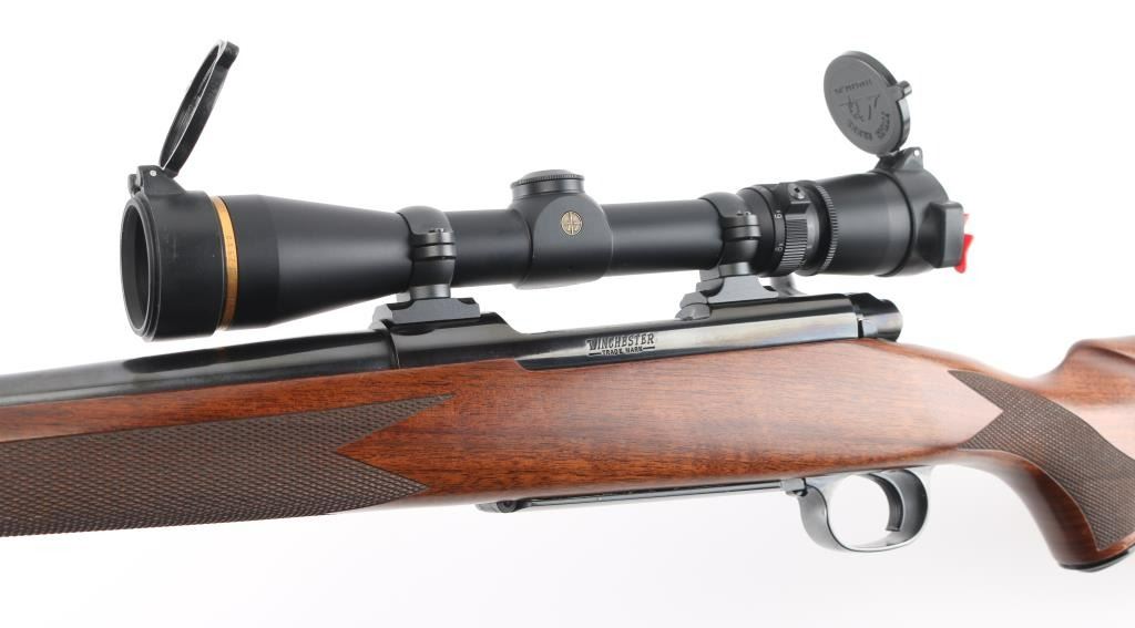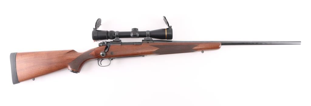 'Classic Sporter' bolt action rifle with controlled round feed, Mauser type claw extractor. Features blued finish, checkered walnut stock with right handed cheek piece, solid rubber recoil pad, 24" barrel, no sights, sling studs, three position safety on bolt shroud, hinged floorplate, two piece Leupold bases & rings. Jeweled bolt body, swept-back bolt handle. Bore is excellent. Overall condition is excellent with minor handling marks. Mounts a very good condition Leupold Vari-X III 2.5-8x scope, duplex reticle, clear view, flip up caps. Condition is NRA Excellent *** Modern Firearm ***
