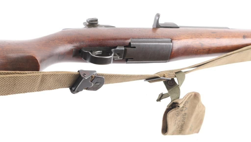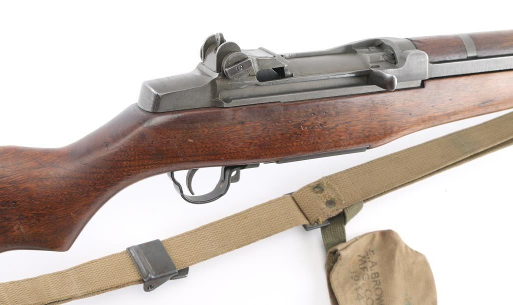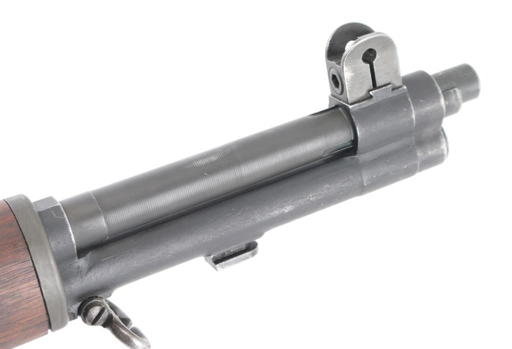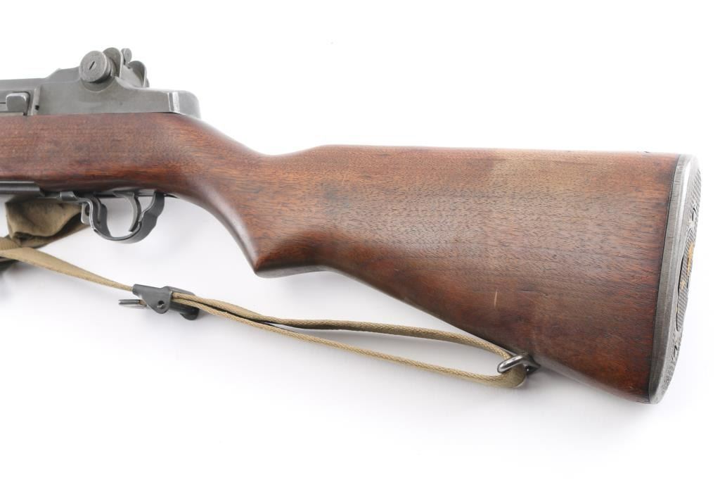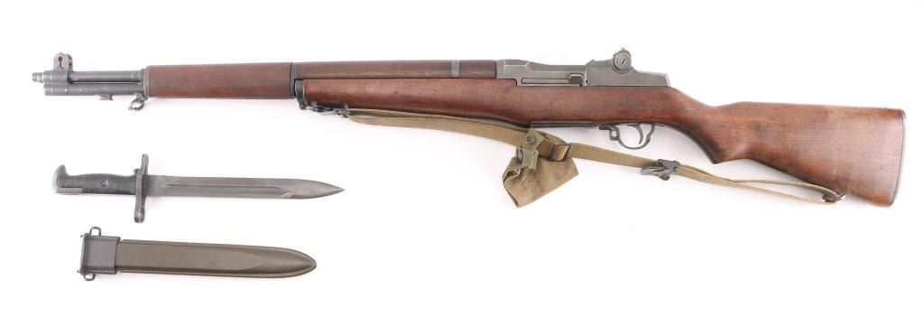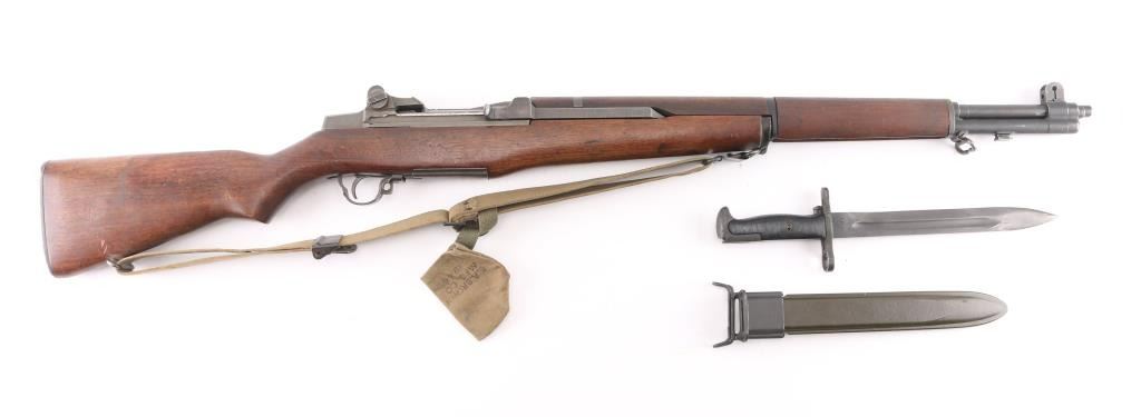 US military semiautomatic rifle manufactured circa 1944. Features parkerized finish, wood stock & hand guards, 24" barrel, adjustable sights with protected front blade & protected rear peep, fixed magazine for en-bloc clip, manual safety. Rear sights are later type 2. Bore is very good condition. Metal parts retain 85% smooth medium gray finish, with edge losses & handling marks. gas cylinder has some pin-prick pitting, some small areas of discoloration. Shoulder stock hardware (swivels, buttplate) has been recently re-parkerized with medium gray color. Wood appears very good condition with minor handling marks. 'P' cartouche behind the triggerguard . Bore is ok, with rifling present, with some scattered light pin-prick pitting. Bolt is SA, and barrel is SA, dated 6-44, the year of manufacture. Comes with correct U.S. marked bayonet, period canvass sling, and 1944 dated muzzle cover. Issue oiler, and shell extractor in butt. Condition is NRA Near Very Good C&R Firearm.