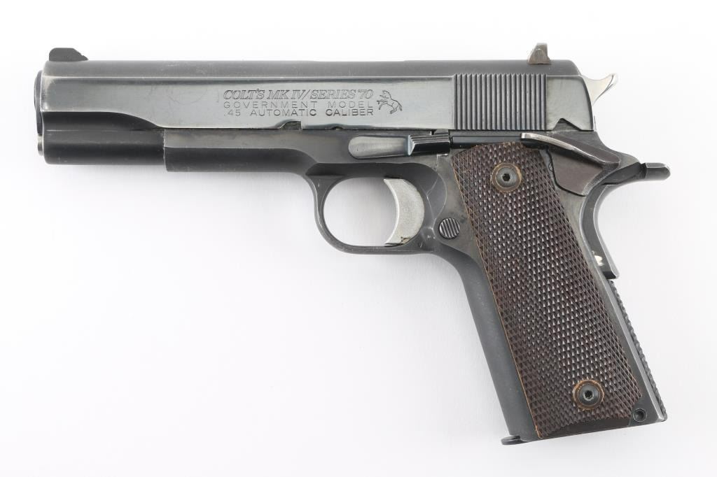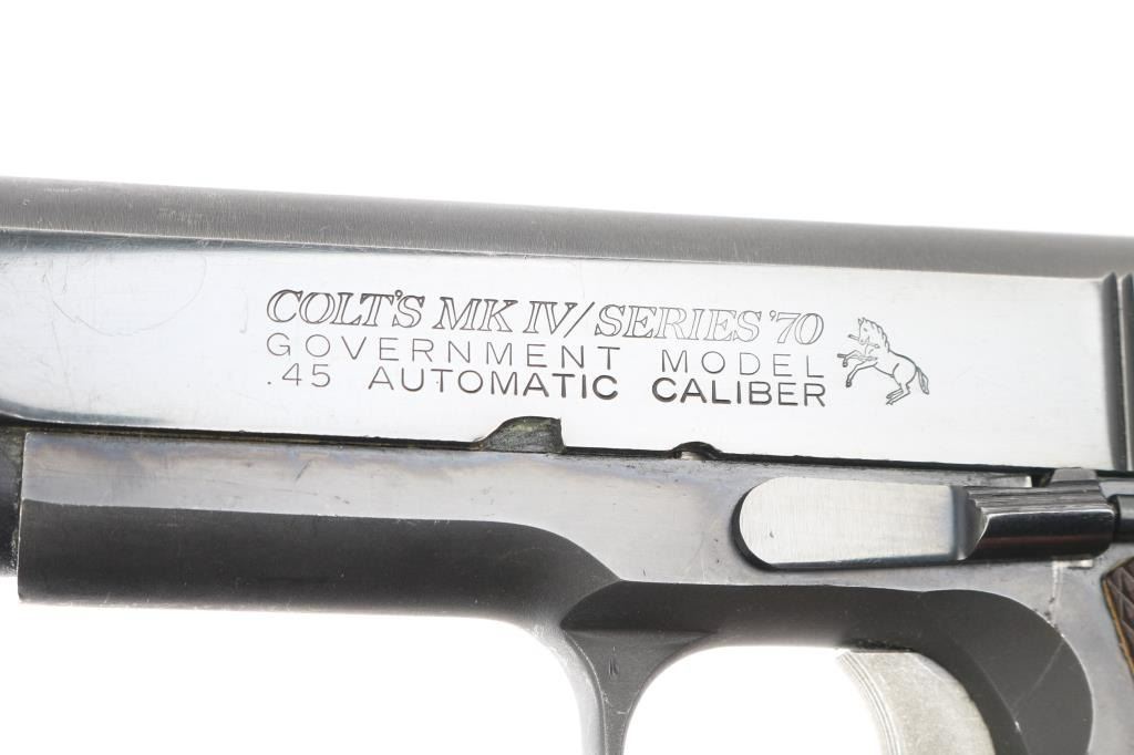 'MK IV/Series 70' 1911A1 pattern single action semi-automatic pistol manufactured circa 1980. Features matte blued finish with bright polished sides, 5" barrel, serrated ramp front sight. square notch rear sight, grooved trigger, serrated hammer spur, extended thumb safety on the left side of the frame, beavertail grip safety, push button magazine release, steel frame, serrated arched mainspring housing, checkered brown plastic grips. Hammer spur rounded with polished sides. Bore is very good condition. Retains 85% finish with handling marks, edge losses, a few scattered patina spots. Grips are very good condition. Includes (1) Colt magazine. Condition is NRA Very Good++ (some aftermarket parts) *** Modern Firearm ***