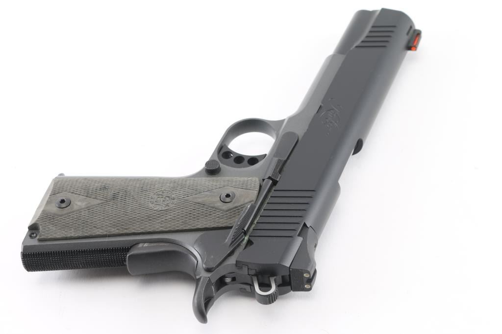 High quality semiautomatic pistol chambered for 45 ACP. Features two tone finish (black slide and controls over medium gray lightweight alloy frame), 5" barrel, extended manual safety, beavertail grip safety, adjustable overstop trigger, flat checkered mainspring housing, full length recoil spring guide, beveled magazine well, dovetail mounted 3 dot sights with orange fiber optic front insert, slide serrations front & back, double diamond checkered Hogue logo grips. Bore is very good condition. Finish is excellent with minor handling marks. Includes (2) blued & (1) stainless magazine, factory plastic carry case with papers. Condition is NRA Excellent *** Modern Firearm ***