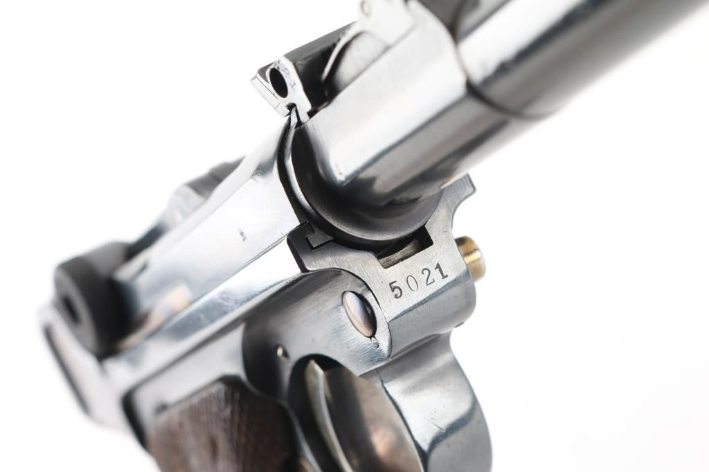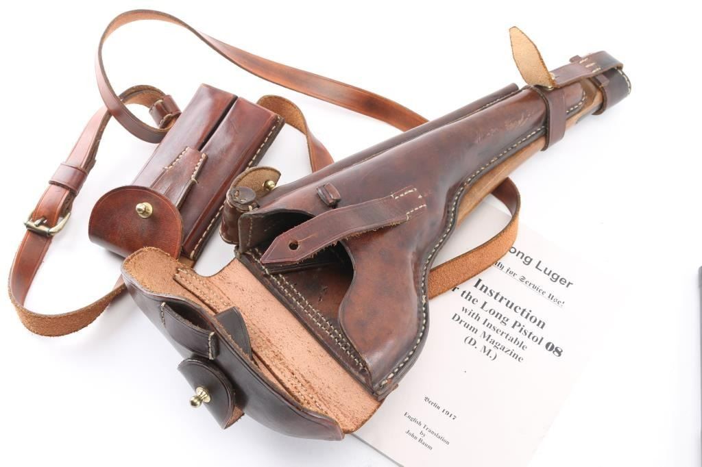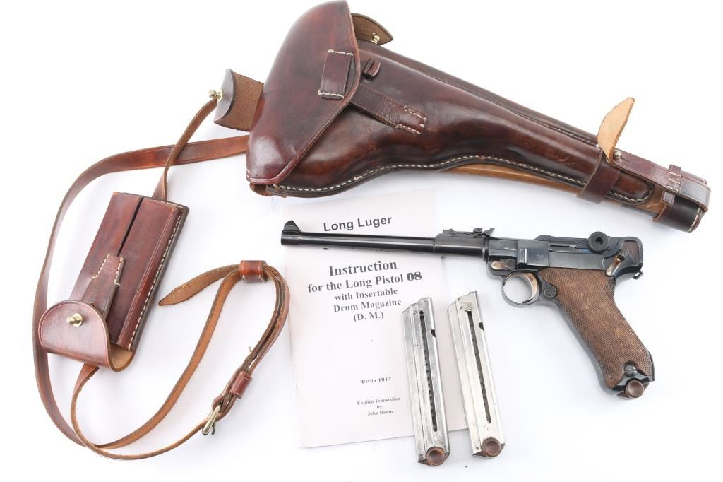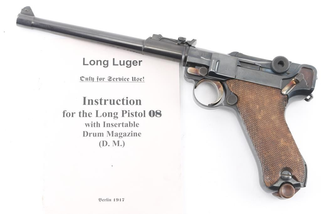 Pistol. Semi-Automatic. 8 rd Magazine. Toggle-locked, short recoil. WW 1 issued Military sidearm. Pistol has been re-blued. 8" barrel. Serrated inverted V front sight and tangent rear sight, 100 to 800 meters."DWM" Monogram on toggle. 1917 dated. Serial numbers matched on all parts, except the sight base (32). "Gesichert" marked safety. Only traces of proofs remain. The first two digits of the serial number on the left frame are very faint. There is British proofs on the right side of the barrel (Capture) NP with sword, and Tons can be made out, very faint. Straw appears to have been reapplied. Bore appears very good/bright. Checkered wood grips are good with minor scratches/dents. Wood bottom of magazine is unmarked. Re-blued finish is very good with minor edge wear. Comes with a very well made shoulder stock/holster rig with take down tool. cleaning rod, straps, magazine pouch. Pouch contains two original WW1 era wood bottom magazines, Wood stamped 2659, and 6307. (3 Total) Very good condition, Included is a copy of the German 1917 dated manual in English. NRA Condition-Very Good/Re-Blued C&R Firearm.