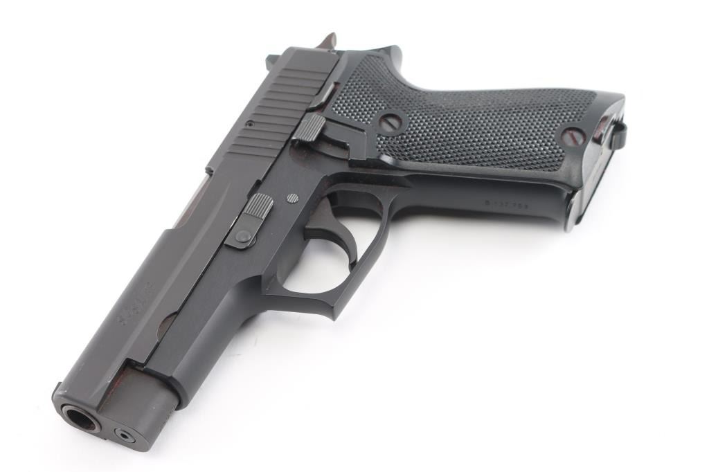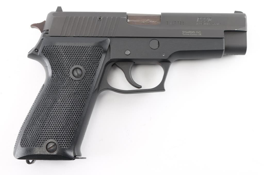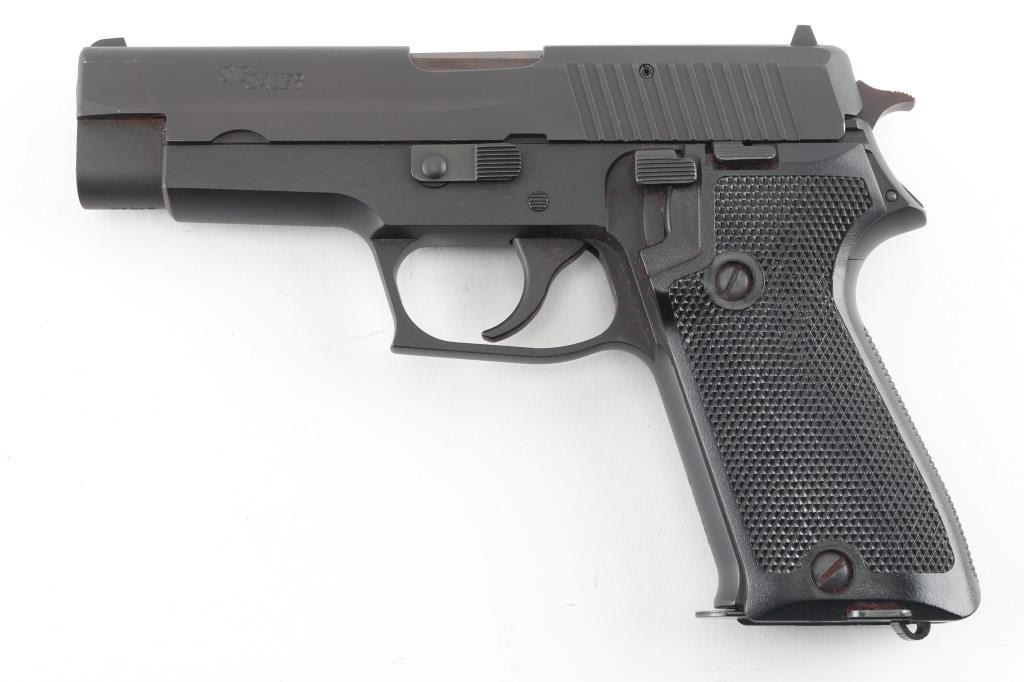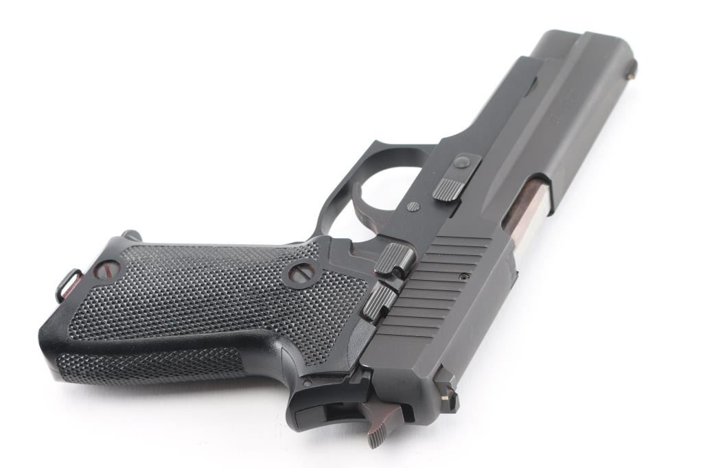 'Made in W Germany' Early European Model, Heel Magazine Release. Proof dated 1986. Semiautomatic pistol, imported by SIGARMS, Tyson's Corner VA. Features matte black alloy frame, matte dark gray slide, 4.5" barrel, white dot front & white bar rear sights in dovetails, frame mounted decocking lever, double/single action, checkered black polymer grips. Bore is very good. Retains 95% finish with edge losses, signs of use. Grips are very good with handling blemishes. Includes four magazines, factory box. Condition is near NRA Excellent *** Modern Firearm ***