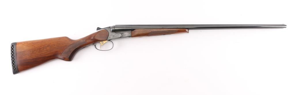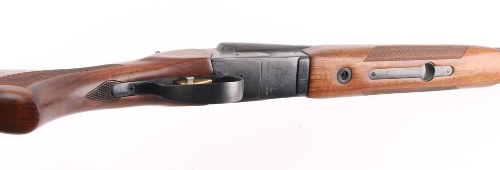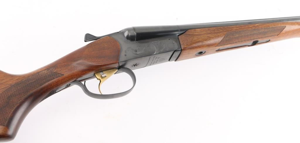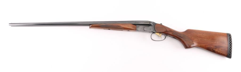 Double barreled side-by-side shotgun made in Russia, imported by EAA, Cocoa FL. Features box lock, blued finish, 26.5" barrels, choked Full/Full, high matted rib, steel bead front sight, single trigger with selector button, knurled top lever, sliding tang safety, selective ejectors, checkered walnut forend, checkered walnut semi-pistol grip shoulder stock, ventilated rubber recoil pad. Limited scroll engraving on receiver. Accepts 3" shells. LOP is 13-5/8". Barrels & hanger numbered to receiver. Bores are very good. Retains 95% finish with minor edge losses, handling marks. Wood is excellent with few blemishes. Condition is NRA Excellent *** Modern Firearm ***