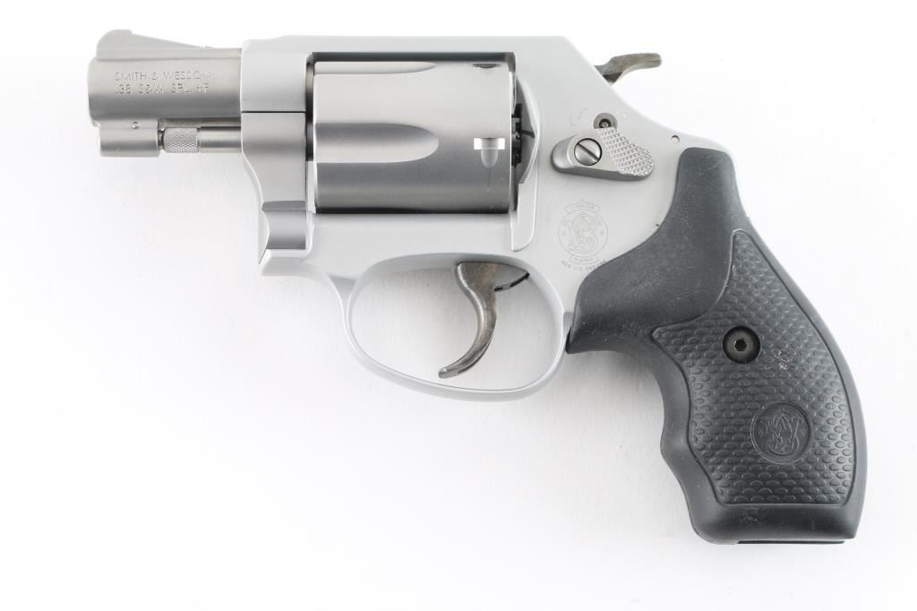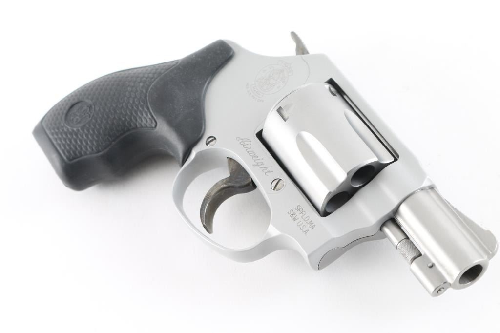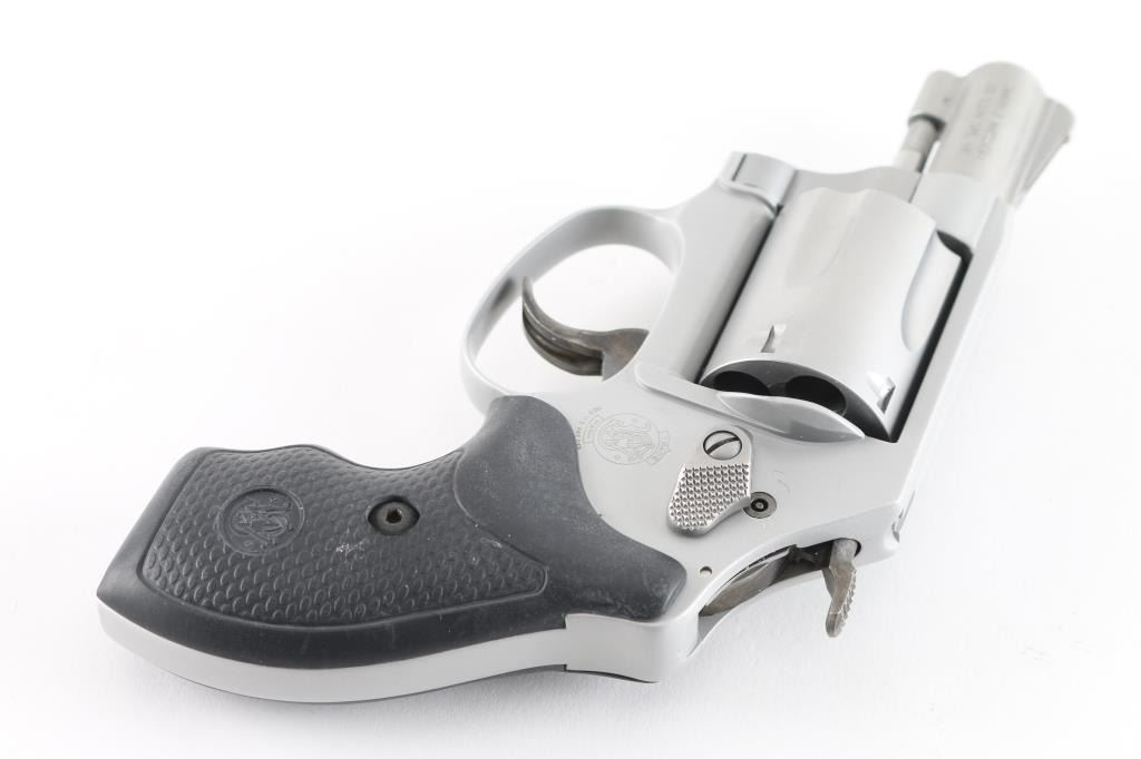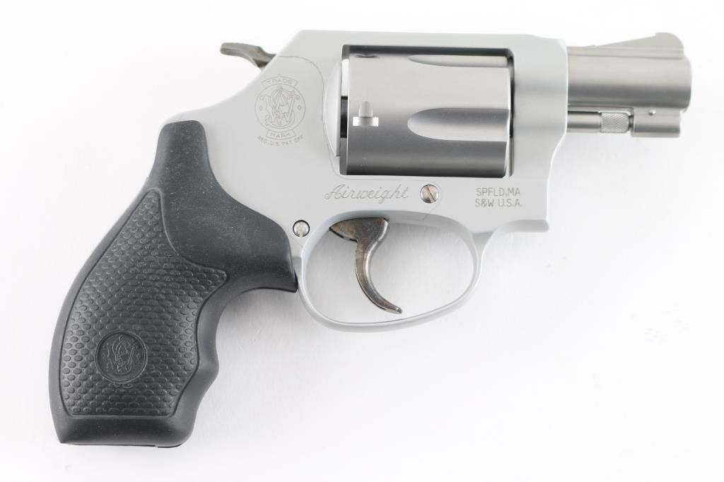 'Airweight' Small frame double action revolver. +P rated. Features satin silver/gray finish (stainless steel & matching color alloy), 1.78" bbl, ramp front sight, square notched rear sight, fluted five shot cylinder, frame lock, textured black rubber grip with S&W emblems. Revolver shows little wear, slight drag line on cylinder. Action is crisp with solid lock-up, bore is excellent and rubber grips are fine. In factory box with papers. Condition is NRA Excellent *** Modern Firearm ***