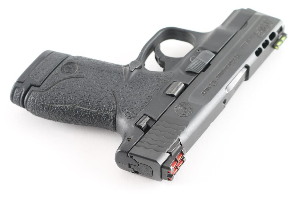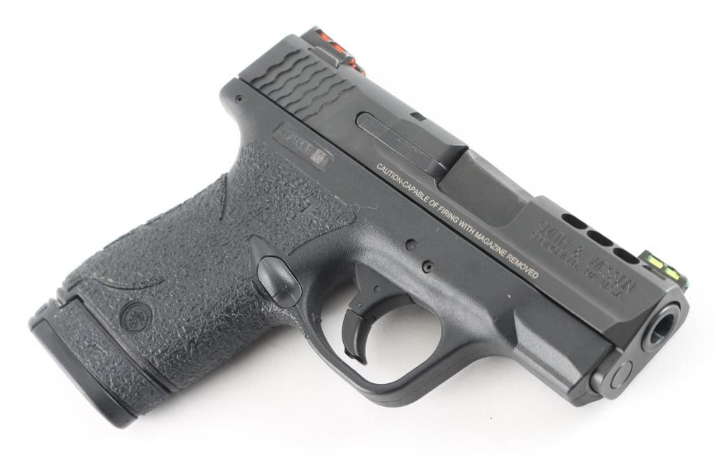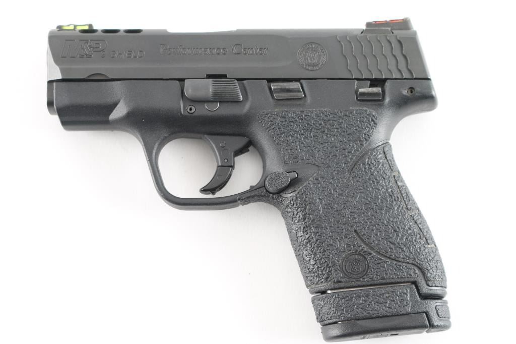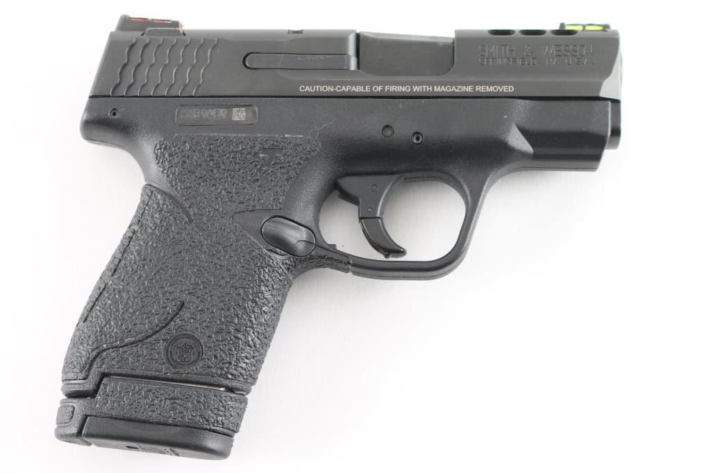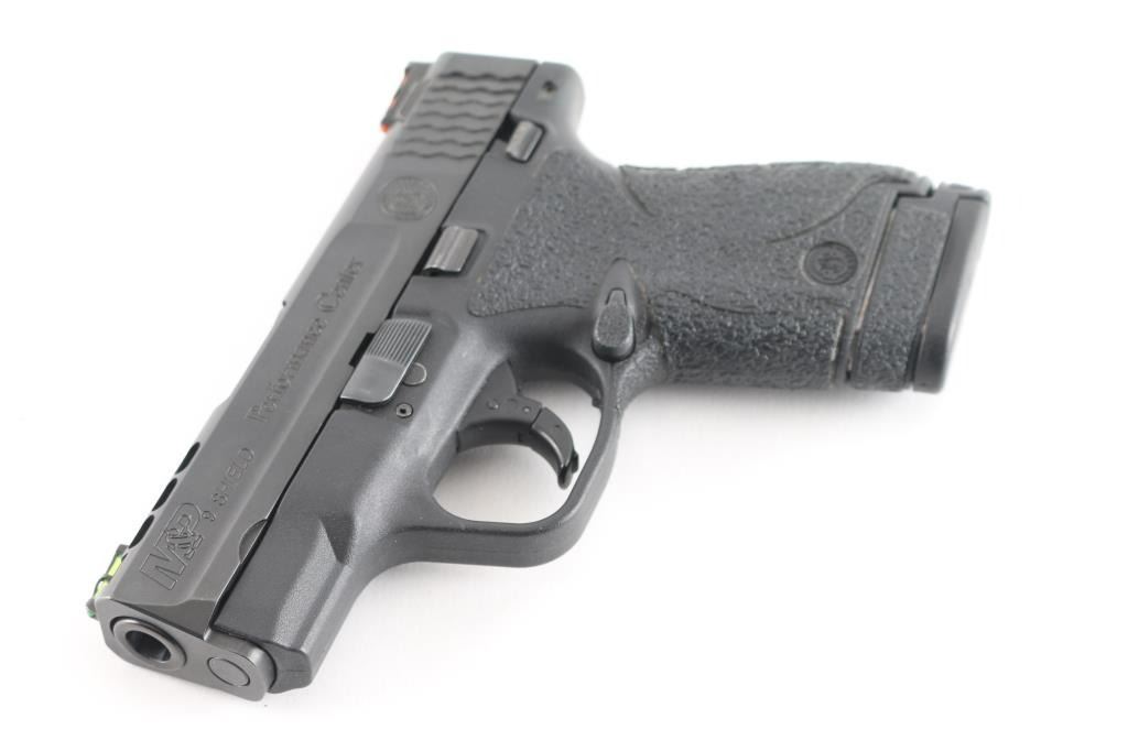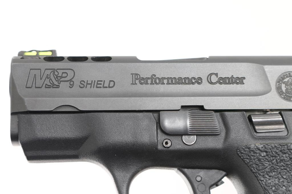 From the Smith & Wesson Performance Center comes a great little carry gun. It has a 3" ported stainless steel barrel, a polymer frame with an embedded stainless steel chassis, segmented safety trigger, thumb safety, HI-VIS fiber optic sights and a factory ported stainless steel slide with an Armornite finish. The front sight is green with red rear sights. It sports rear slide serrations and wrap around, textured grip panels. The metal finish looks very good as does the frame and grips. The bore looks good, bright but dusty. Comes with one eight round factory magazine. Condition is NRA Very Good *Modern Firearm*