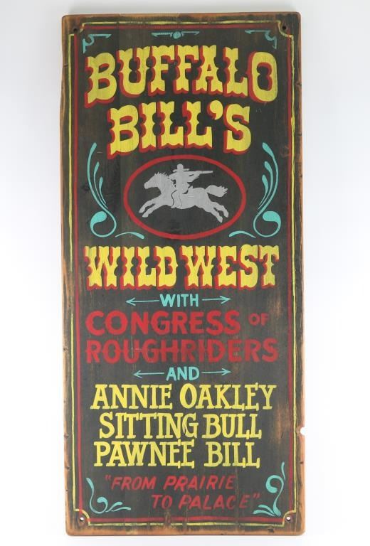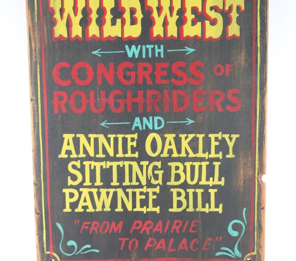 47.5' x 21.5' wood sign. States 'Buffalo Bill's Wild West with Congress of Rough Riders and Annie Oakley, Sitting Bull, Pawnee Bill' "from Prairie to Palace". Vibrant colors. Good condition.