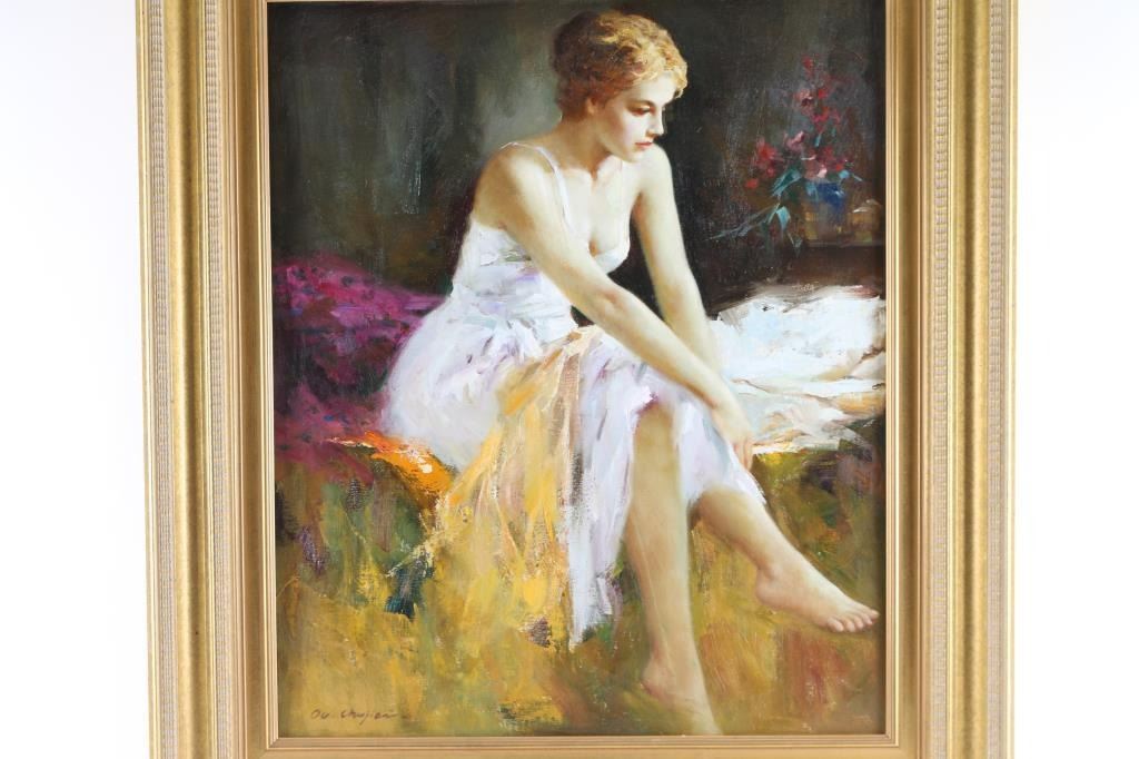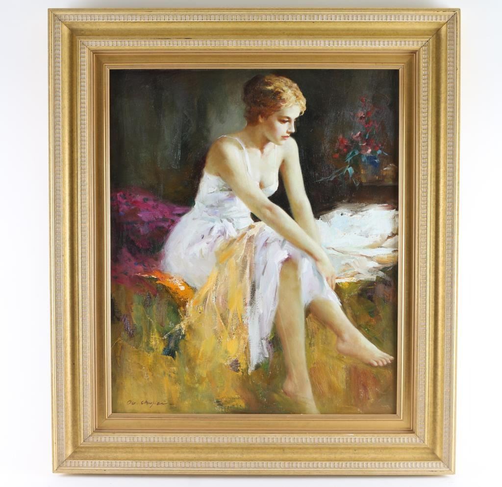 by Ou Chujian entitled White Dress image size is 24"x19", signed lower left hand corner. Ou Chujian (Born 1950) is active/lives in California / China. Ou Chujian is known for Figural, Portrait, Genre.