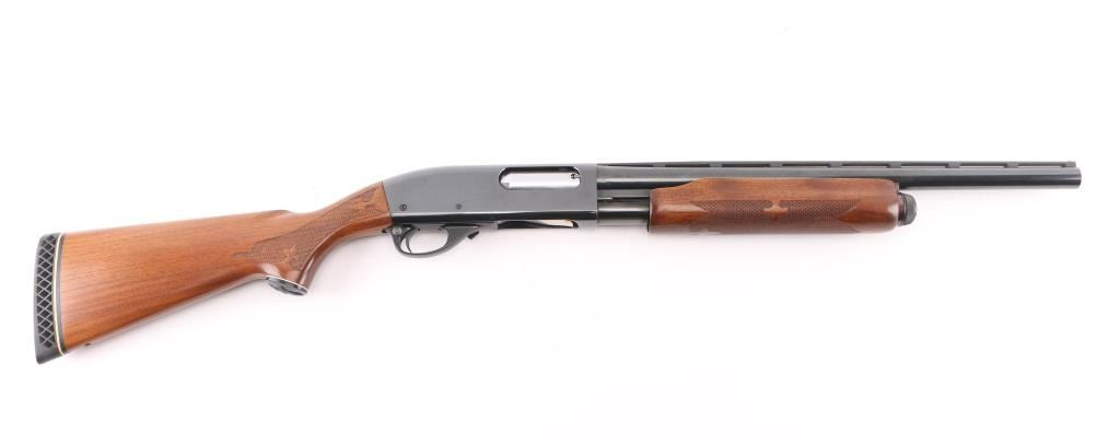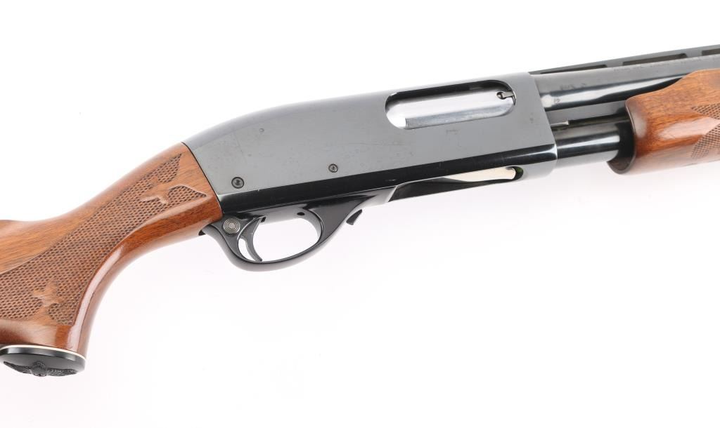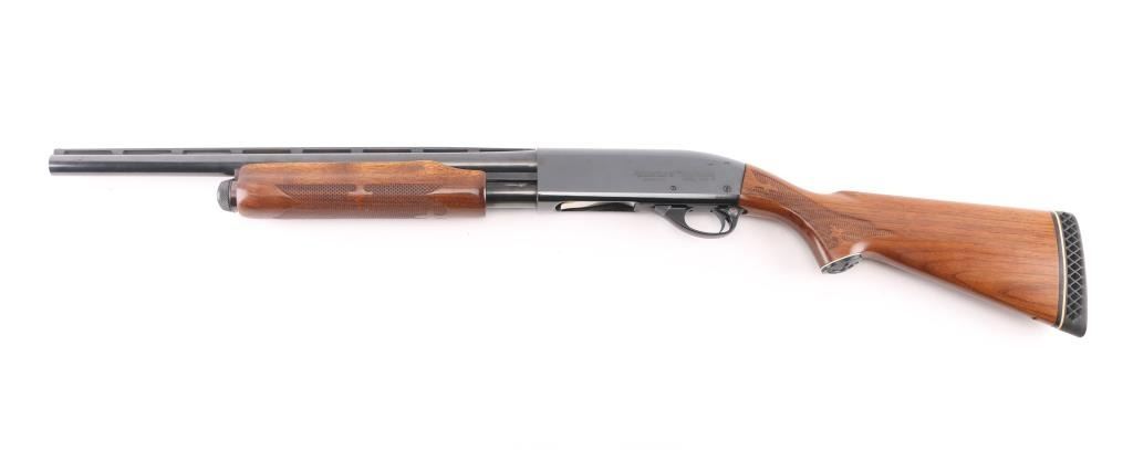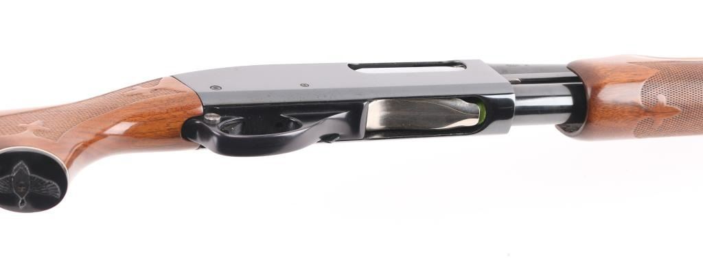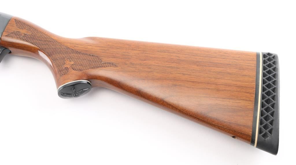 American made pump action shotgun chambered for 2.75" or shorter 12 gauge shotshells. This 870 Wingmaster has an 18.5" cut down barrel with a blued finish, vent rib barrel, aluminum bead front sight and a smooth trigger. The two piece wood stocks have Fleur-de-lis checkering at the wrist and forearm, black "waterfowl" grip cap and white line recoil pad. Metal finish looks very good with minor signs of handling. Wood stocks look very good, there is a hole in the bottom of the butt stock where a swivel stud used to be. The bore looks great, bright. Choke reads Modified on the barrel but since it was cut down it measures Improved Cylinder on a choke gauge. LOP is 14". Condition is NRA Excellent. *Modern Firearm*