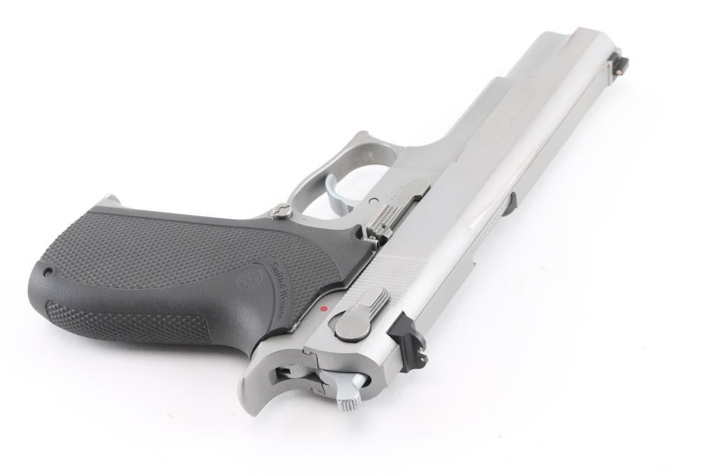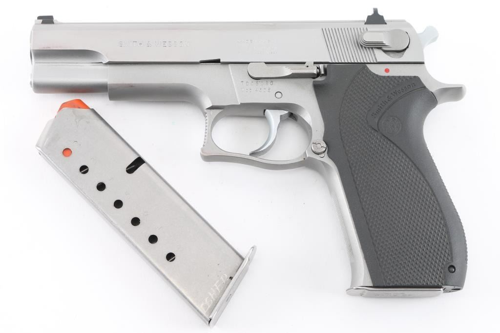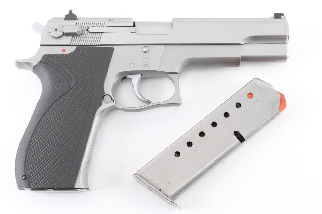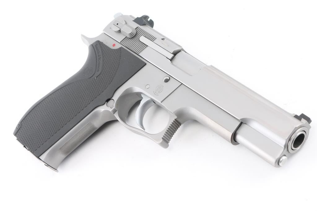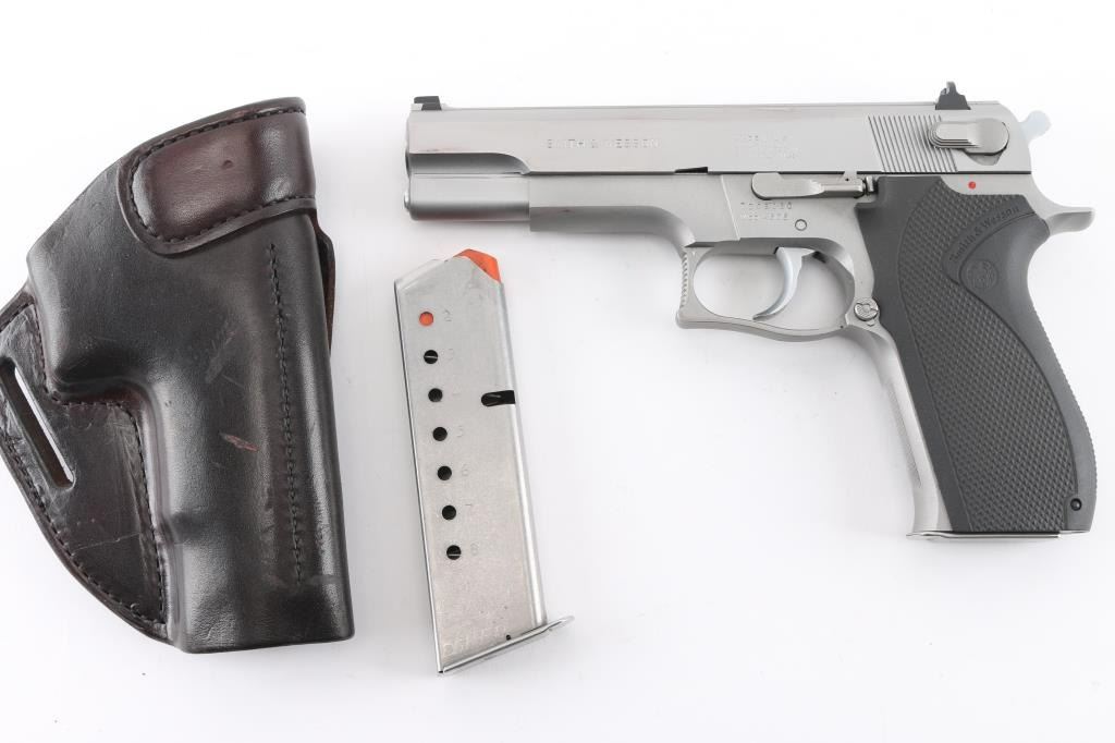 Double/single action semiautomatic pistol. Features stainless steel construction, black plastic checkered S&W logo grips, three dot sights in dovetails, ambidextrous slide mounted safety/decocker, 5" barrel. Rear sight has been rounded at outer corners to prevent snagging. Bore is in excellent condition. Metal surfaces are in near excellent condition with few blemishes. Includes the original factory cardboard box, two (total) magazines (one has "JO" scratched into the side) & Milt Sparks leather belt slide holster. Condition is near NRA Excellent ***Modern Firearm***