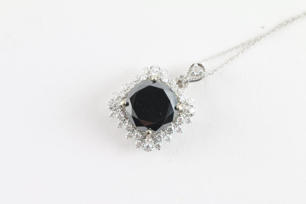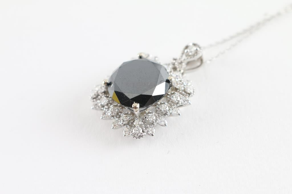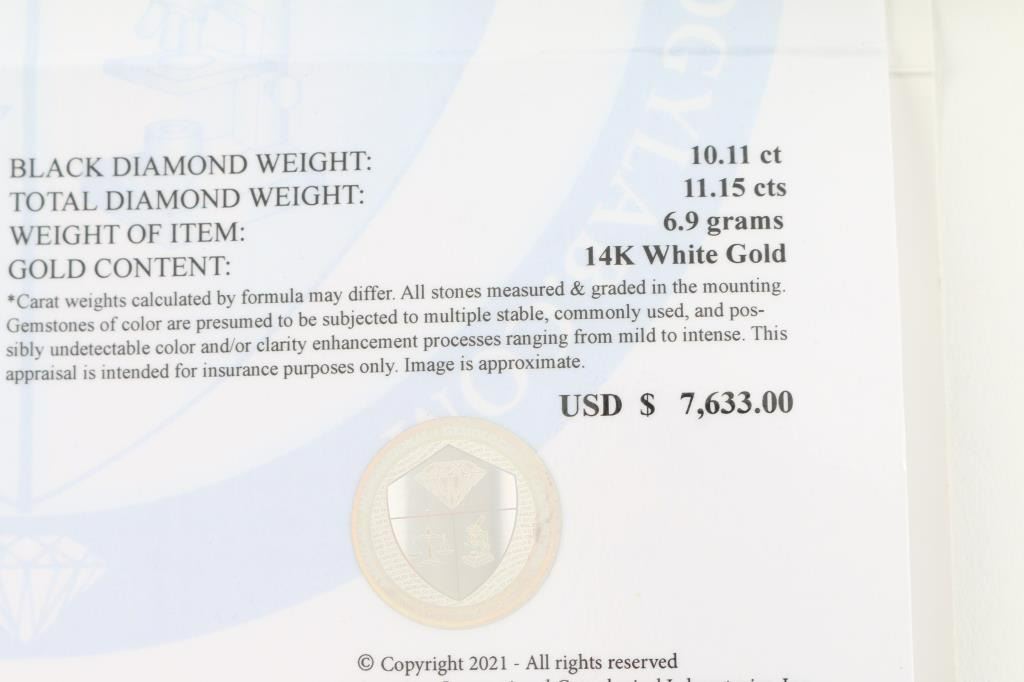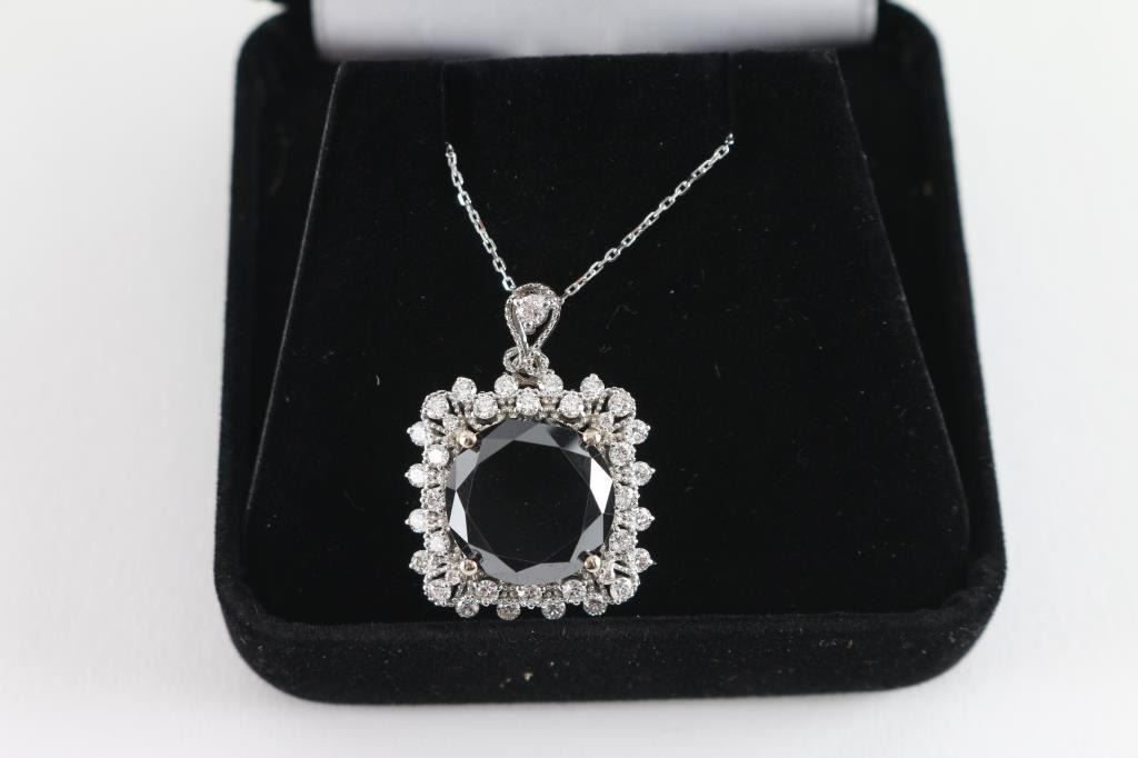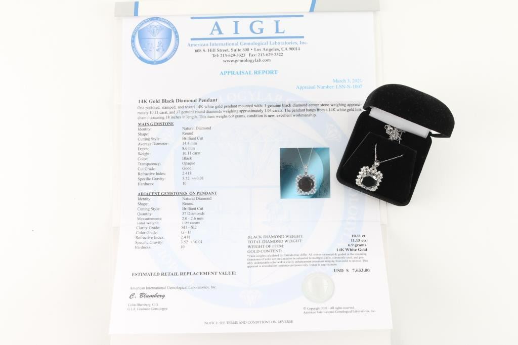 Round Brilliant cut 10.00 carat black diamond and surrounded by 37 diamonds 1.04 carats G-H S11-12 set in 14Kt white gold on white gold chain. Includes an appraisal report from AIGL stating replacement value is 7633.00.