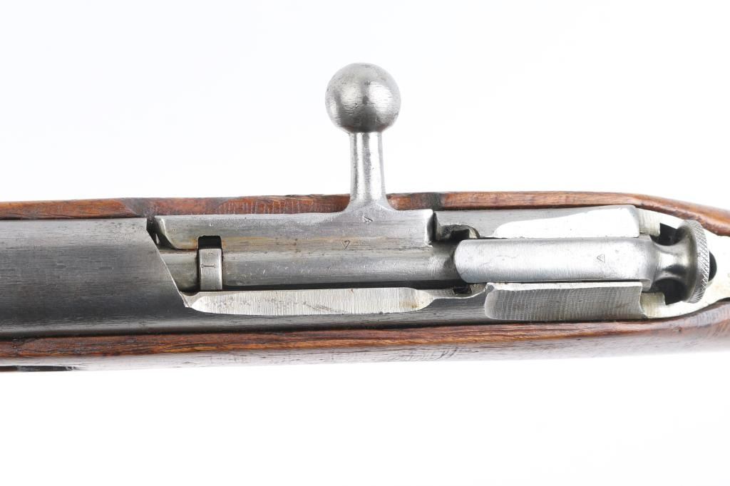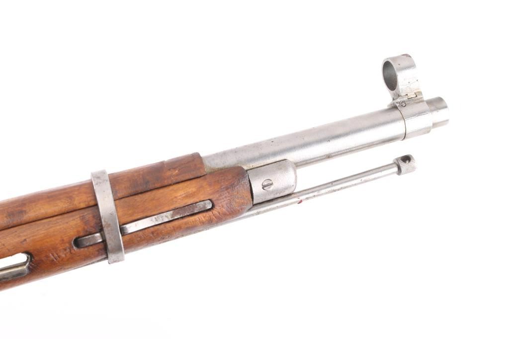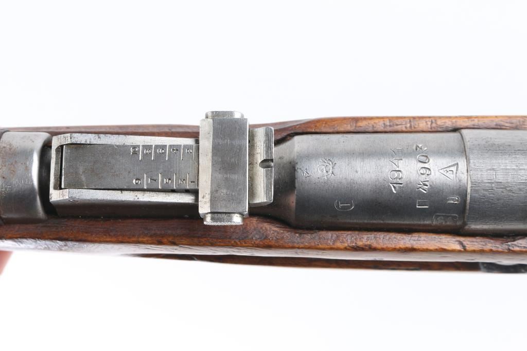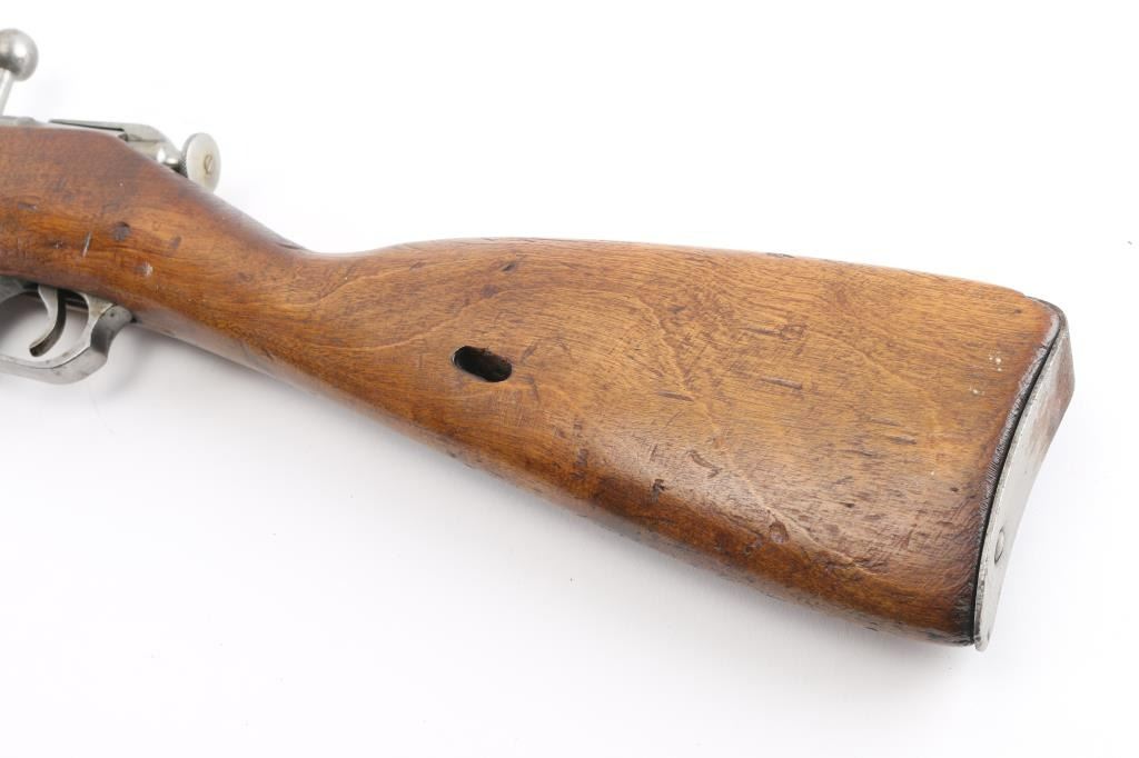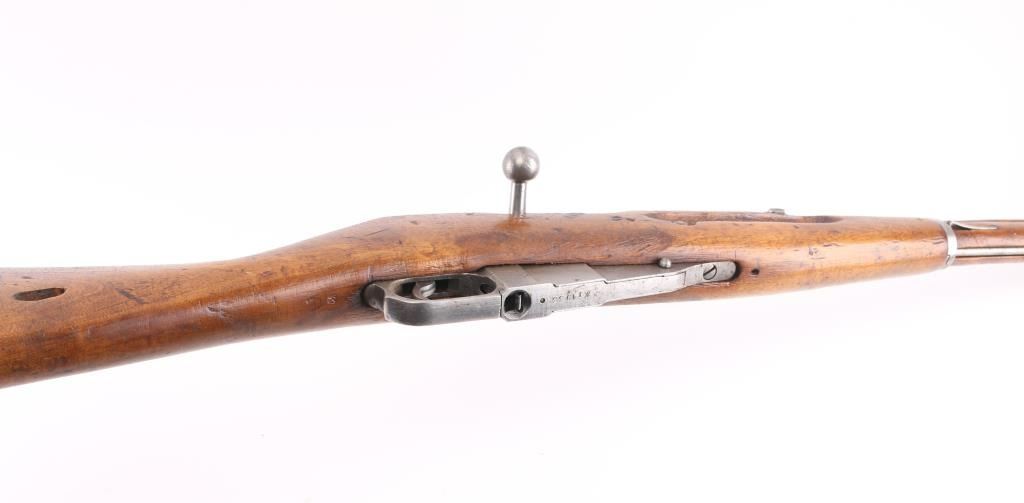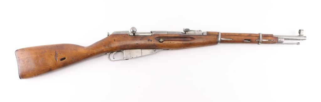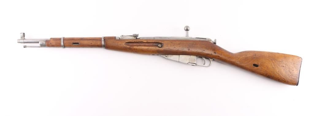 WW2 Russian Army carbine. Blued metal finish, with wooden stock, and forearm. 20" barrel, with tangent rear sights, hooded adjustable front sight post. Bore is very good. Action is smooth/tight. 5-rd attached box magazine. Chrome bolt. 1941 dated barrel, cleaning rod present. Blue metal is in the white, markings clear, mismatched numbers, Izhevsk bolt. Wood is very good. Note* Barrel is stamped 'SA' in box on the barrel, indicating it was captured by the Finns during the Winter war. NRA Condition-Good. C&R Firearm.