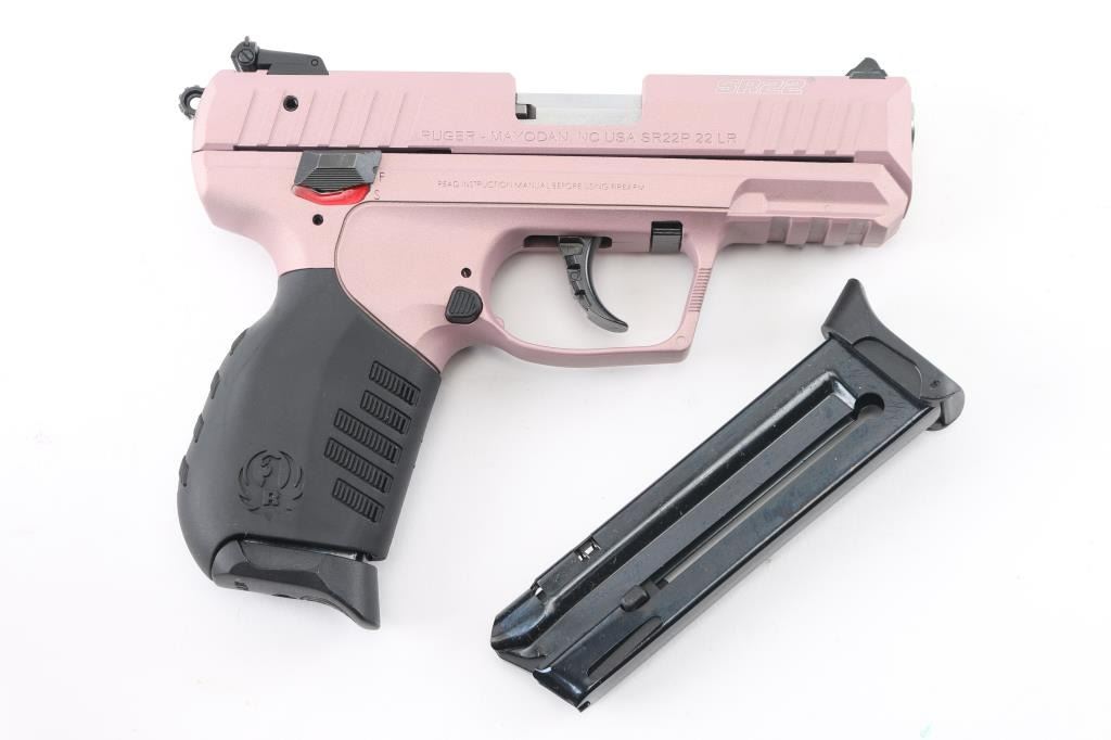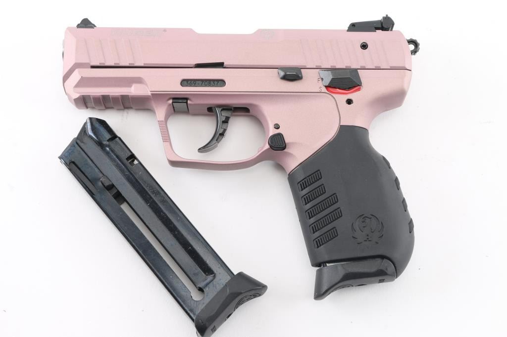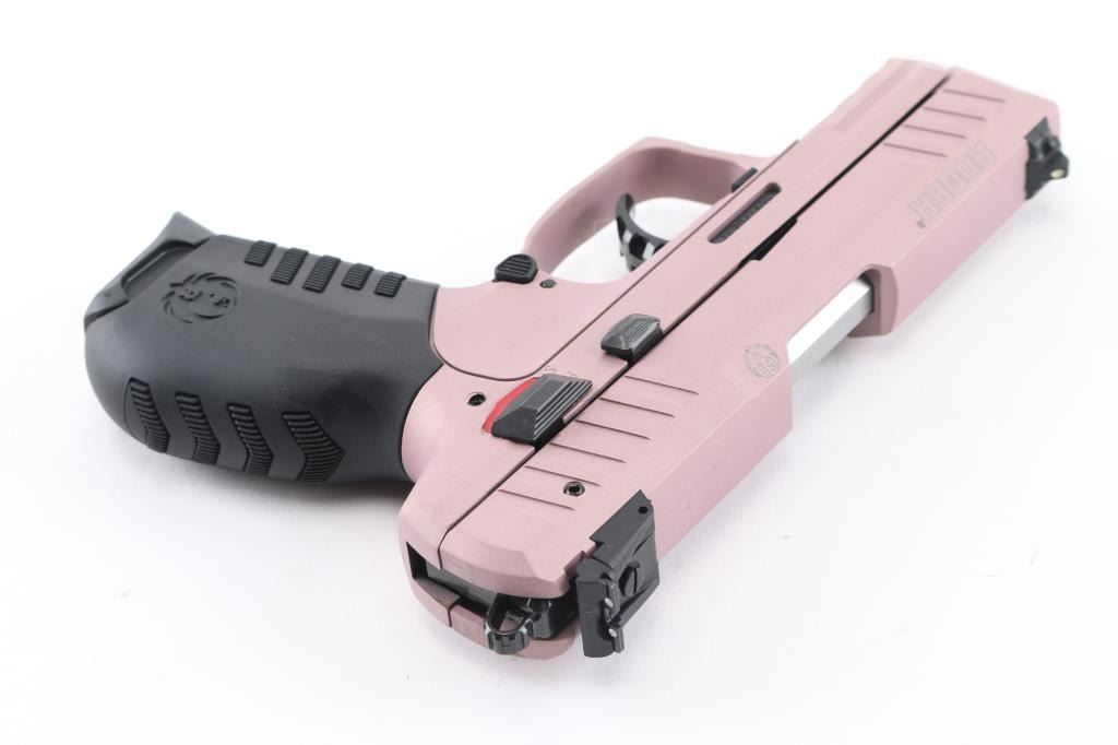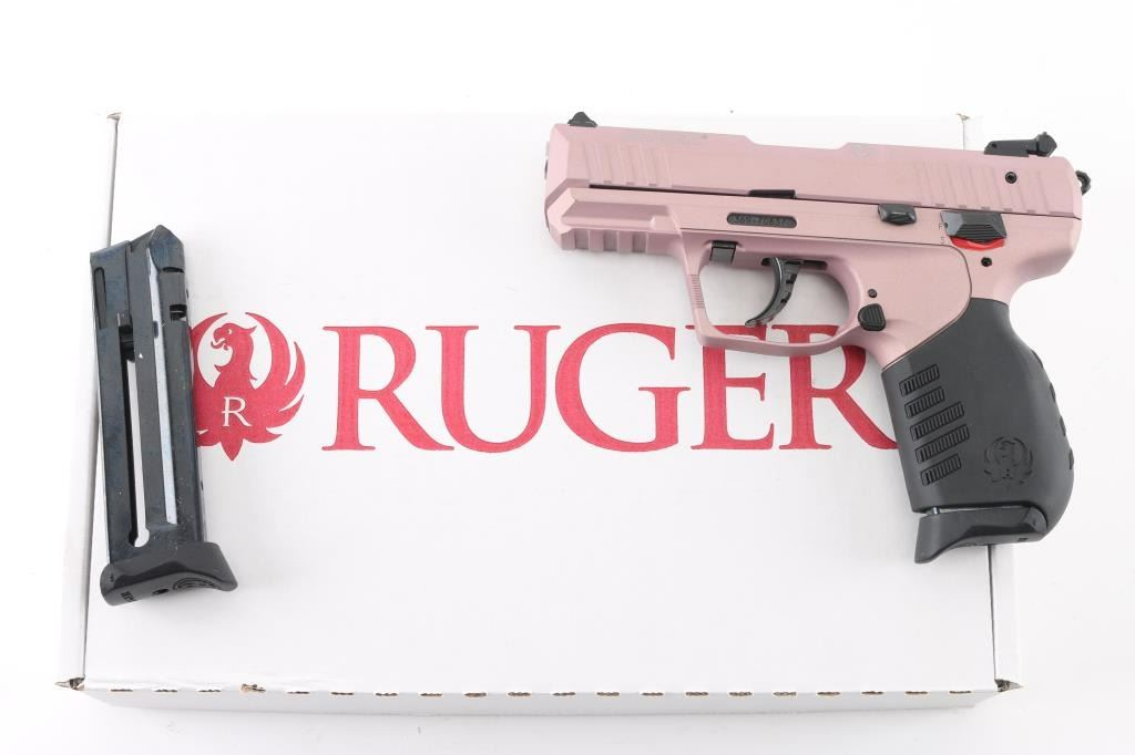 ‘Talo Distributor Exclusive’ Double action semi-automatic compact pistol chambered in .22 Long Rifle, manufactured in Prescott, Arizona circa 2022. Features a Rose Gold cerakote finish, aerospace-grade aluminum slide with fore & aft cocking serrations, 3.5" stainless steel barrel, dovetailed white dot front sight, fully-adjustable two-dot rear sight, ambidextrous frame mounted thumb safety, smooth steel trigger, serrated round hammer spur, ambidextrous push button magazine release, factory 10 round magazine with finger rest floorplate, and polymer frame with integral accessory rail & an interchangeable black rubberized grip. Includes the original factory cardboard box with manual, spare magazines with finger rest floorplates, a slim grip, and two standard floorplates. Condition is like NRA Perfect ***Modern Firearm***