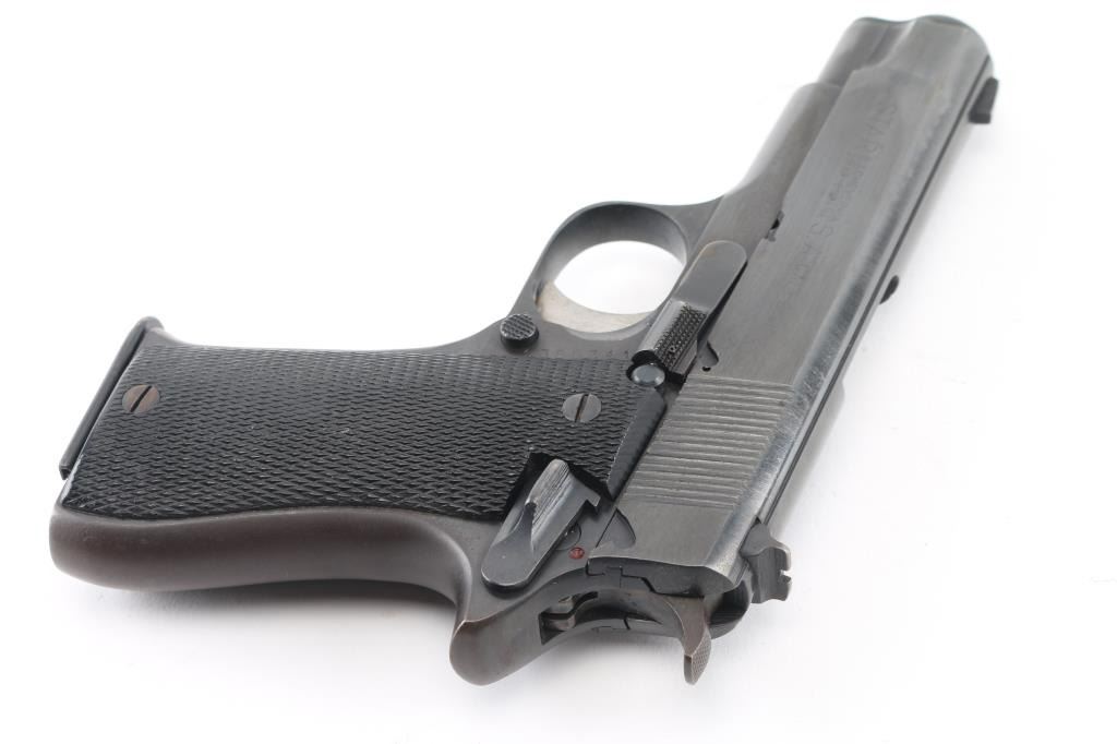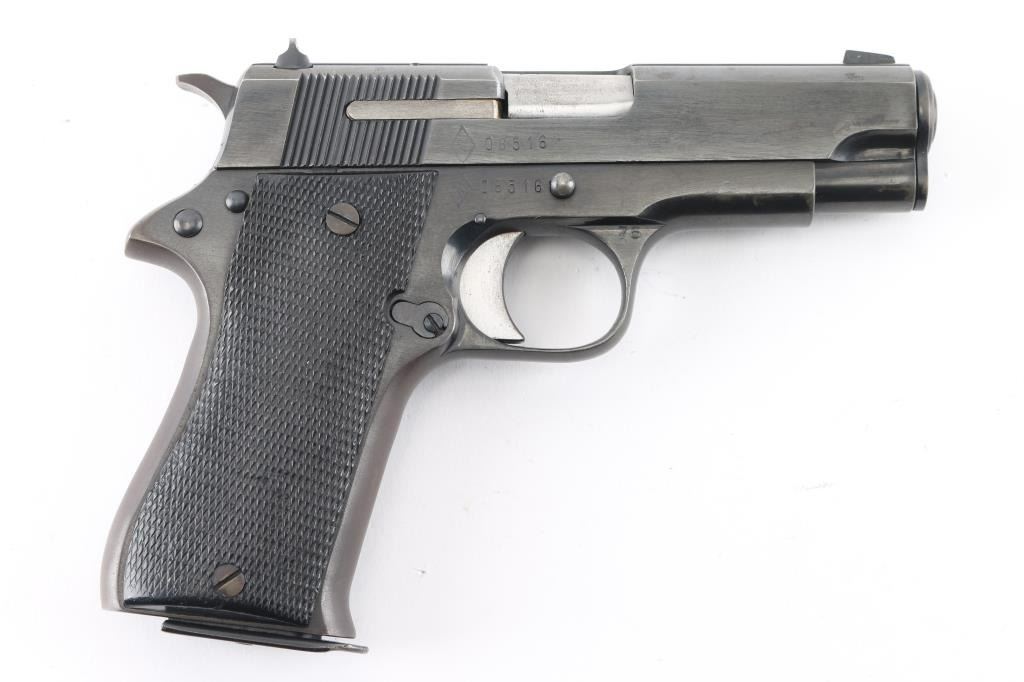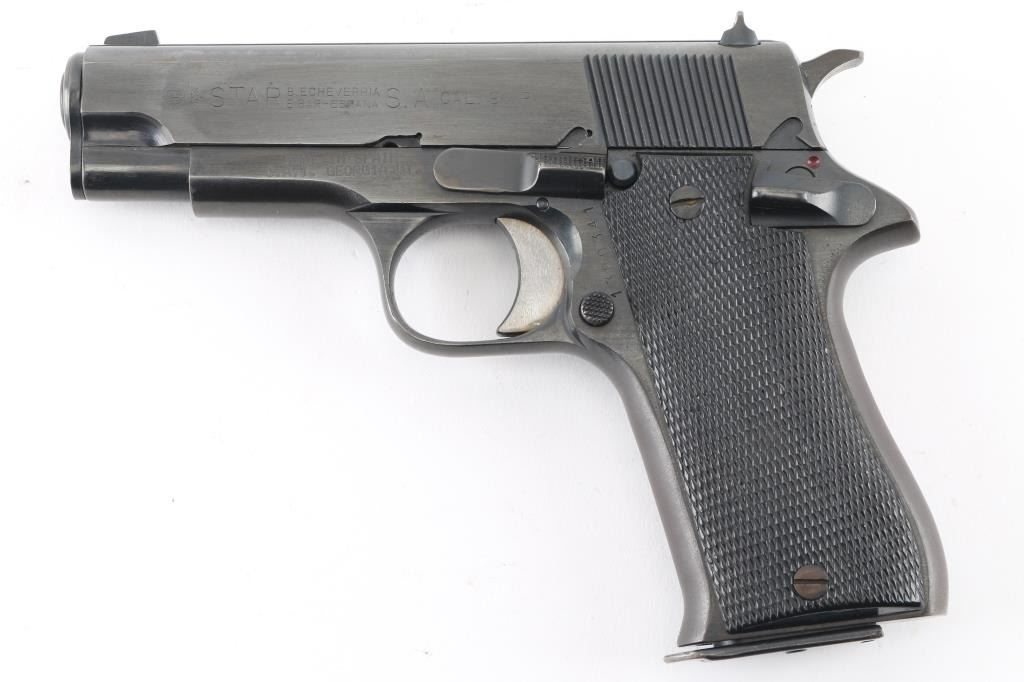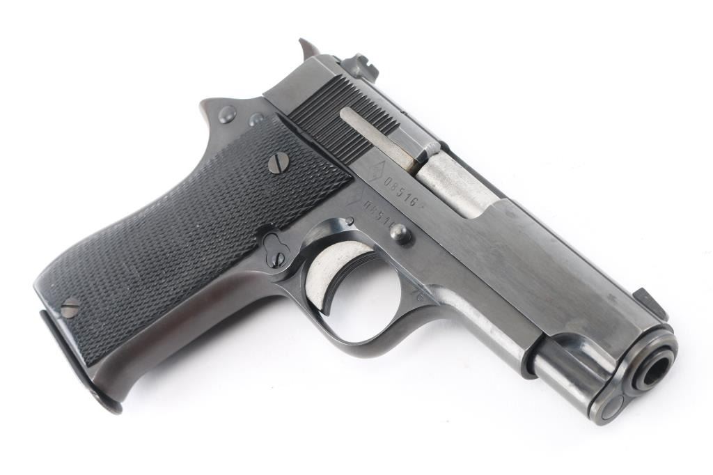 Spanish made single action semi-automatic compact pistol chambered in 9x19mm, manufactured circa 1976. Imported by C.A.I. of Georgia, V.T. with import marks on the left side of the frame. Features a blued finish, 3.75" barrel, full-length steel guide rod, blade front sight, dovetailed rear sight with square notch, serrated trigger, knurled hammer spur, thumb safety on the left side of the frame, push button magazine release, 8 round magazine, steel frame and two-piece checkered black synthetic grips. Bore looks very good. Metal finish looks good but does show some signs of use and handling with some loss of finish in spots around the muzzle. Grips are fine. Condition is NRA Good+ *Modern Firearm*