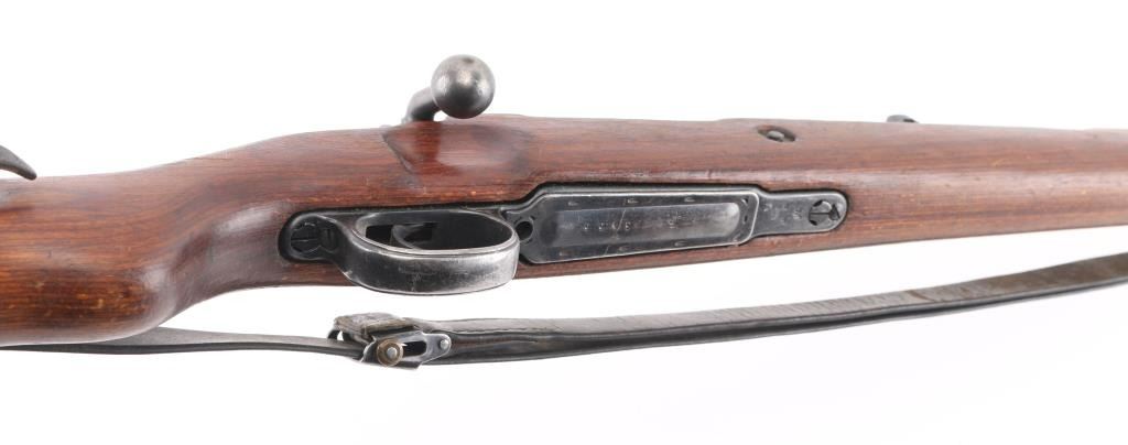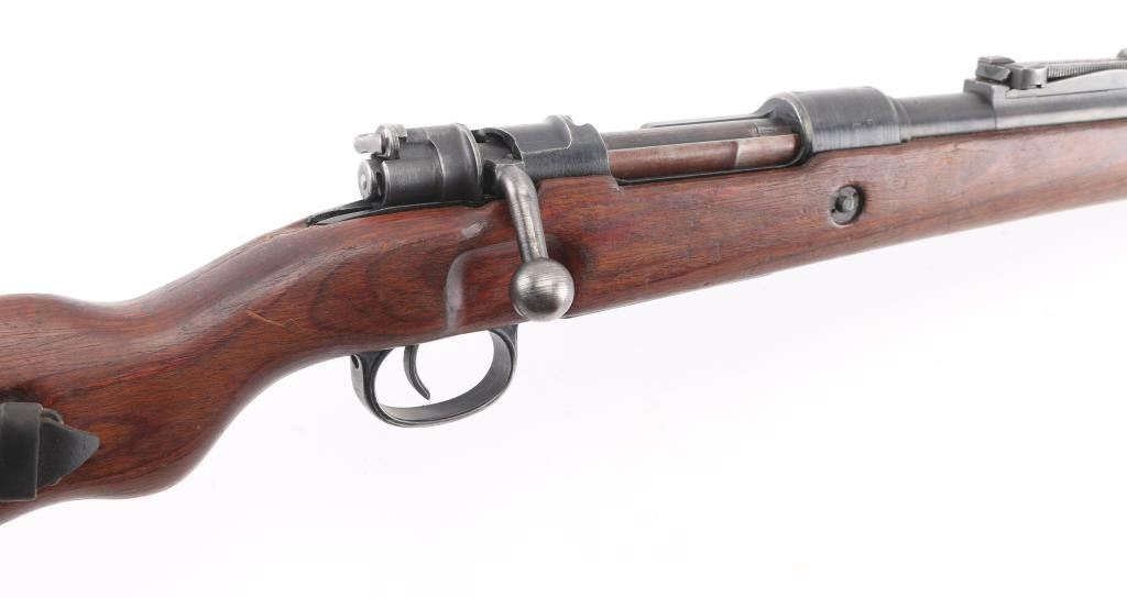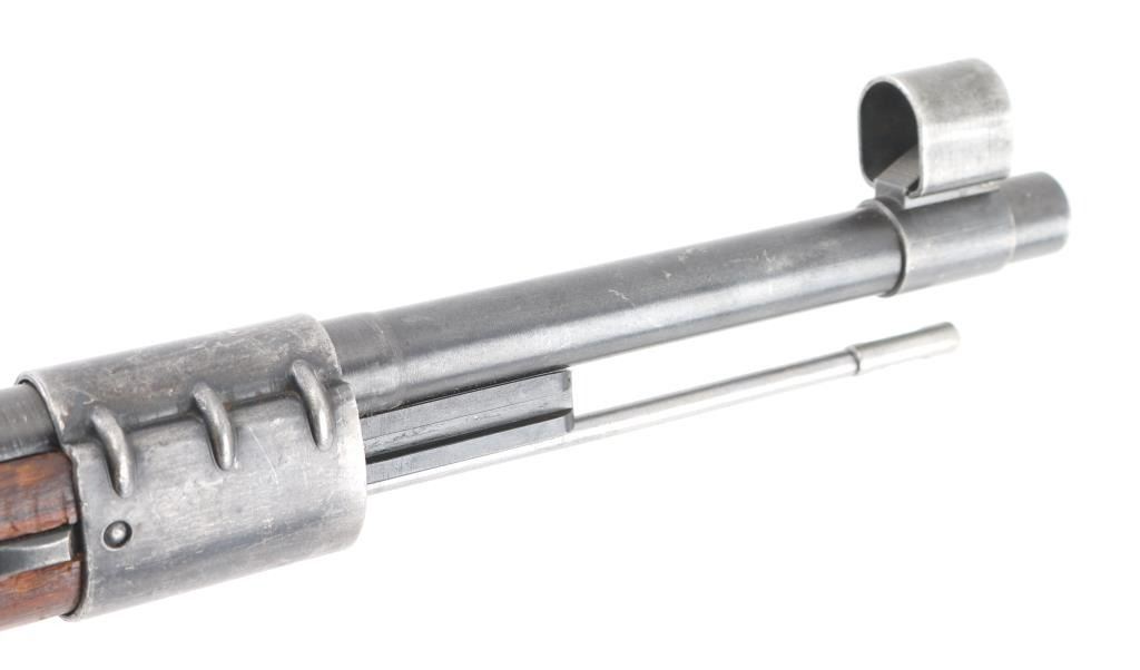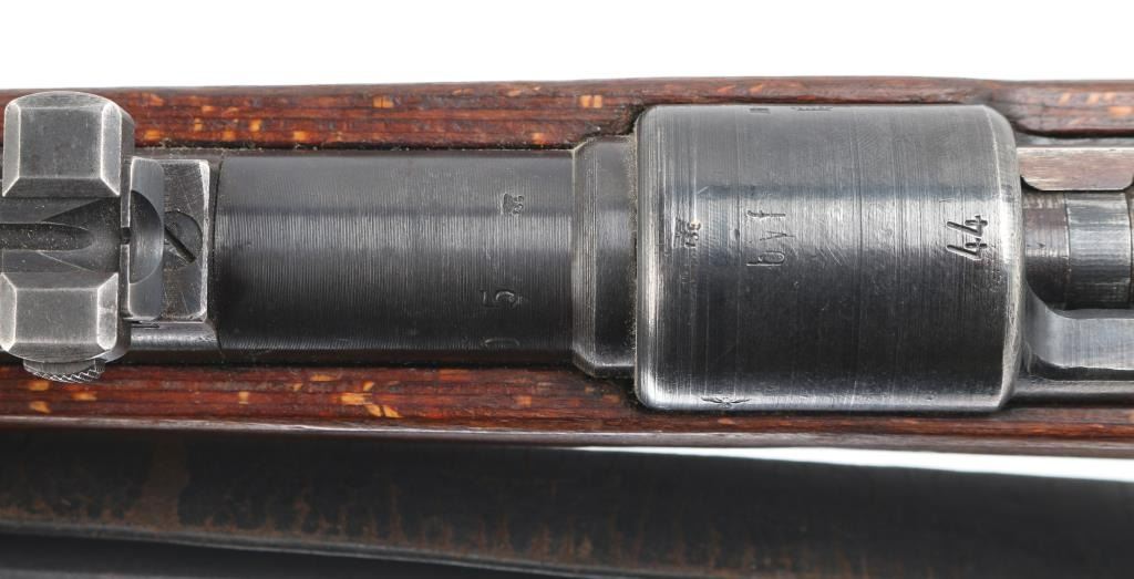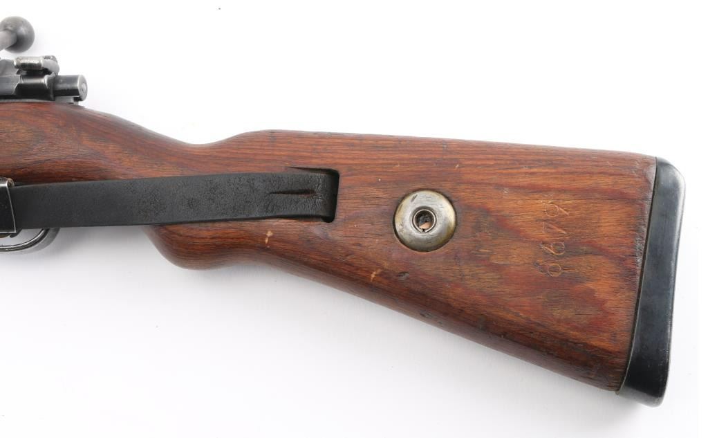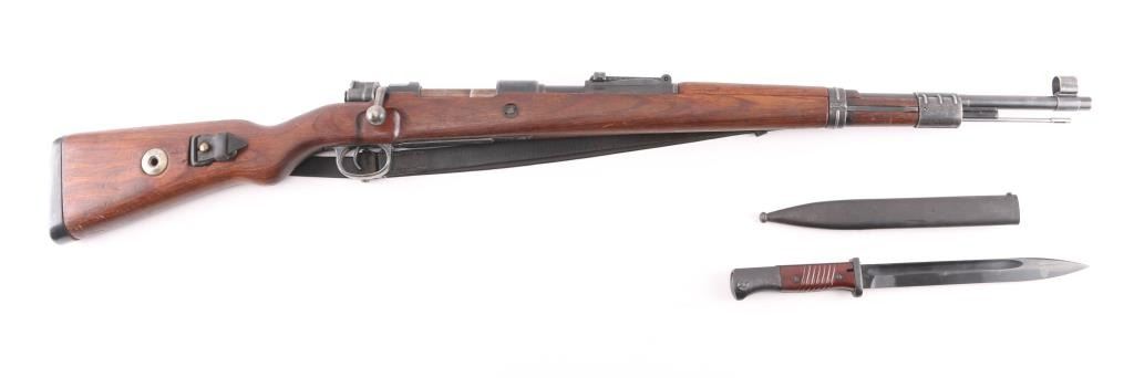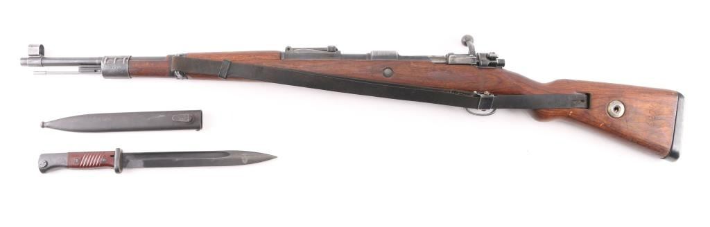 Rifle, Bolt action. German military issue. WW2 era. 1944 dated receiver. byf code. (Mauser, Oberndorf) Blued finish. Wood stock and handguard. 23.62" barrel. Steel cupped blued butt plate. Disassembly bolt in stock. Hooded front sight, Tangent rear, cleaning rod. Correct late was stamped floor plate, and barrel bands. Serial number 3465 matched on receiver, bolt, bolt sleeve, safety latch and both barrel bands. Floorplate is numbered 3455 (Probably done at the factory) Stock is numbered 8679. Eagle/swastika proofs, and waffenamts present, correct Eagle/135. About 75% of finish remaining, with small scratches/rubs present. Handling/edge wear. Wood is good shape, with small dings/dents present. Action is smooth/tight. Bore is very good with strong rifling. No import marks observed. Comes with correct issue sling, and bayonet. Bayonet and scabbard are matched with "5900d", and "44ffc". A nice set.