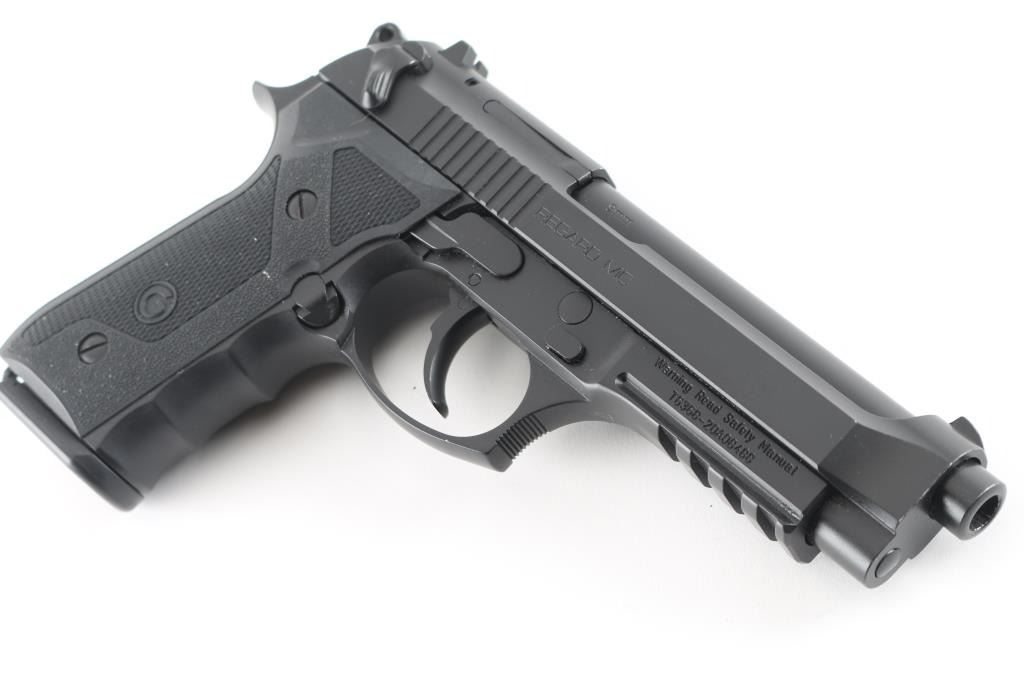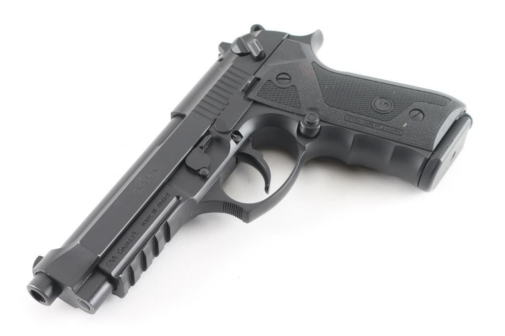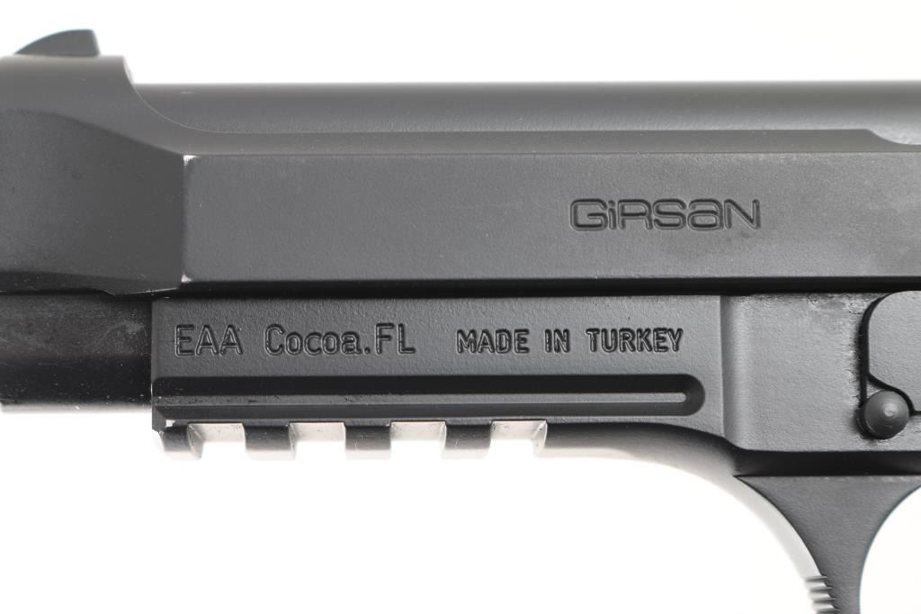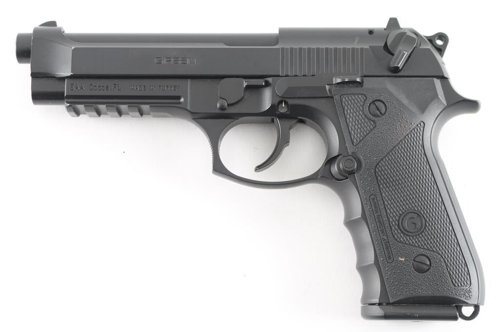 Made in Turkey, imported by EAA in Florida this is a SA/DA Beretta 92 style pistol chambered for 9mm Luger ammunition. It has a 4.9" barrel, white 3 dot sights with a fixed front sight and drift adjustable rear sights. It features an ambidextrous thumb safety/decocker, accessory rail, textured black polymer grip panels and lanyard loop. Metal finish looks good with very minor signs of handling. Bore looks good, dusty. Frame and grips look good. Comes with one 18 round magazine. Condition is NRA Very Good *Modern Firearm*
