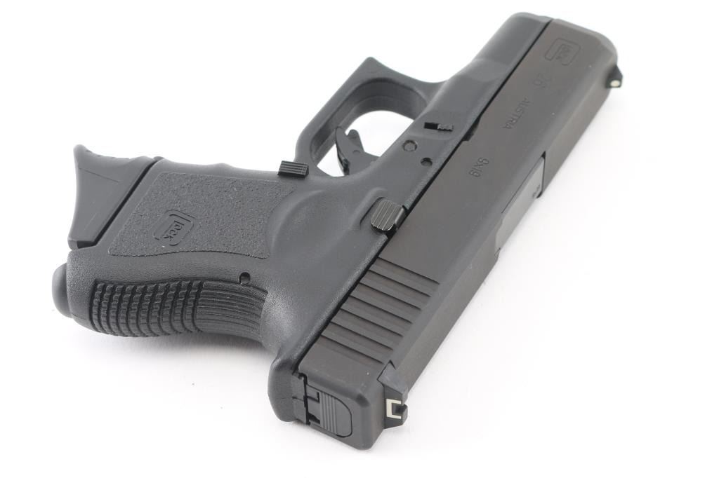 Austrian made semi-auto pistol chambered for 9x19mm ammunition. Metal finish is black and features a 3.25" barrel, polymer frame with textured finger groove grip, and serrated backstrap. Front dot sight, rear sight is outline. Comes with one 10 round magazine with extended floor plate for better grip. Bore looks great. Metal finish and frame/grip looks great. Condition is NRA Excellent. *Modern Firearm*