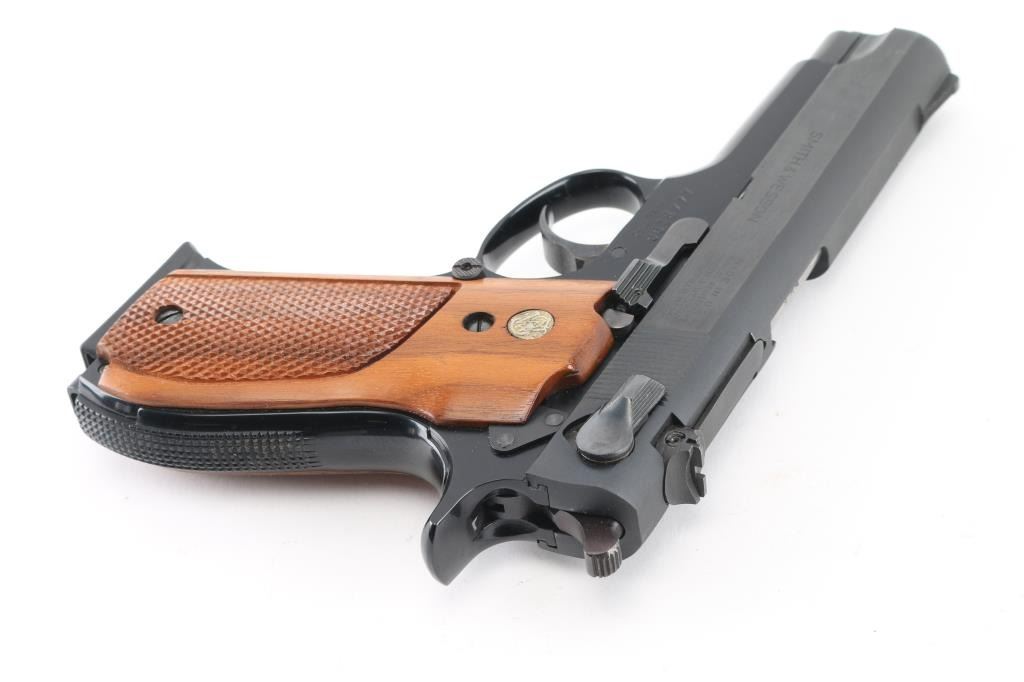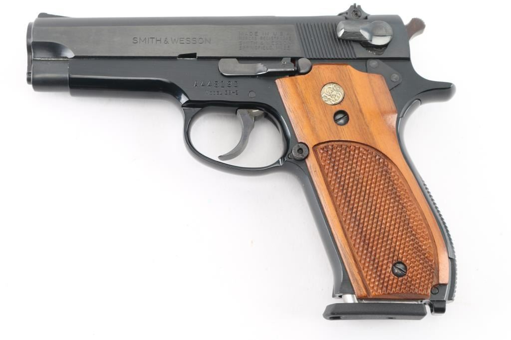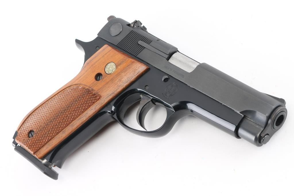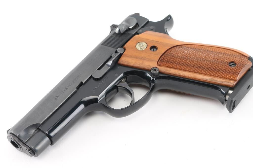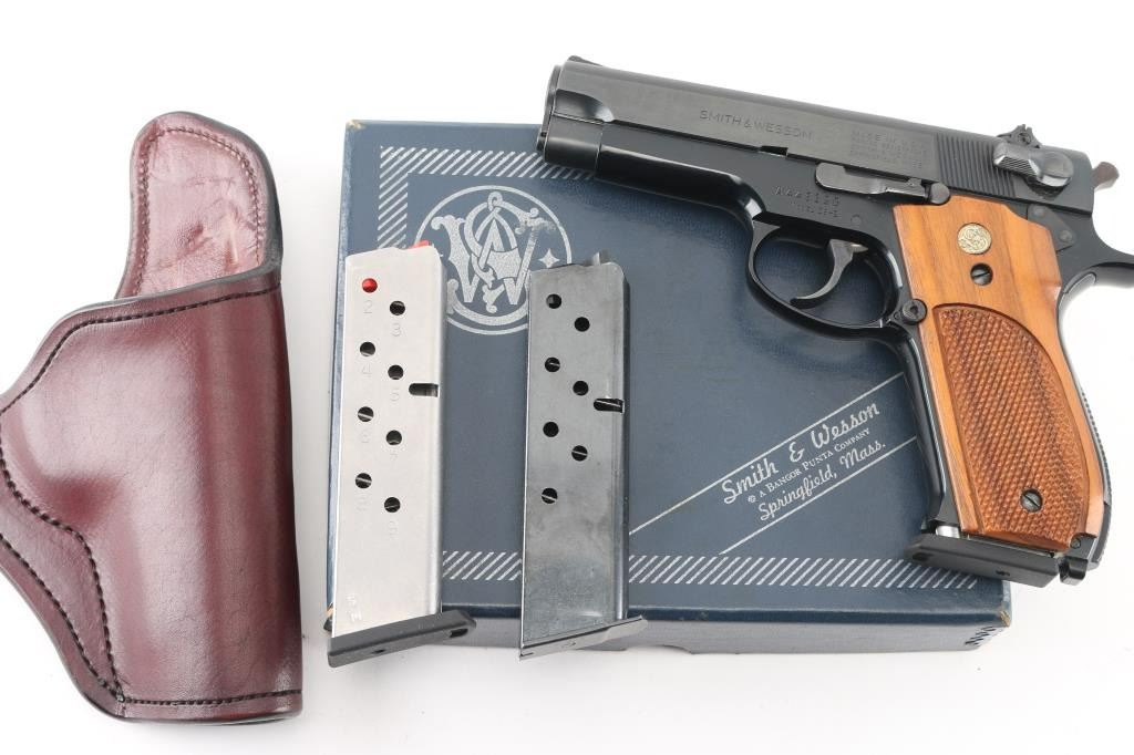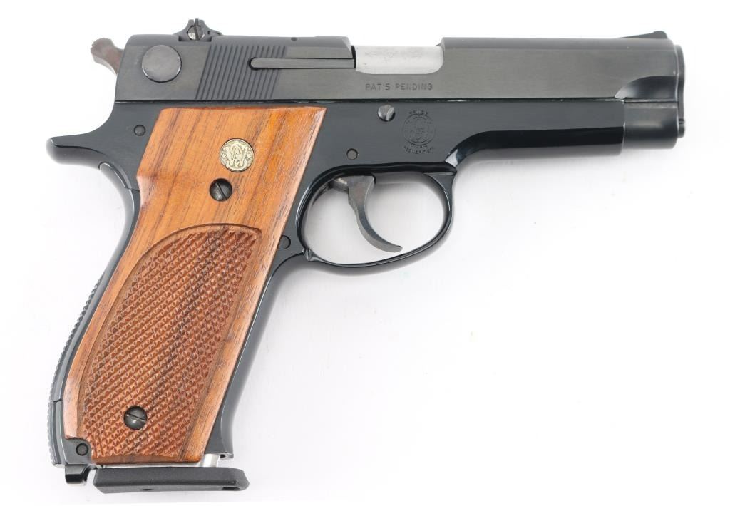 American made double action semi-automatic pistol chambered in 9x19mm, manufactured circa 1971-1982. The model 39 was the first double action semi-automatic 9mm pistol manufactured in the United States. Features a blued carbon steel slide, 4" barrel, full-length steel guide rod, serrated ramp front sight, windage adjustable rear sight, smooth wide trigger, serrated round hammer spur, thumb safety/decocking lever on the left side of the slide, magazine disconnect safety, push button magazine release, factory 8 round magazine, black finished alloy frame, knurled alloy backstrap w/ lanyard loop and two-piece checkered walnut grips with S&W medallions. Bore is excellent. Finish is excellent. Grips are excellent. Includes the original factory two-piece blue cardboard box with parchment paper, and two spare magazines. Also included is a brown leather holster made by M.J. Brown, Laveen, AZ. NRA Condition-Perfect in Box. Modern Firearm.