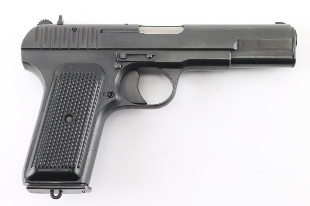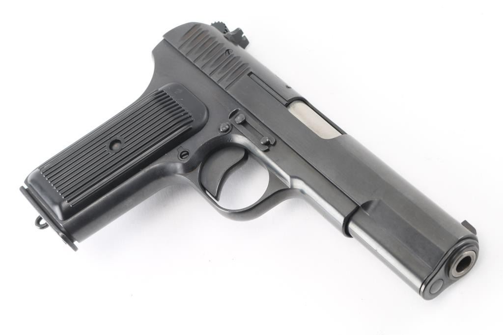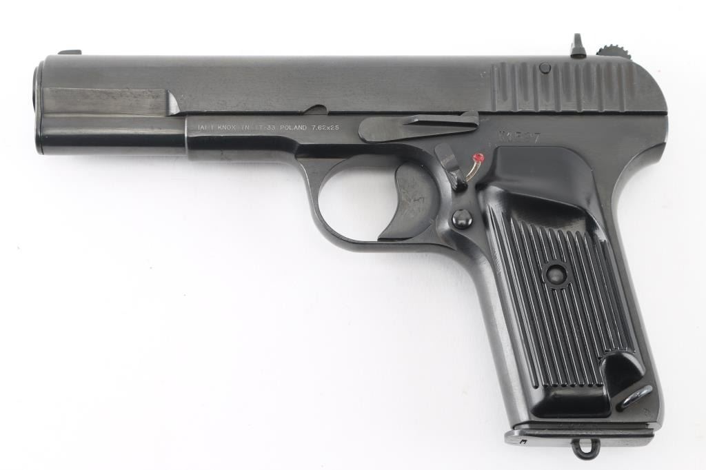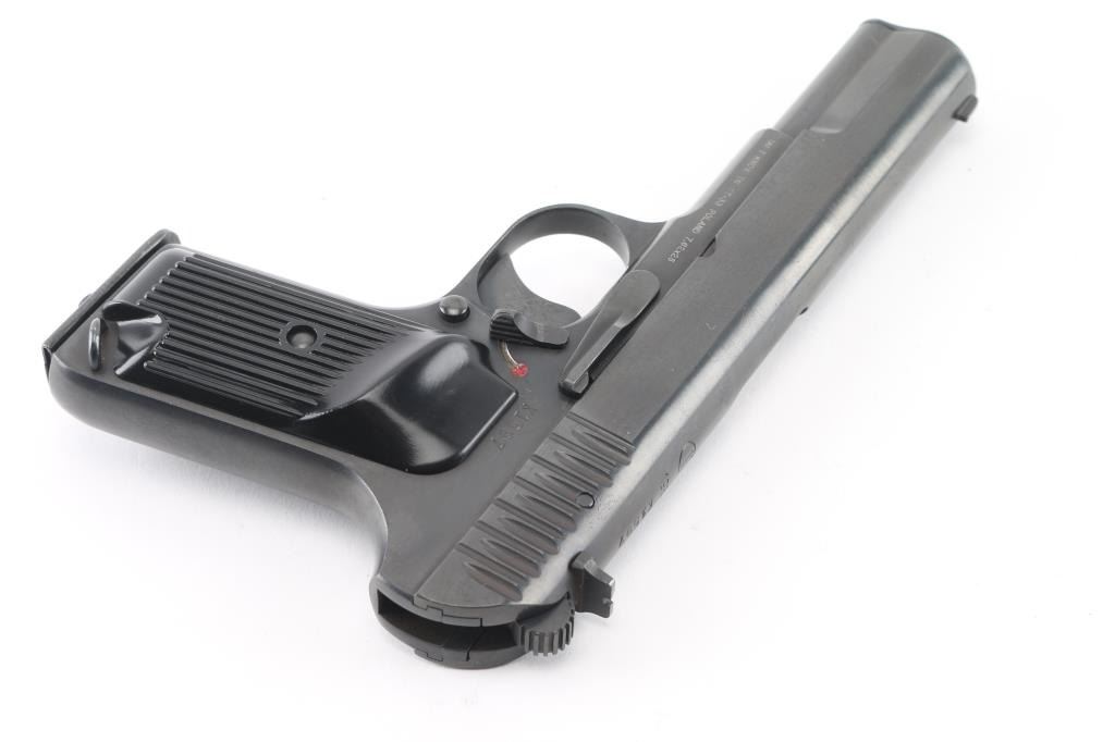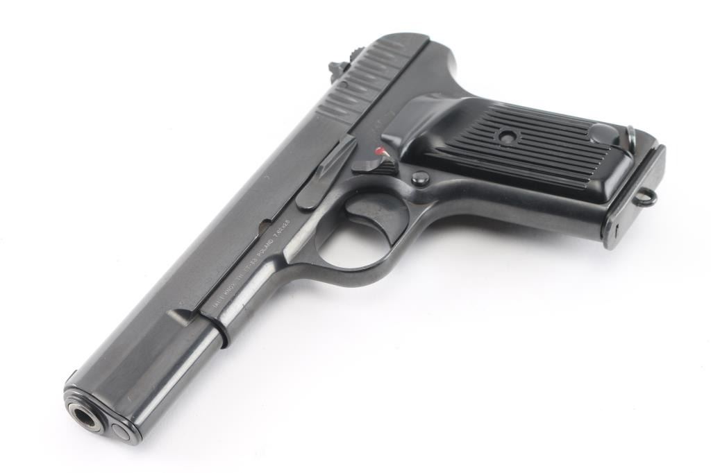 Pistol, Semi-automatic. Single-action. 8+1 capacity. Polish version of the Russian TT-33. 1950 dated. Manufactured at the Radom factory. 11 in a circle on top of the slide. A frame mounted thumb safety has been added to make these pistols legal to import. Short recoil actuated. locked breech single action. 7.6" overall, with a 4.6" barrel. Front blade, rear notch , fixed sights. lanyard ring. Imported by IAI Knoxville, TN. and marked on the left frame along with TT-33 Poland 7.62x25. Blued metal finish, with black,plastic, lined grips. Comes with one magazine. Bore looks very good, a little dusty. Metal finish looks great. Grips are fine. Condition is NRA Excellent. *C&R Firearm*