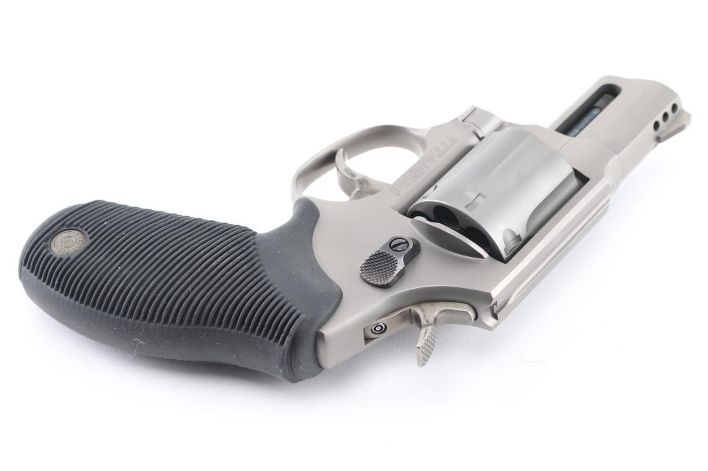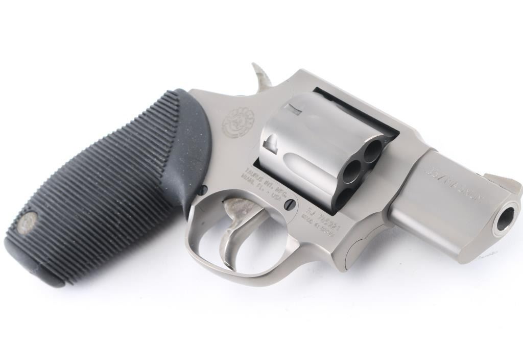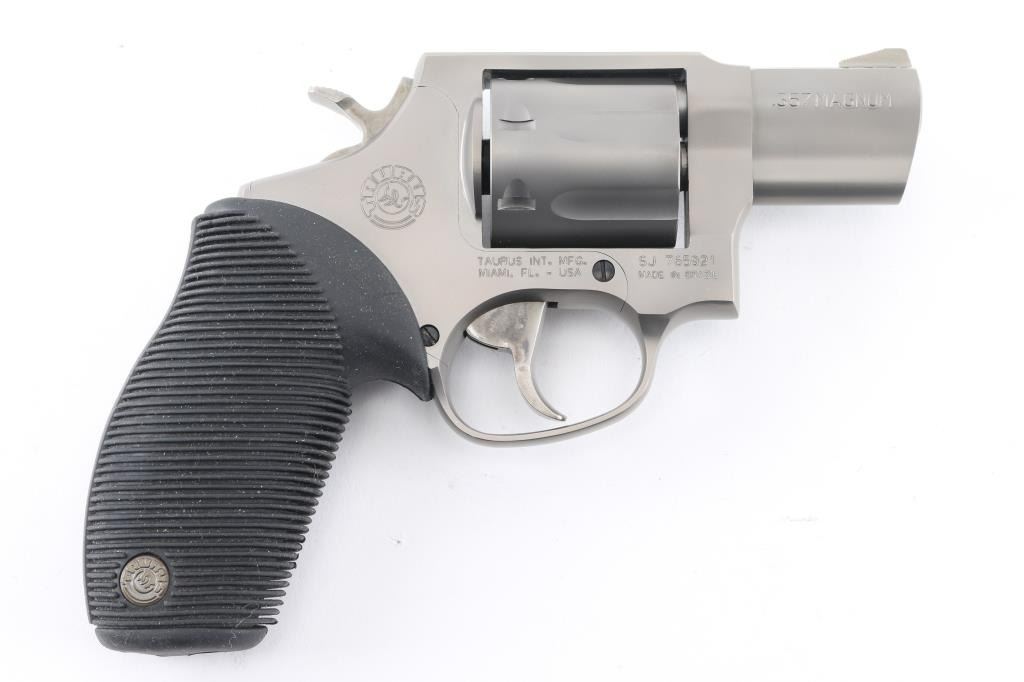 Light weight 7 shot revolver, made in Brazil and chambered for 357 Magnum ammunition. Features 2 inch ported barrel, fixed ramp front sight, notch rear sight, double and single action operation, black rubber Taurus logo grips with horizontal grooves, smooth trigger, knurled hammer spur, safety lock in hammer (requires key - not included). Finished overall in a matte metallic gun metal grey. Bore and cylinders look great. Metal finish looks great. Grips are fine. Condition is NRA Excellent. *Modern Firearm*