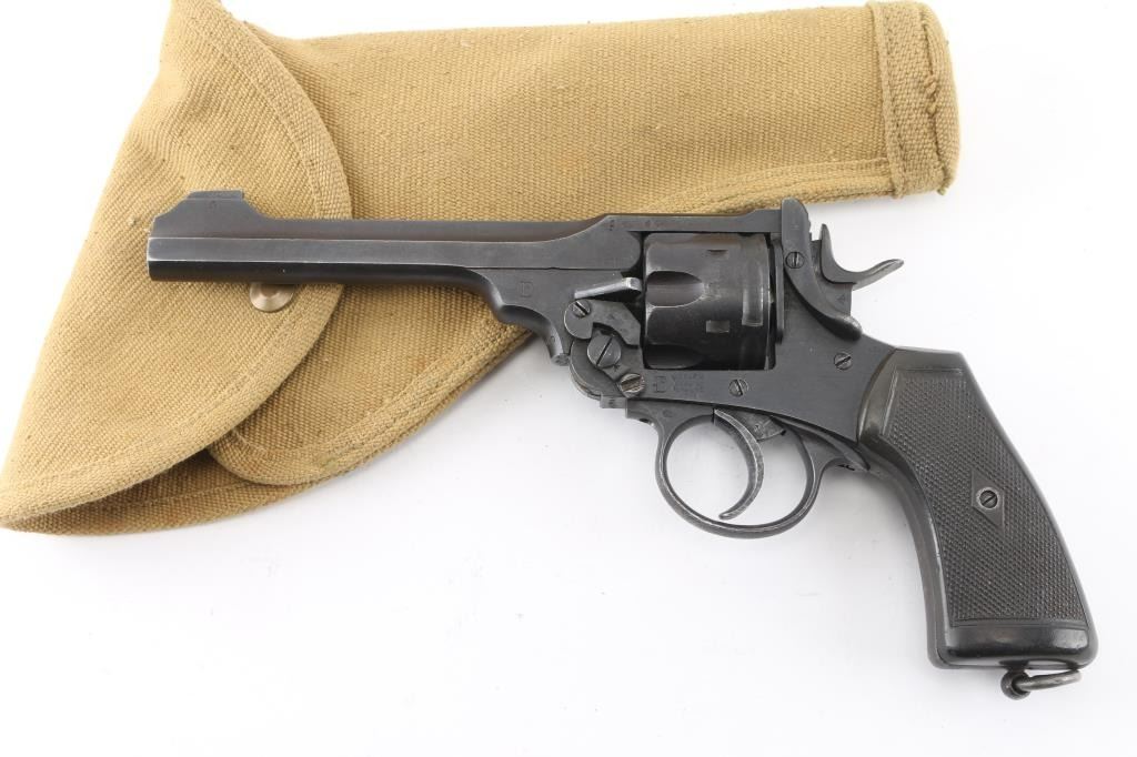 'Shaved Cylinder' British WWI era military revolver features 6" slab sided barrel, fixed front sight with pinned blade insert, notch rear sight on top latch, 6 shot fluted cylinder (appears cut at rear to allow use of 45 Auto Rim cartridges or 45 ACP in clips - more powerful than the original cartridge and hard on this revolver's action), break top style opening for loading and unloading, double/single action operation, fixed sights, square butt grip frame, checkered black plastic or hard rubber grips, lanyard ring on butt. Bore and charge holes are very good condition. Retains 80% matte finish. overall dark gray colored with areas of light patina, edges losses & handling marks. Grips are very good condition, no visible chips or cracks. Action operates smoothly, with good lock-up. Extractor star snaps back into place when fully opened. Markings are generally sharp & readable, include 1918 patent date, nitro proof marks. Numbers match on frame & barrel, and cylinder. Comes in correct tan canvass flap holster, with cleaning rod. Condition is NRA Very Good C&R Firearm.