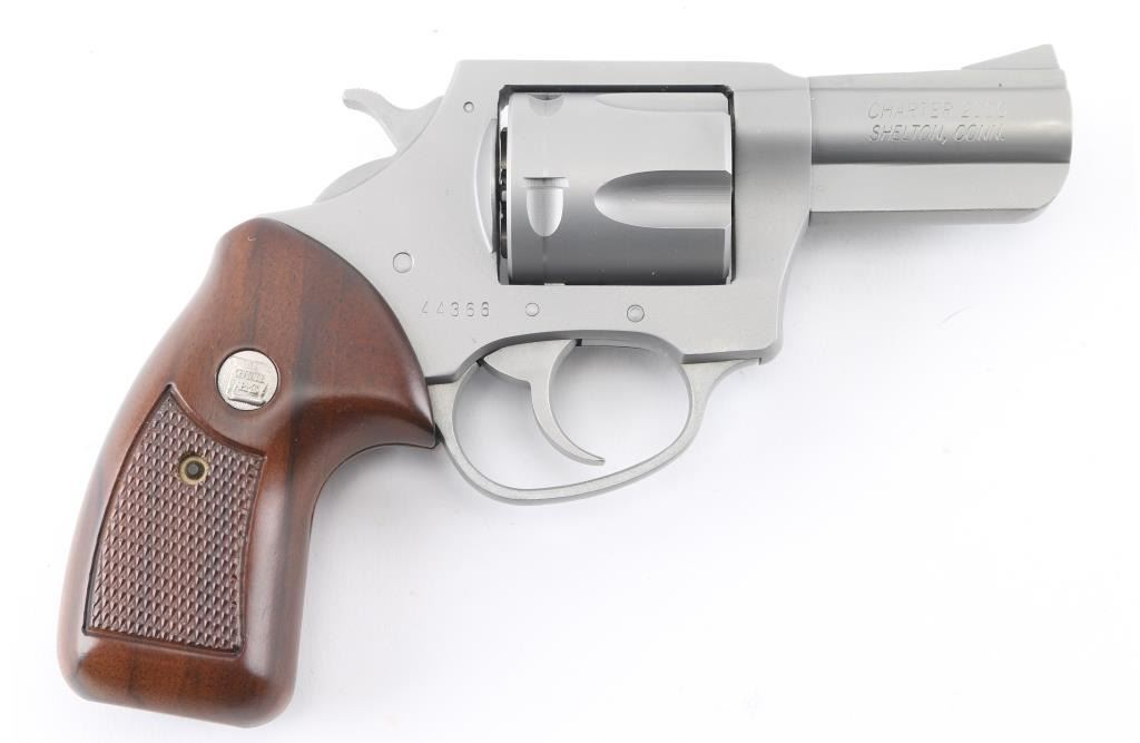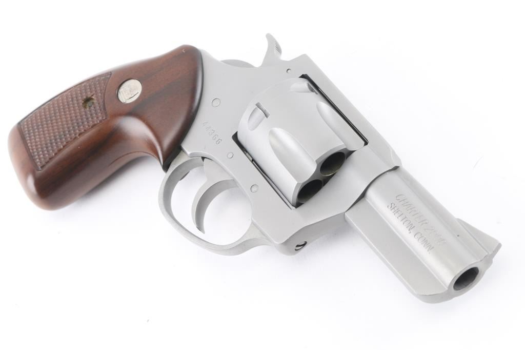 This is a 5 shot revolver with a matte finish from Charter 2000. It as a 2.4" barrel, serrated cylinder release, serrated hammer spur, smooth trigger, full under lug, fluted cylinder and center checkered wood grips with Charter Arms medallion above checkering. Metal finish and grips look very good, with slight drag line on cylinder. Bore and cylinders look good but need cleaned. Condition is NRA Very Good. *Modern Firearm*
